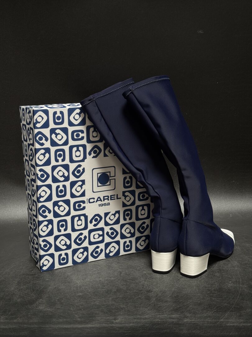 CAREL - Paire de bottes souples marine, bout et talon cuir blanc verni. Dans leur boite. Pointure 37,5 - Haut. Du talon : 4,5 cm Etat magasin