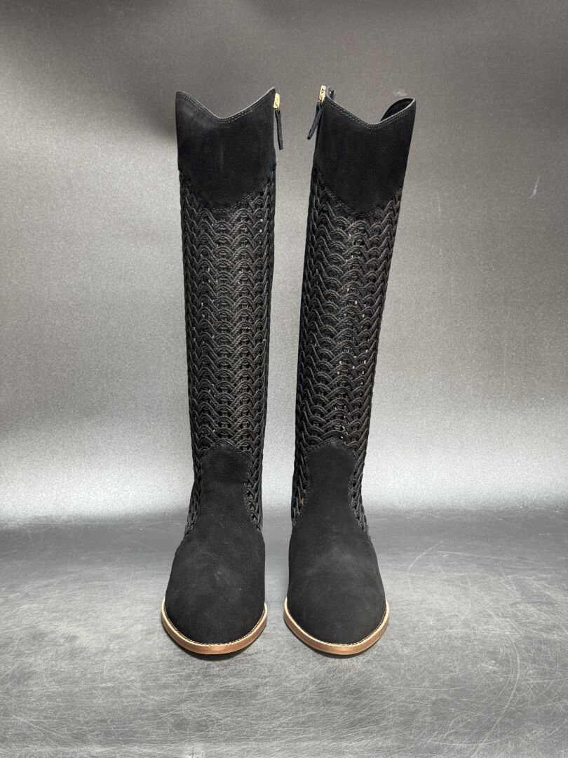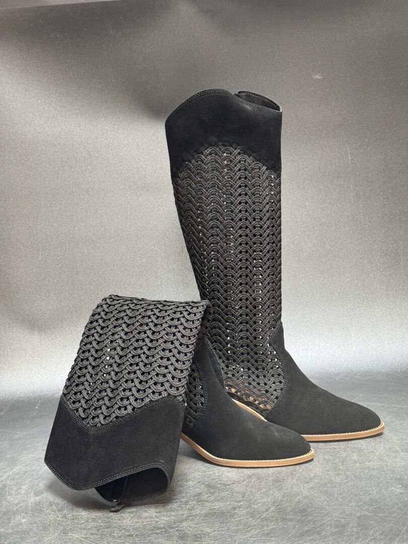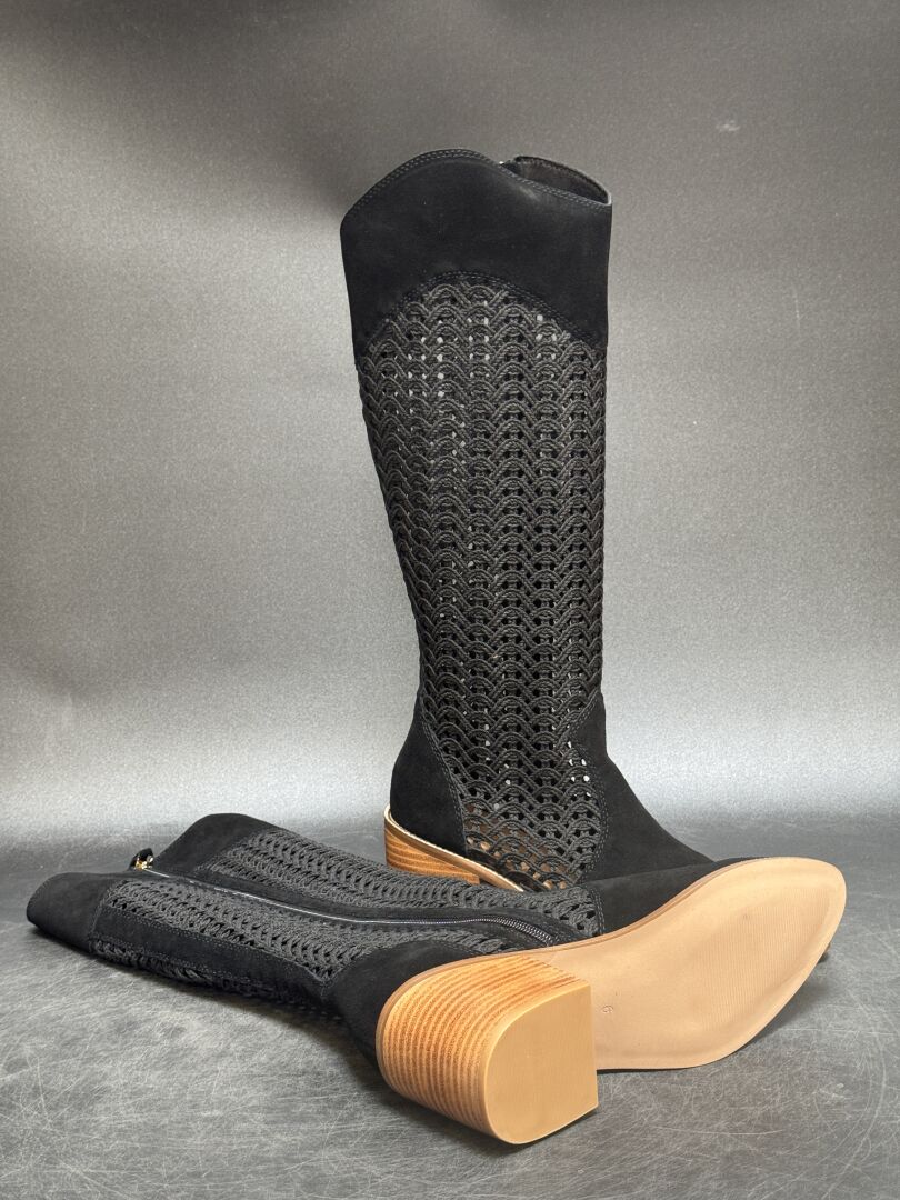 KELSI DAGGER - Paire de bottes à talon en cuir velours noir, effet de transparence, zip latéral. Pointure 39 - Haut. Du talon : 7,5 cm Etat magasin
