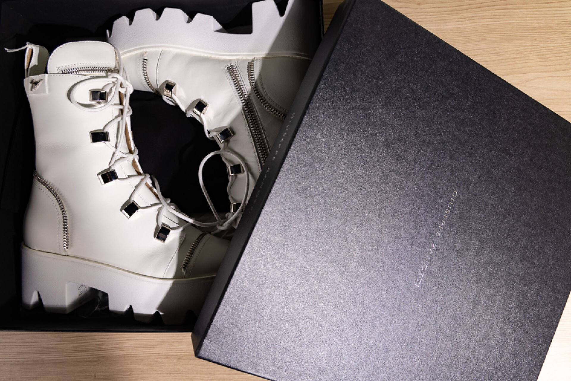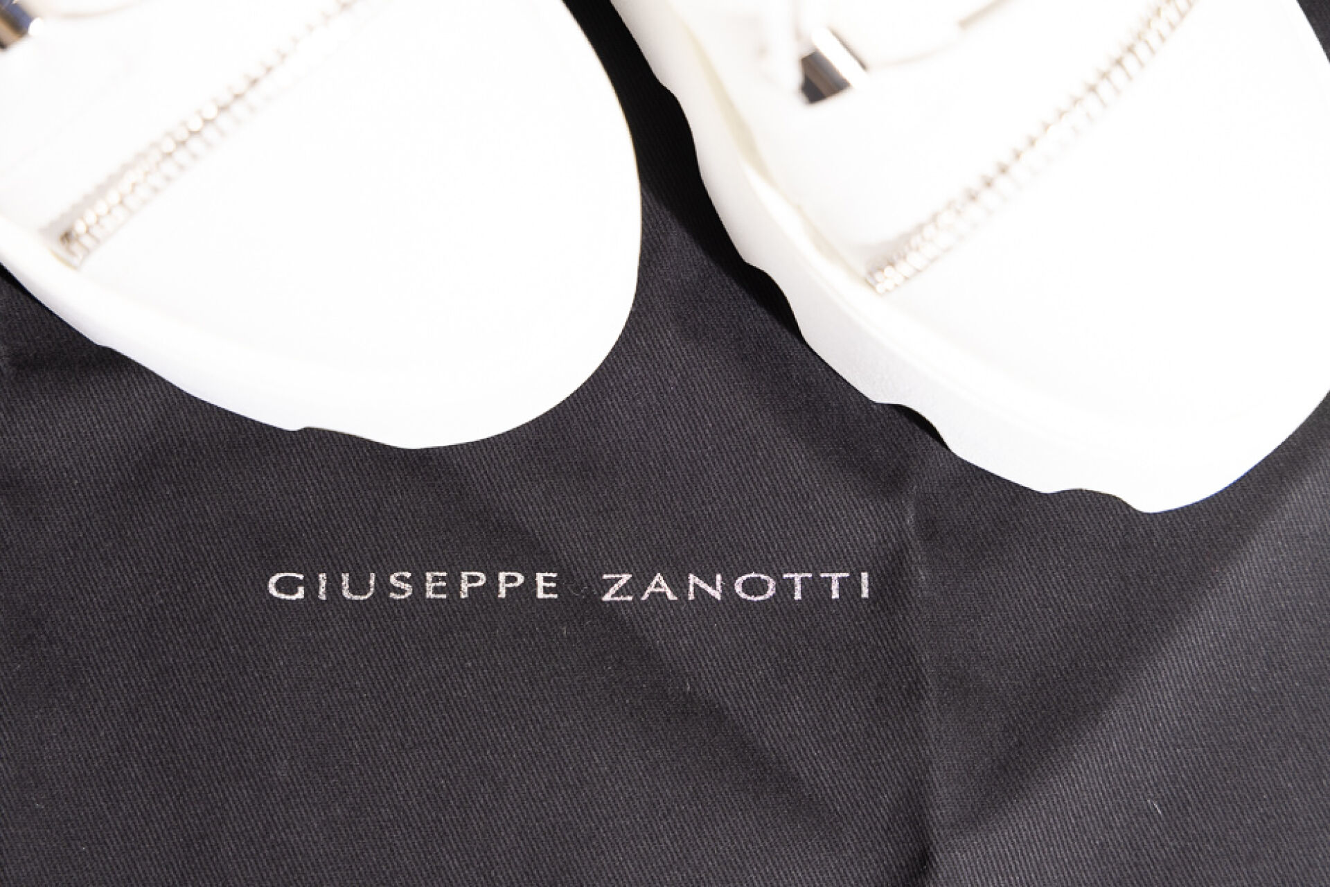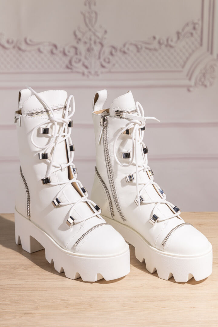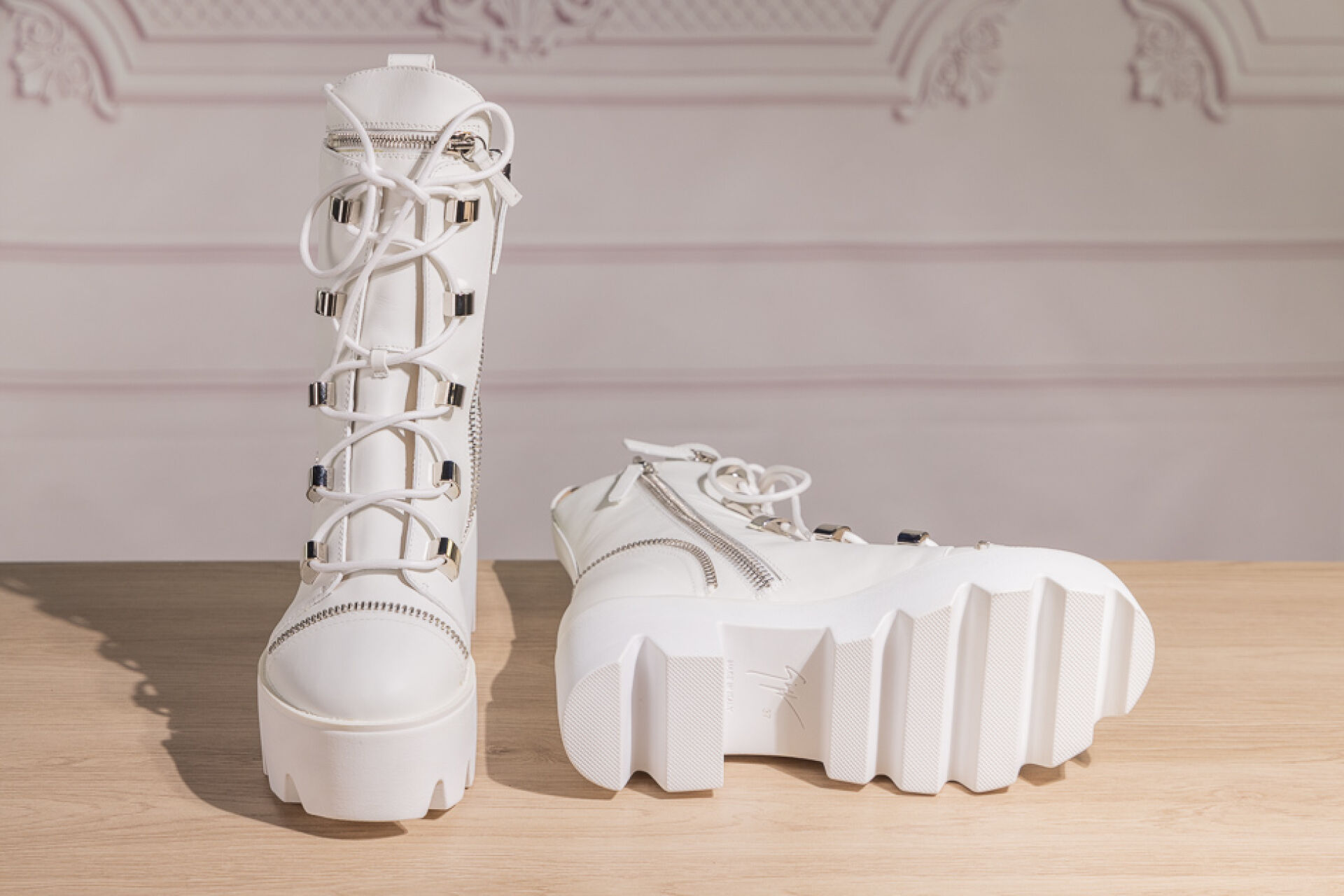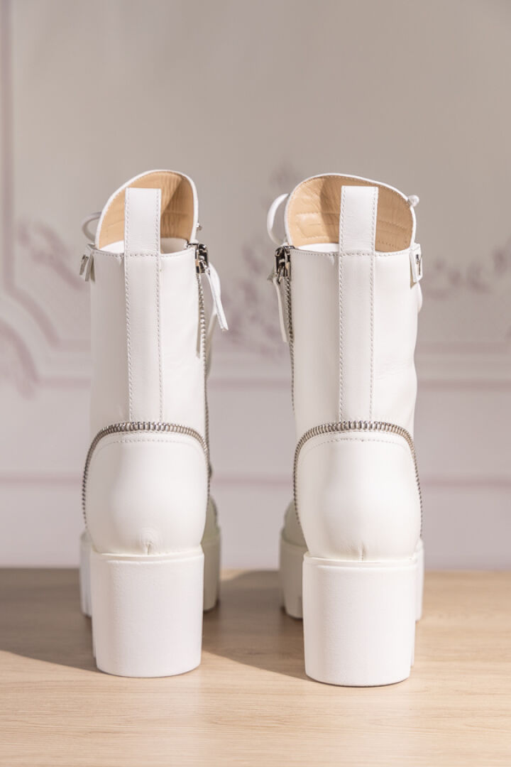 GUISEPPE ZANOTTI. Paire de boots Daiquiri en cuir blanc rehaussé de zips, lacets, semelle compensée de 4cm crantée. Pointure 37. Non portées, très bon état, dans leur boite.