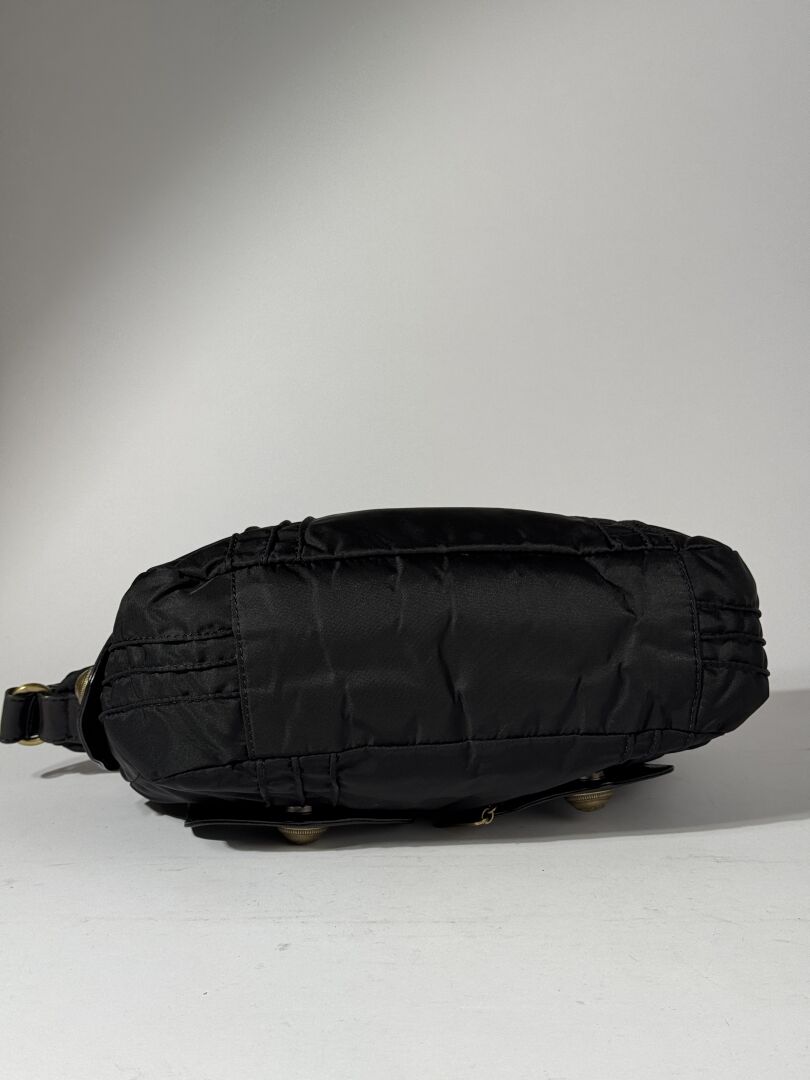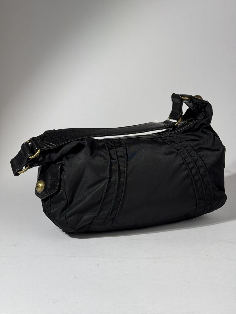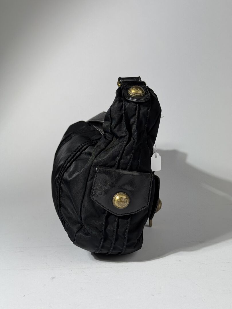 SONIA RYKIEL - Sac porté épaule, toile enduite et cuir noir, deux poches sous rabat aimanté siglé devant, fermeture à glissière, petite anse. Haut. : 18 cm - Long. : 28 cm (bon état)