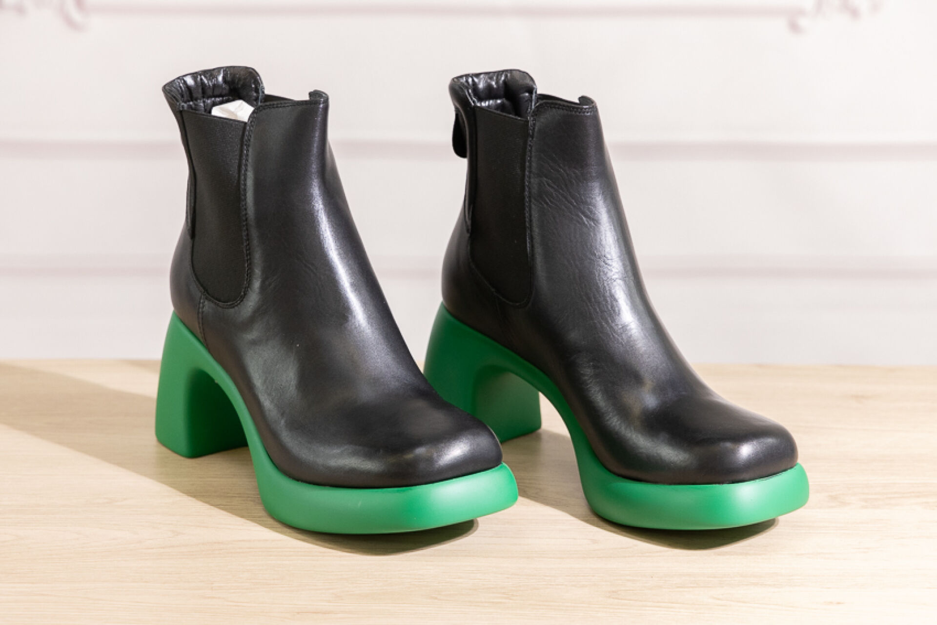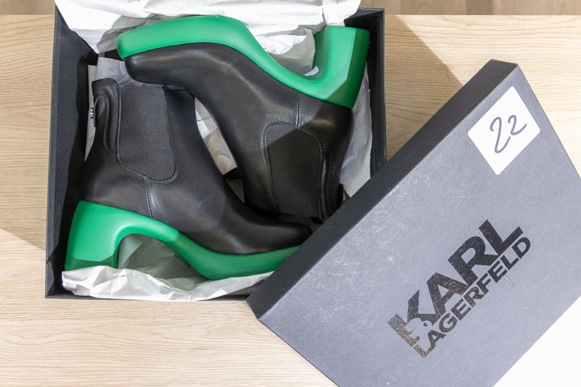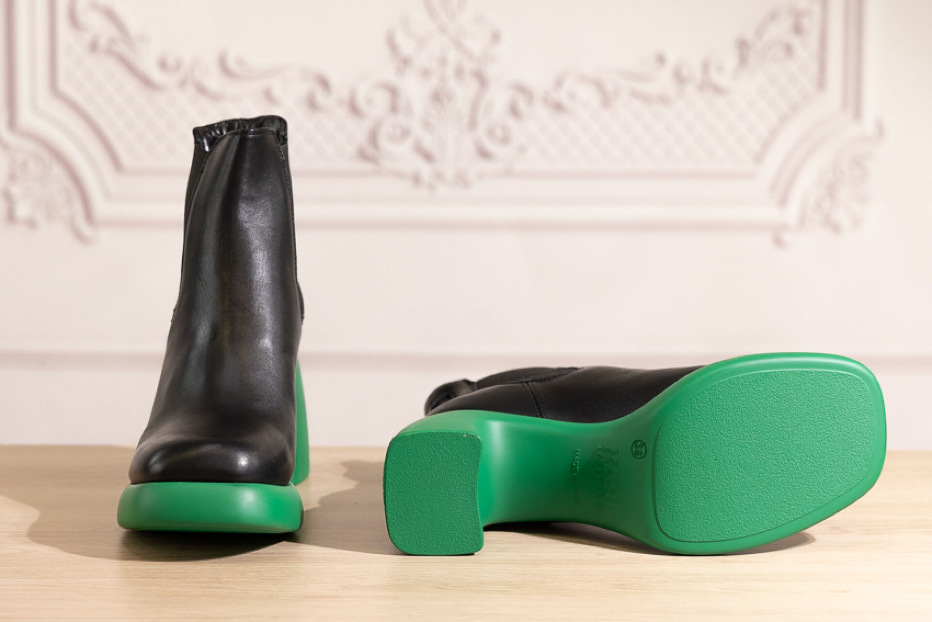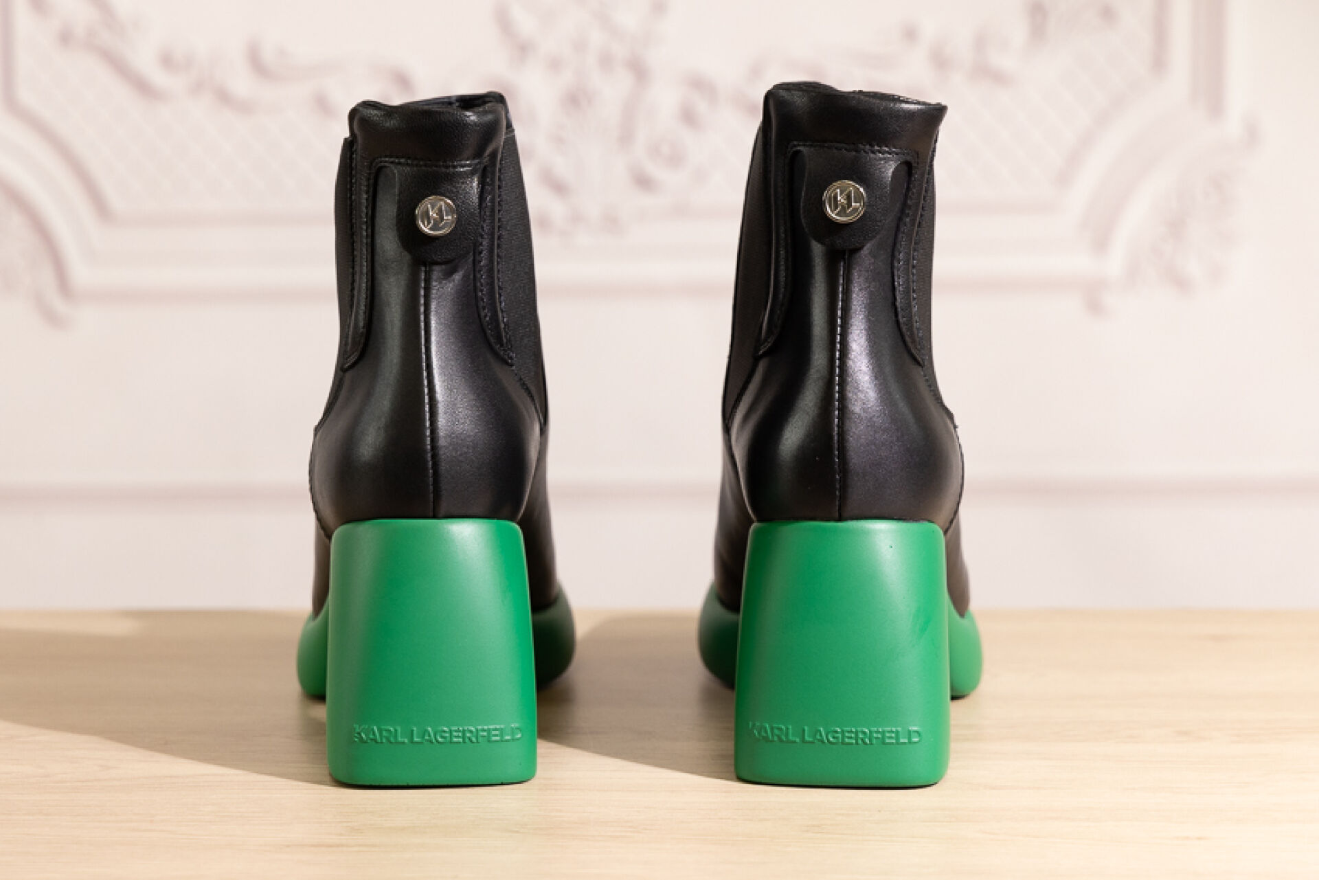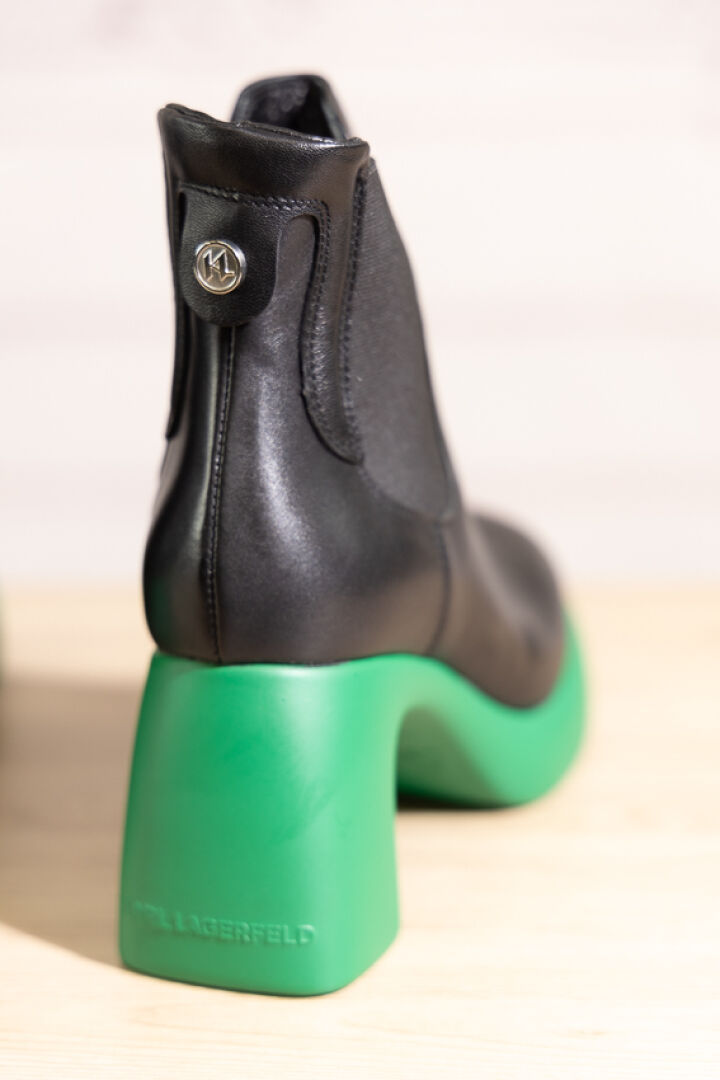 KARL LAGERFELD. Paire de boots Astragon en cuir noir et semelle caoutchouc verte. Pointure 38. Non portée, dans leur boite.