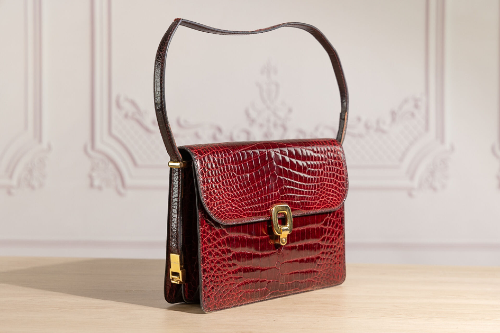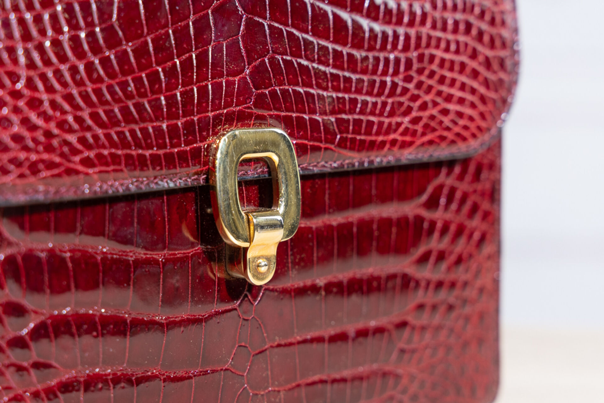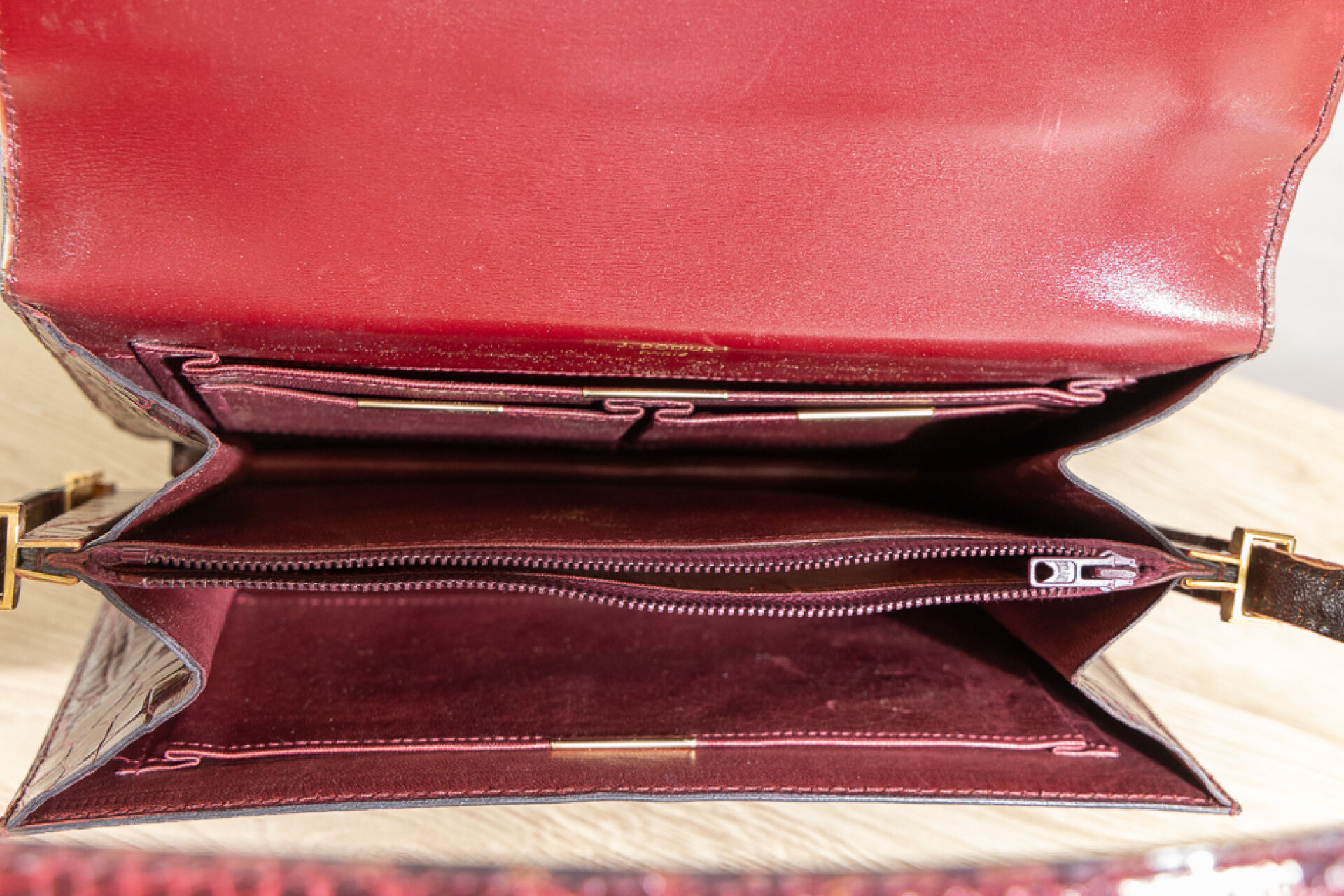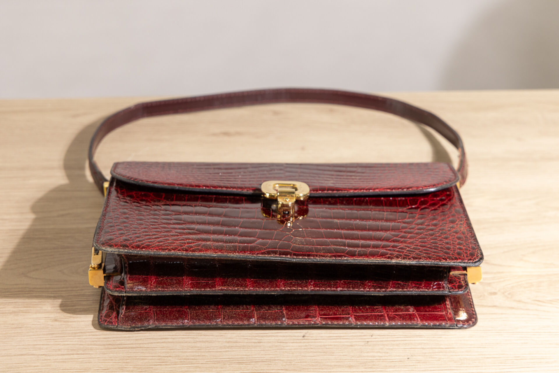 DODIUK - Sac enveloppe en cuir bordeaux façon croco, fermoir en métal doré sur rabat, deux compartiments intérieur, doublure en cuir bordeaux, anse. État d'usage, frottements et fragilité sur l'anse. Dim. : H18 x L25 cm