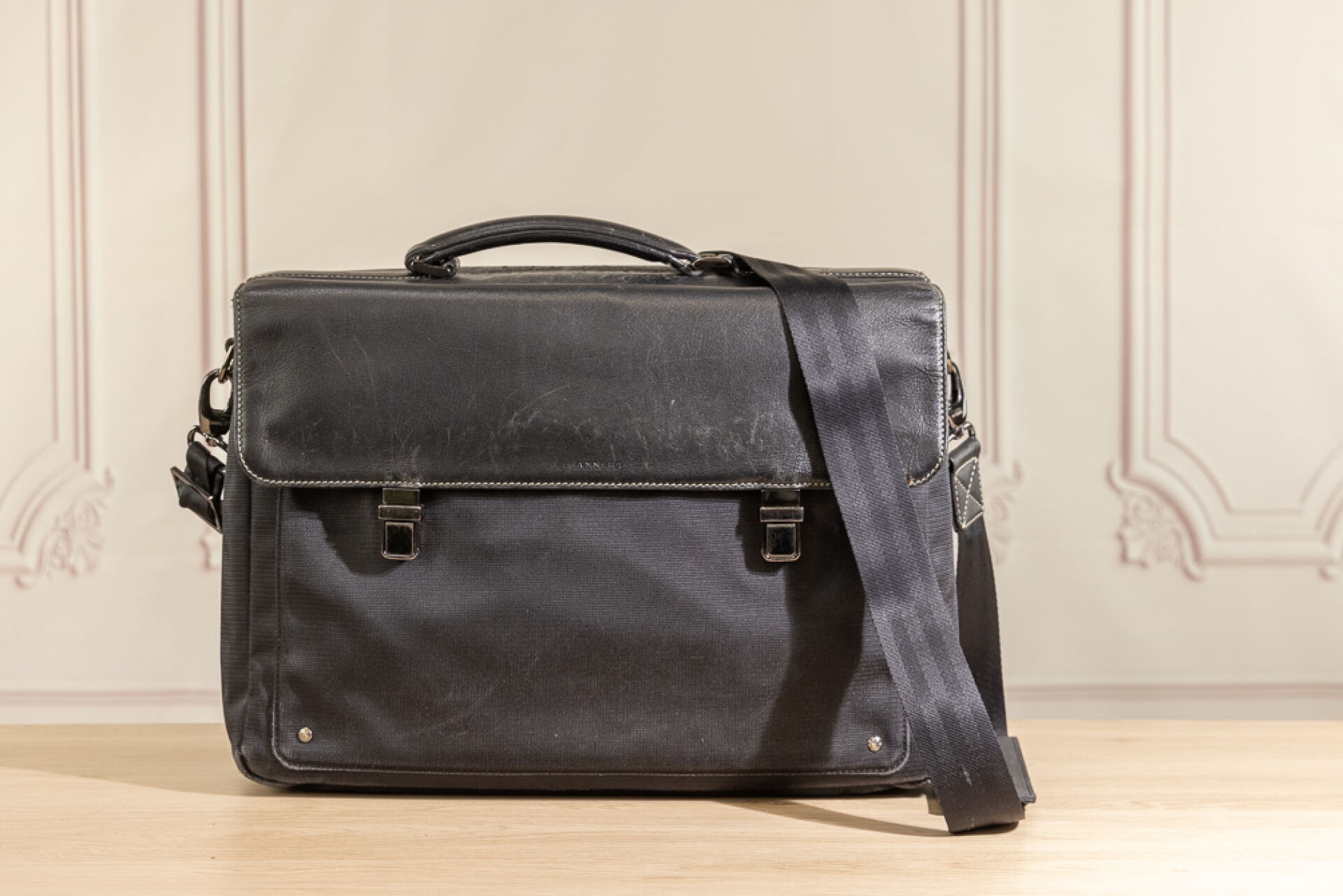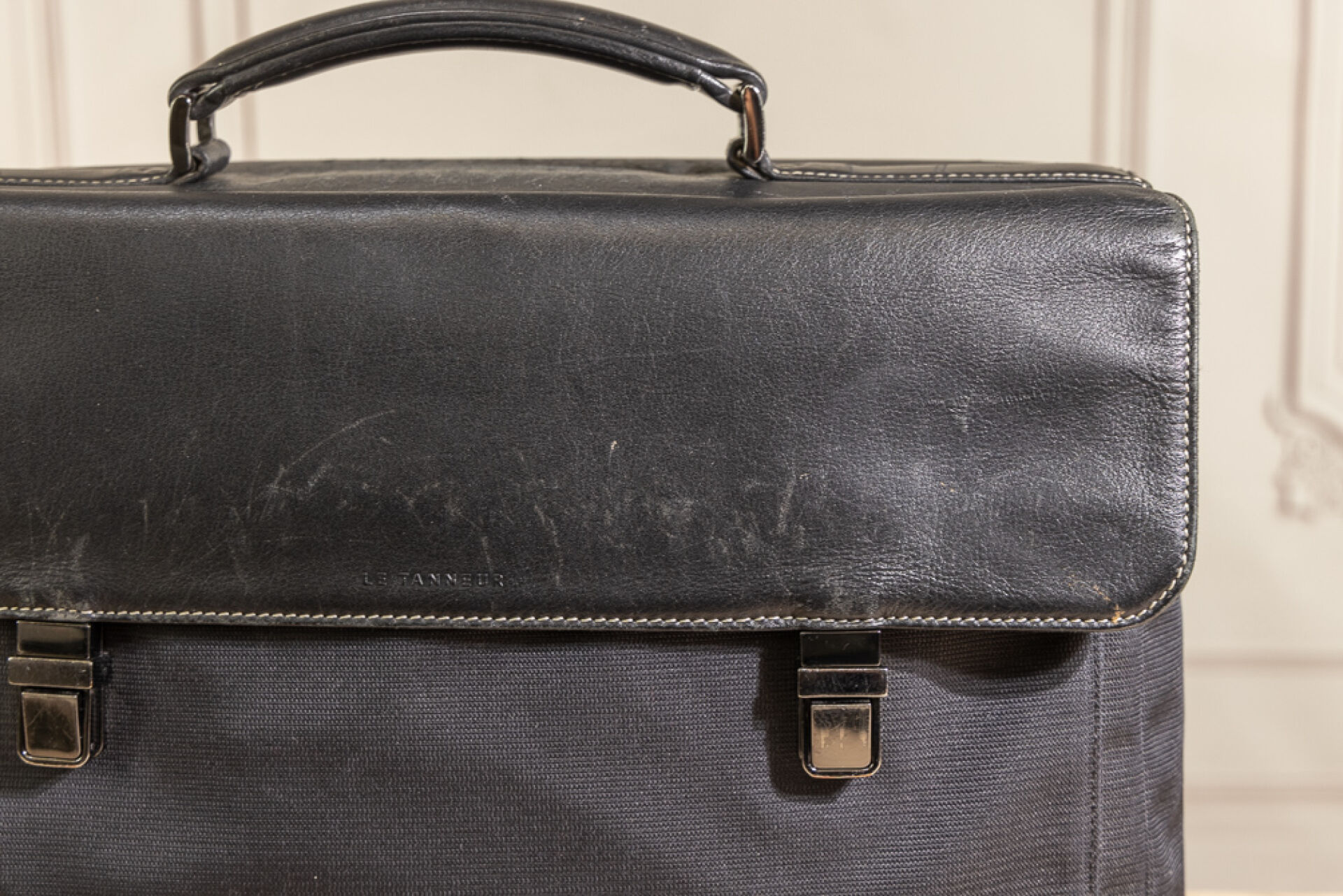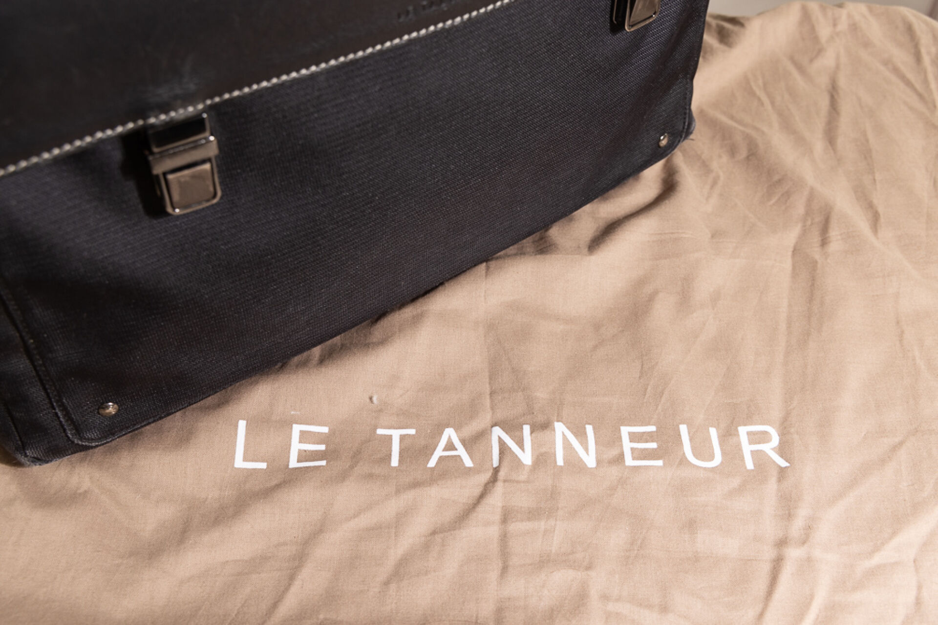 LE TANNEUR - Porte-documents en toile et cuir noir, trois compartiments, bandoulière amovible. Quelques traces d'usage. H32 x L40 cm