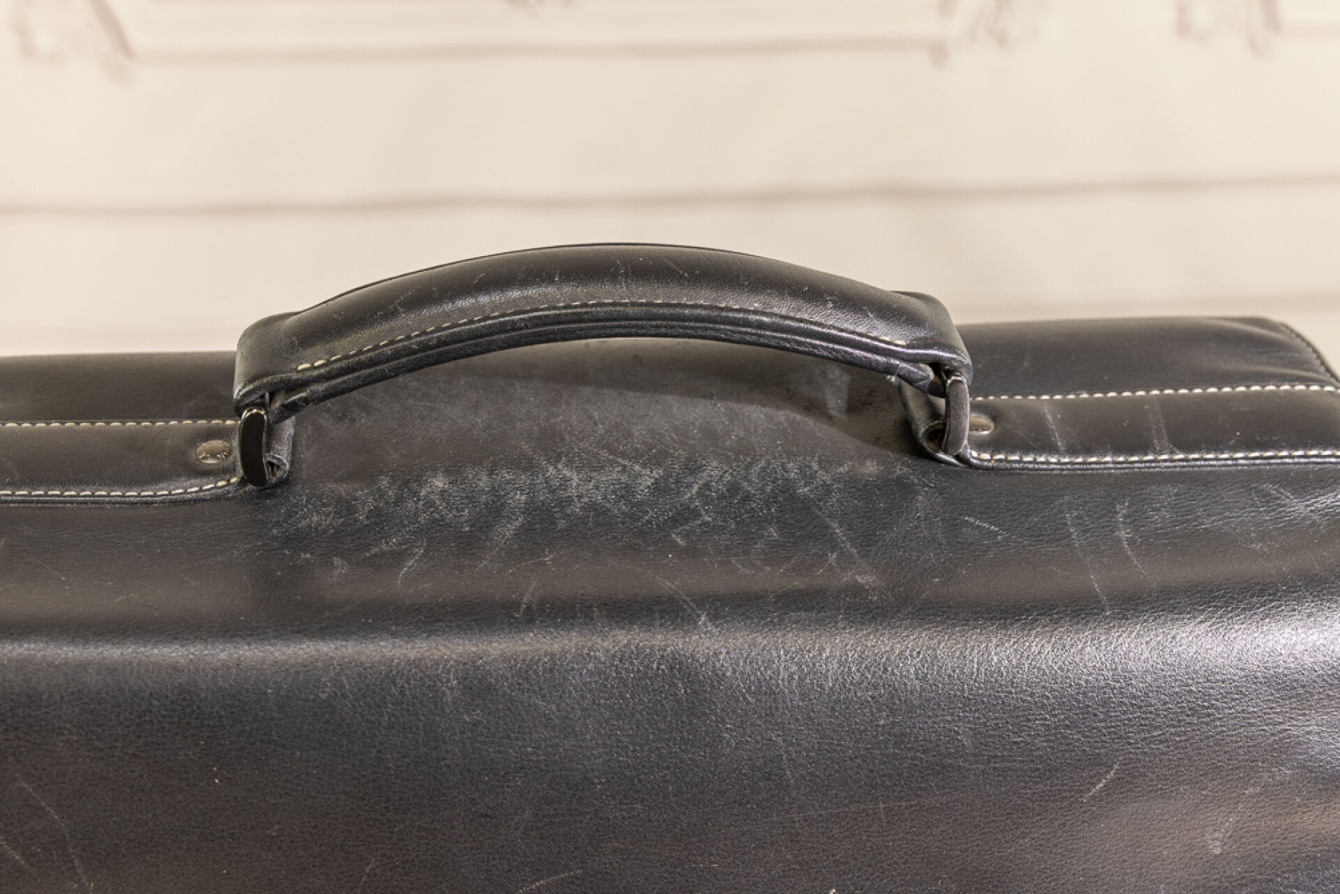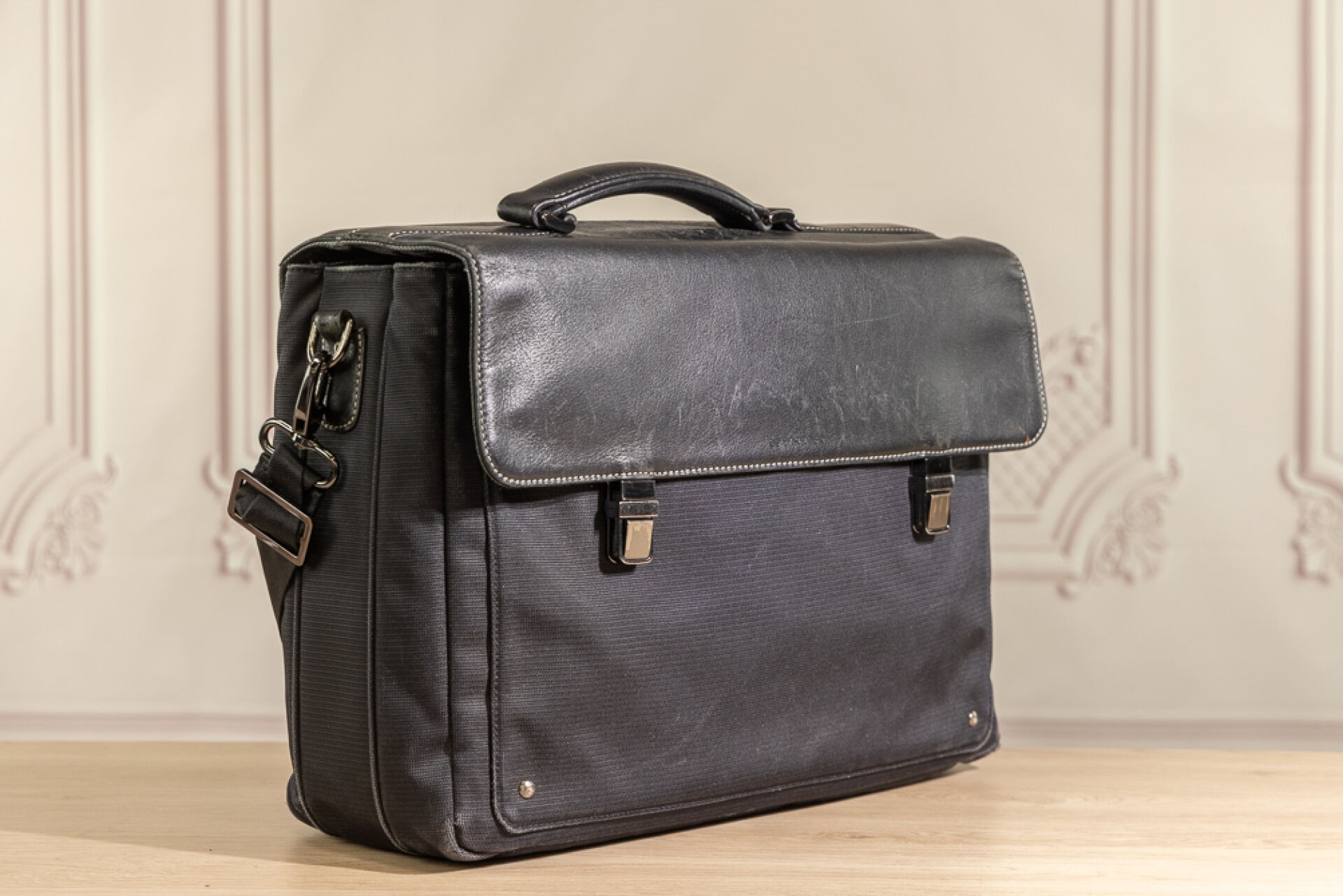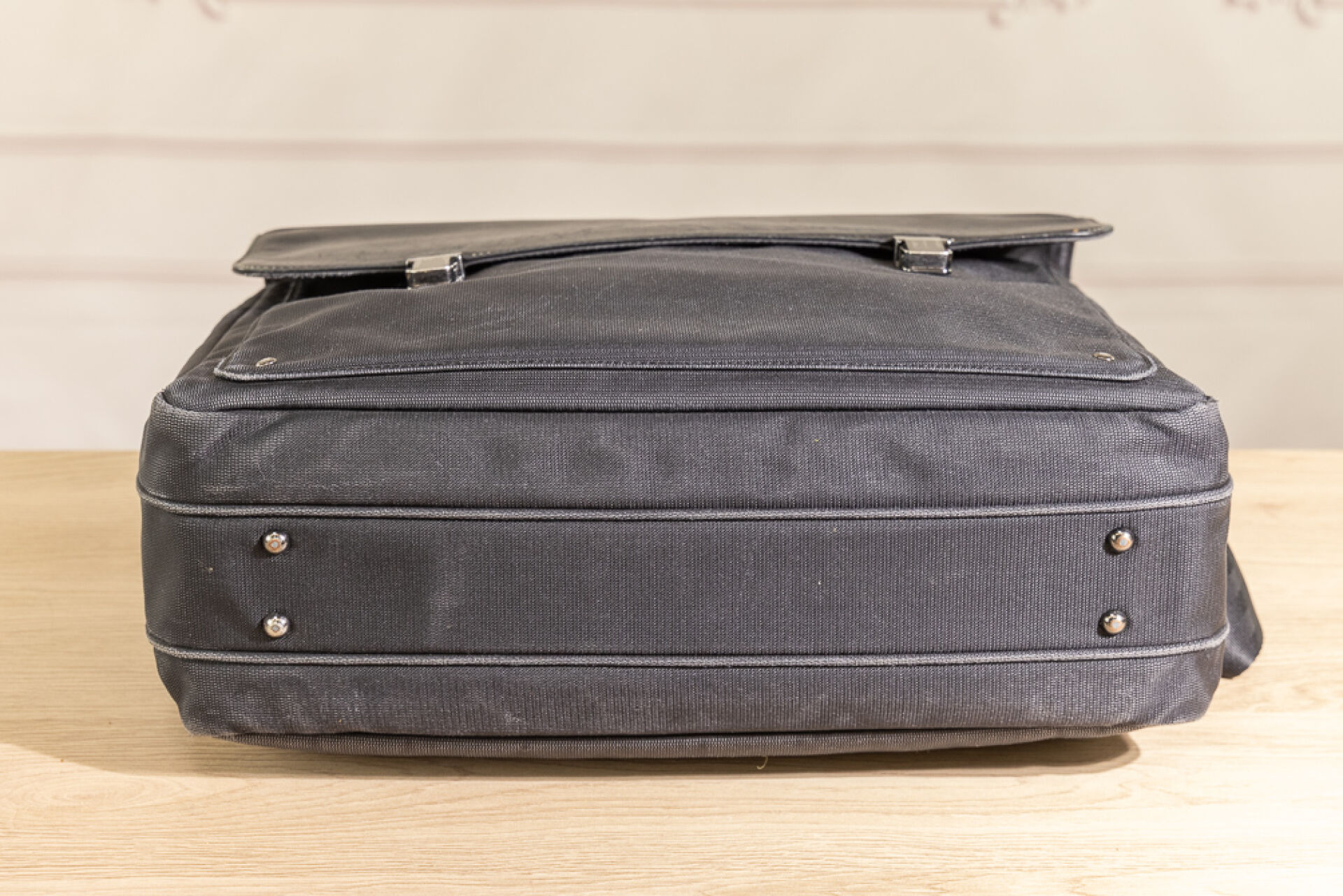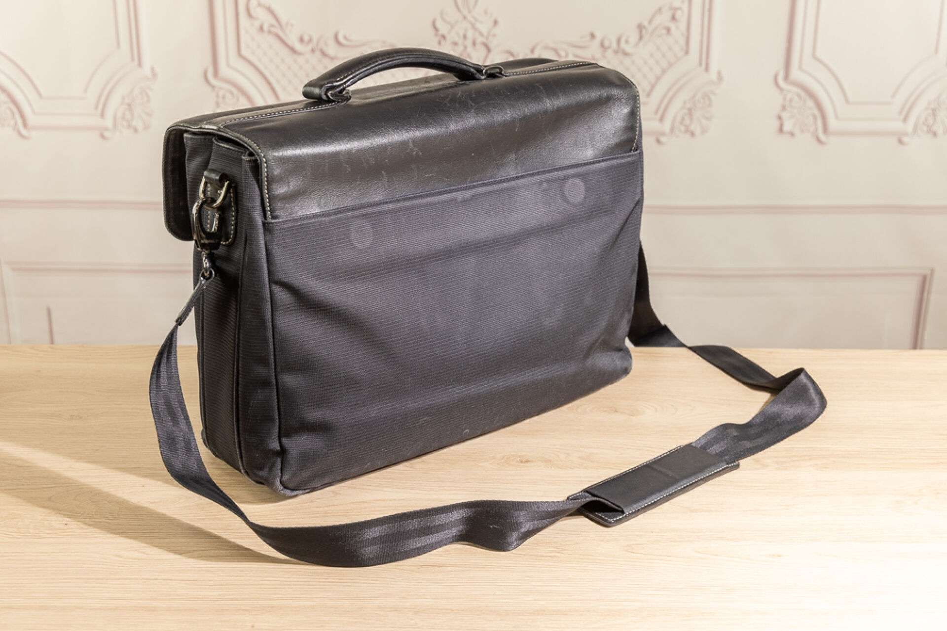 LE TANNEUR - Porte-documents en toile et cuir noir, trois compartiments, bandoulière amovible. Quelques traces d'usage. H32 x L40 cm