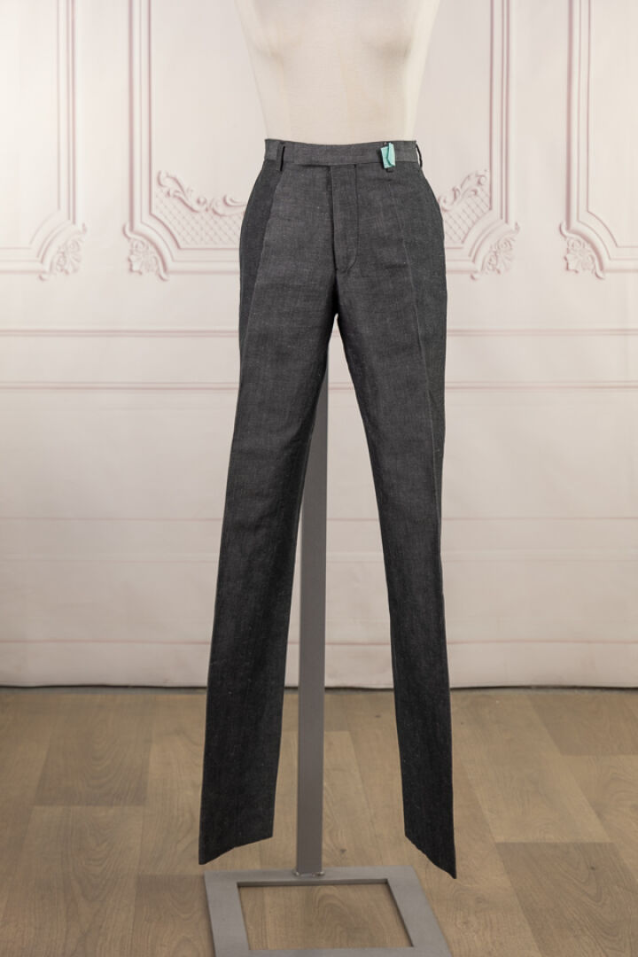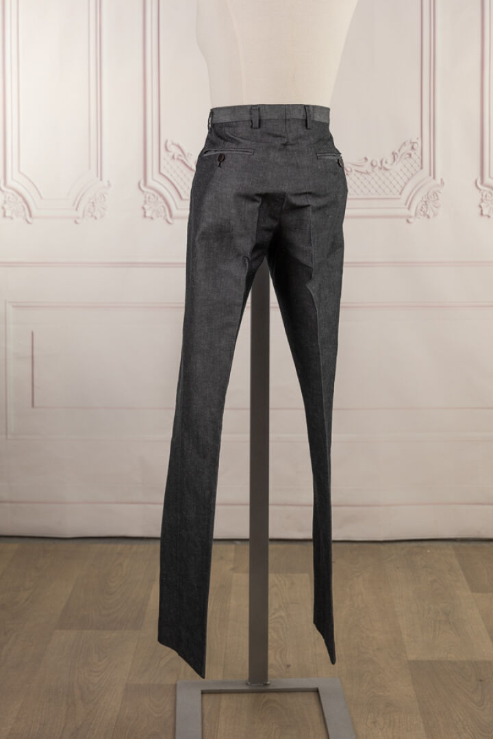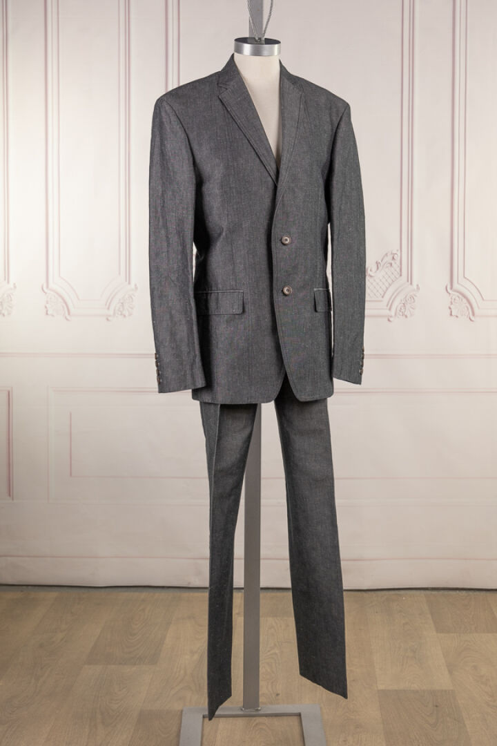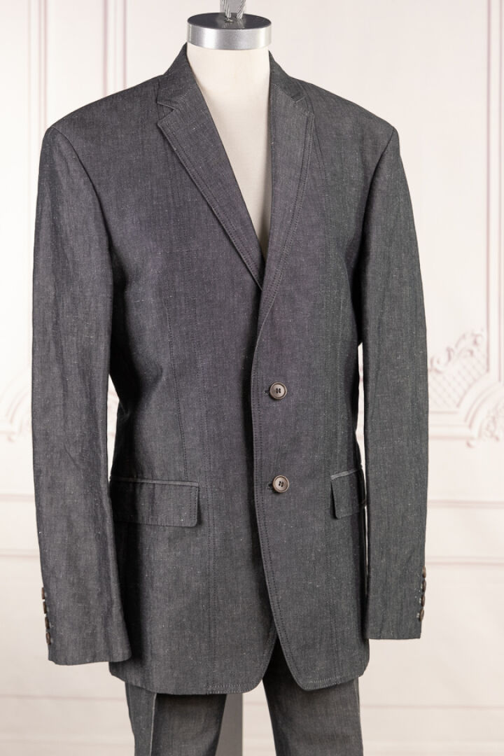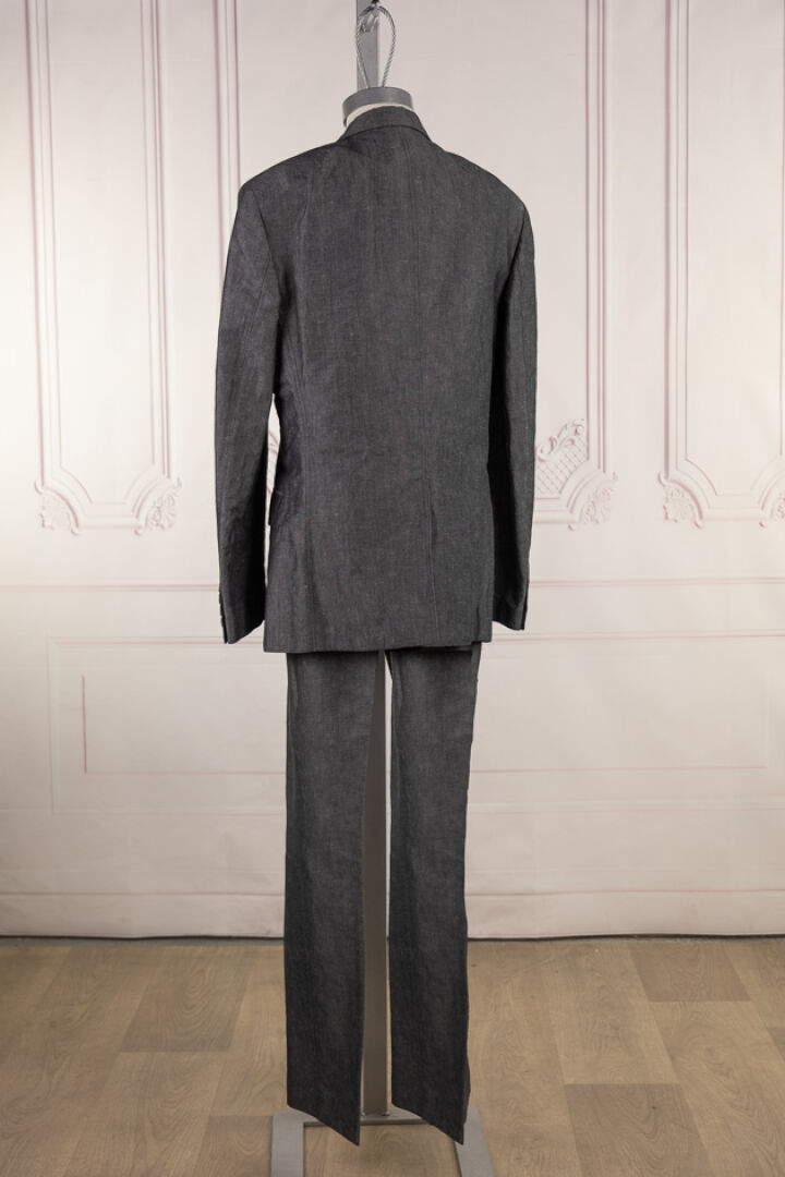 KENZO - Tailleur Homme en coton et lin chiné gris, veste à col châle cranté, simple boutonnage, deux poches sous rabat, manches longues, une fente au dos et pantalon droit à pinces. Taille indiquée 48