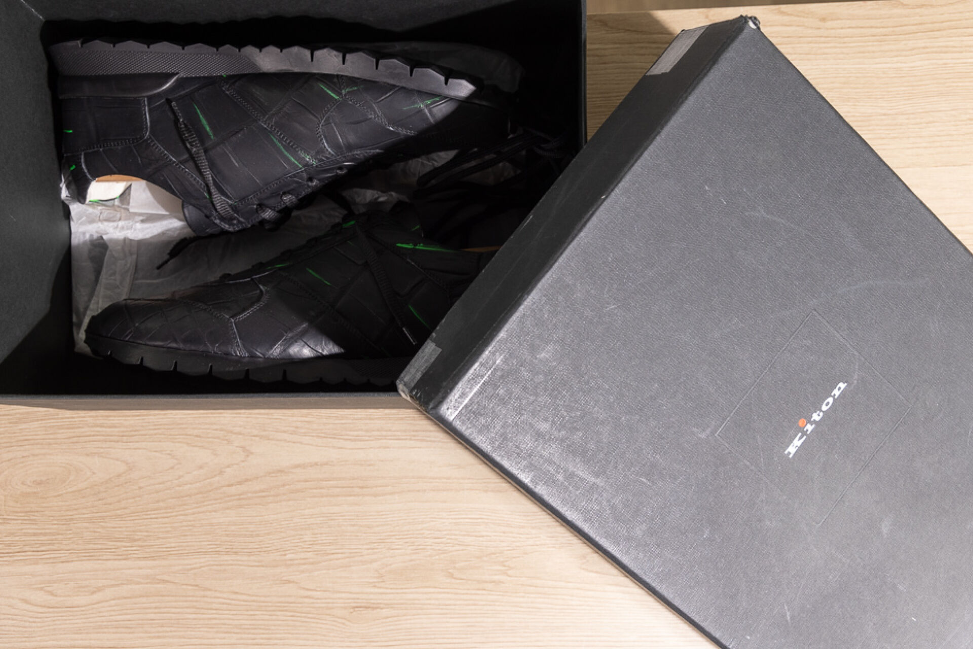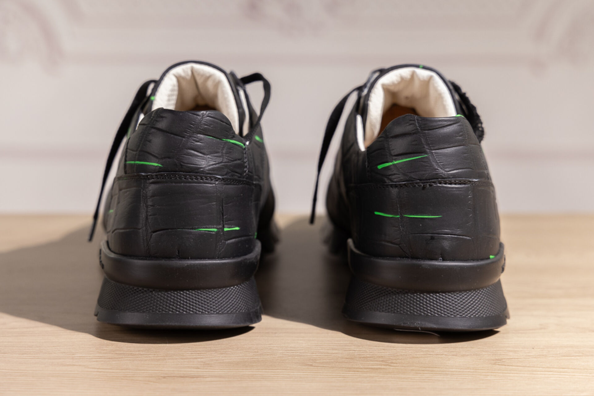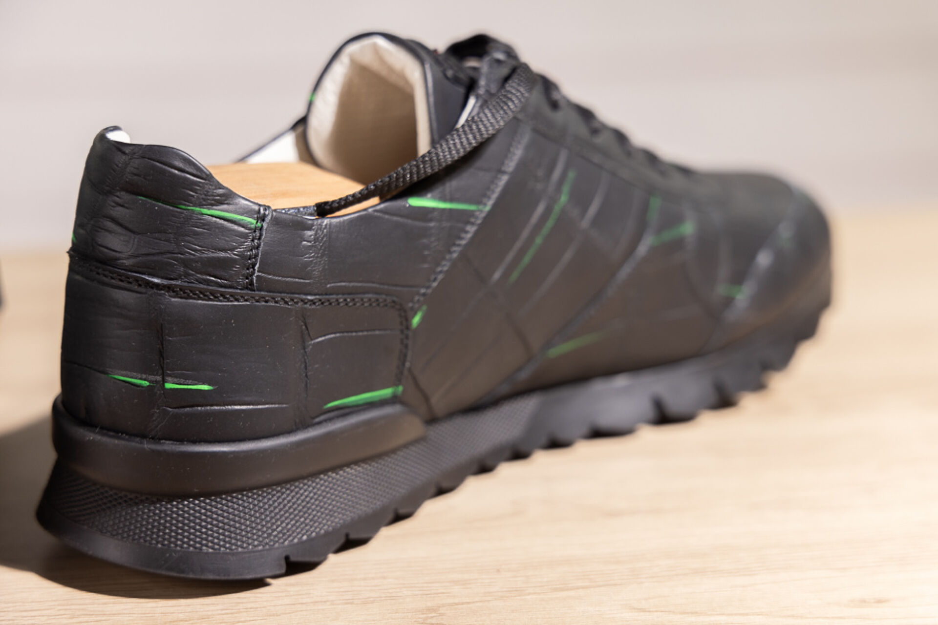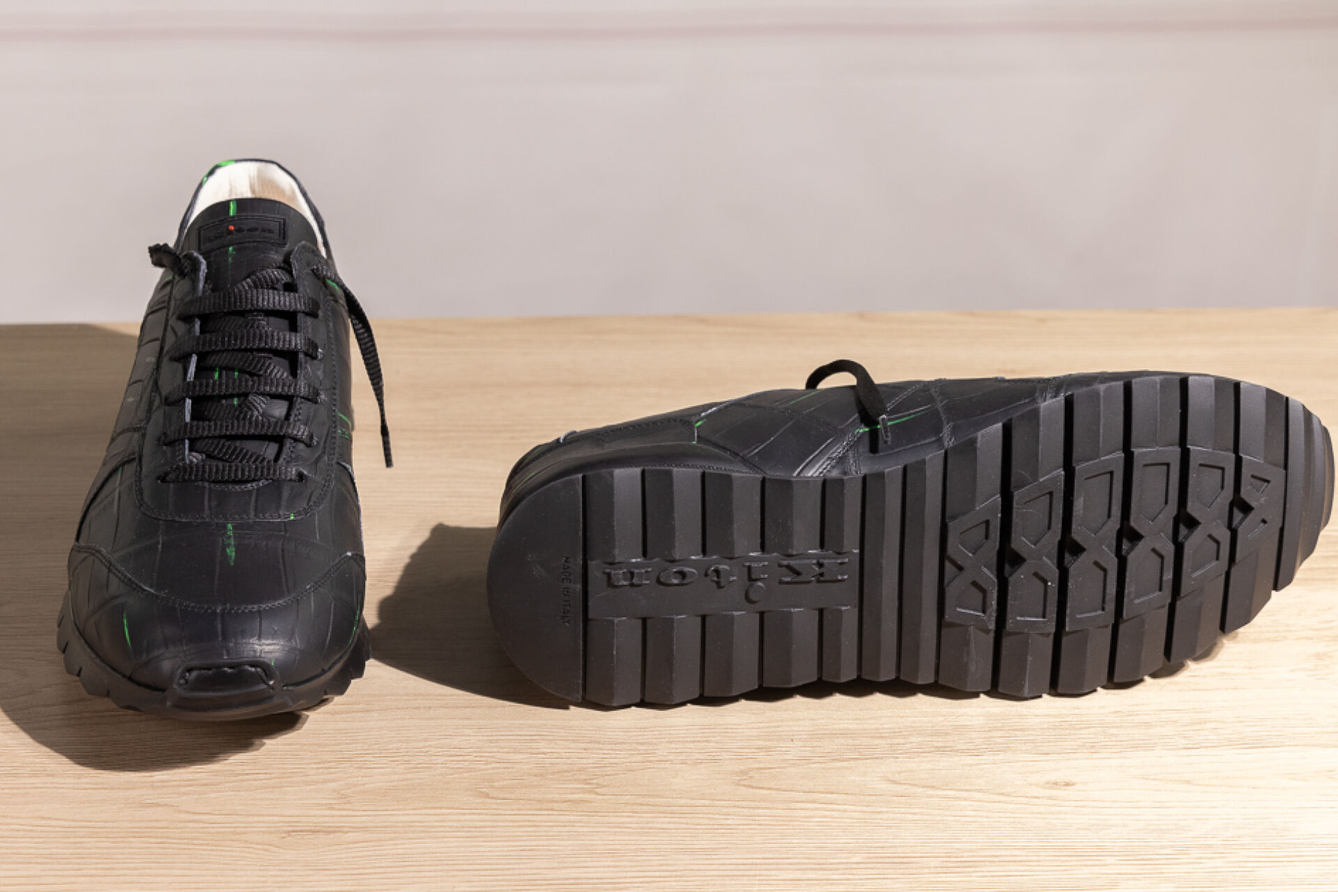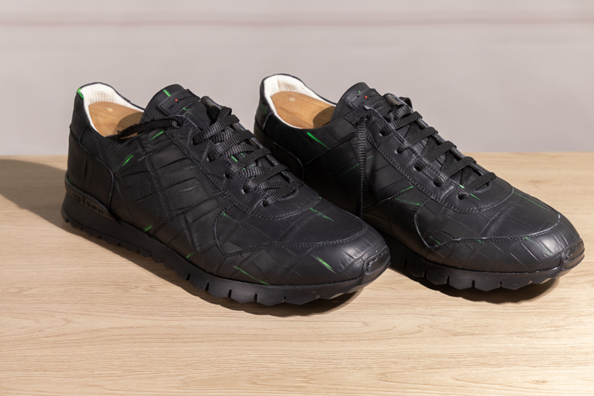 KITON. Paire de sneakers en cuir noir façon croco rehaussé de traces vertes, lacets, semelle crantée. Pointure 9,5 (soit 43,5 français). Boite, embauchoirs, non portées.