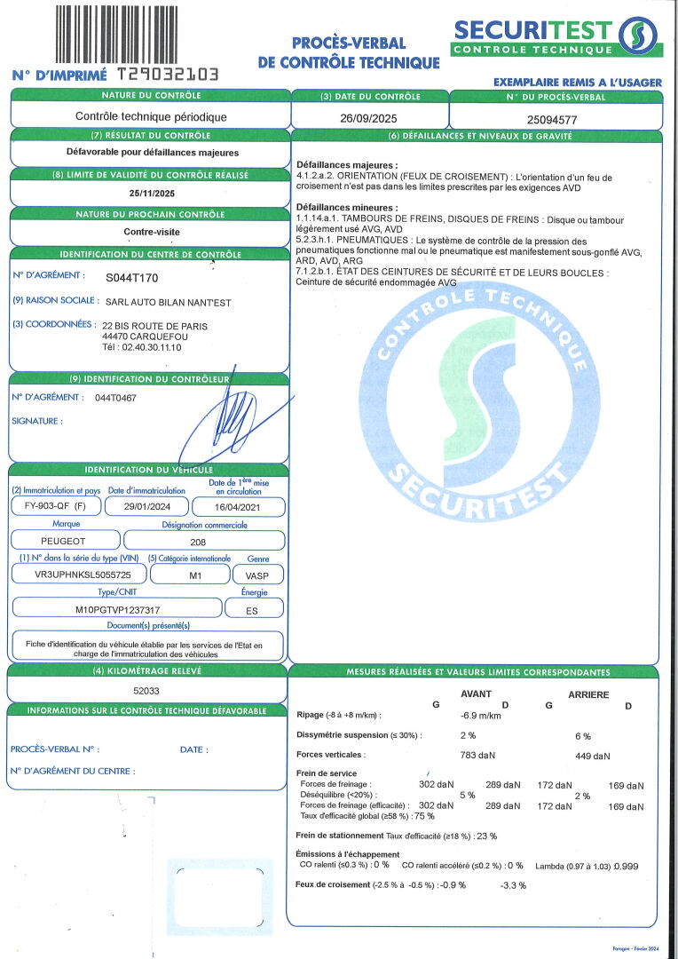 VEHICULE AVEC FIV ET NUMERO DE FORMULE ATTENTION, VEHICULE EQUIPE D'UNE BANQUETTE AR, MAIS RECONNUE EN 2 PLACES SUR LA CARTE GRISE. BVA- CLIM- RADIO- GPS- 4 VITRES ELECT- VITRES AR TEINTEES- RETROS ELECT RABAT- REGULATEUR DE VITESSES- PALETTES AU VOLANT- RADAR DE RECUL. HABITACLE SALE- PLASTIQUES RAYES ET TACHES. CARROSSERIE RAYEE- JANTE AVG, ARD ET AVD RAYEES. DEFAILLANCES MAJEURES: DEFAUT D'ORIENTATION DU FEU DE CROISEMENT AVD. DEFAILLANCES MINEURES: DISQUES OU TAMBOURS DE FREINS AVG ET AVD LEGEREMENT USES- 4 PNEUS SOUS GONFLES- CEINTURE DE SECURITE AVG ENDOMMAGEE.