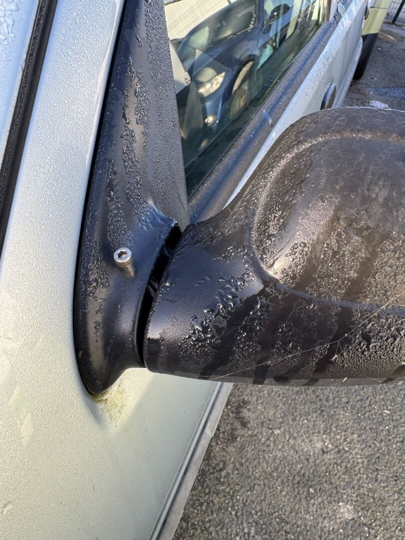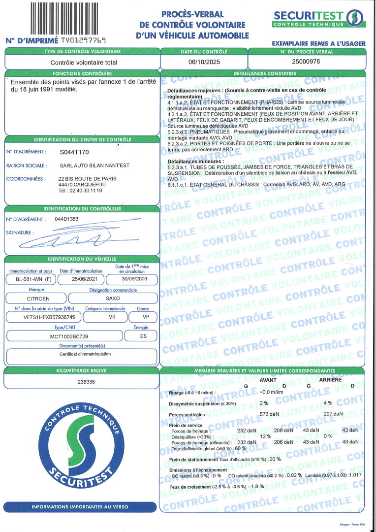 BVM5- RADIO- VITRES ELECT. PLASTIQUES RAYES ET TACHES- VITRE AVD ET LA PORTE ARD NE S'OUVRENT PAS. ENFONCEMENT AILE AVG ET AVD-RAYURES D'USAGE- MANQUE PEINTURE SUR LE CAPOT MOTEUR- AILE ARG RAYEE- PROBLEME DE FIXATION DU RETRO AVD ET AVG- FEU ARD CASSE. DEFAILLANCES MAJEURES: DEFAUT D'ECLAIRAGE DU FEU AVD- PNEU AVG ET AVD GRAVEMENT ENDOMMAGES OU MONTAGE INADAPTE- LA PORTE ARD NE S'OUVRE PAS. DEFAILLANCES MINEURES: DETERIORATION D'UN SILENBLOC DE LIAISON AU CHASSIS OU A L'ESSIEU AVG ET AVD- CORROSION SUR LE CHASSIS AVG, ARD, AV, AVD ET ARG.