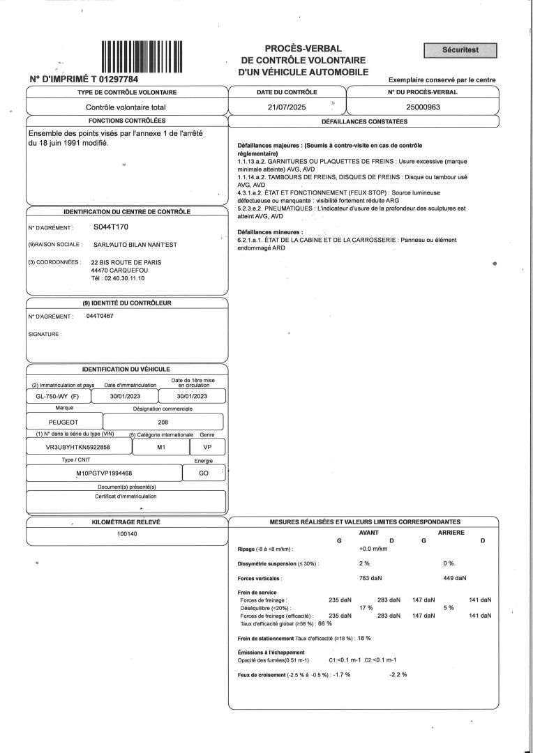 BVM6- CLIM- RADIO- GPS- VITRES ETY RETROS ELECT- REGULATEUR DE VITESSES- PUB ADH. PLASTIQUES RAYES ET TACHES- 1 TROU DANS LE SIEGE CONDUCTEUR. RAYURES D'USAGE- CHOC SUR LE PARE CHOCS AV- ENJOLIVEURS ARG, ARD ET AVD RAYES. DEFAILLANCES MAJEURES: USURE EXCESSIVE DES PLAQUETTES OU GARNITURES DE FREINS AVG ET AVD- DISQUES OU TAMBOURS DE FREINS AVG ET AVD USES- VISIBILITE FORTEMENT REDUITE DU FEU STOP ARG- PNEU AVG ET AVD USES. DEFAILLANCES MINEURES: CARROSSERIE ARD ENDOMMAGEE.
