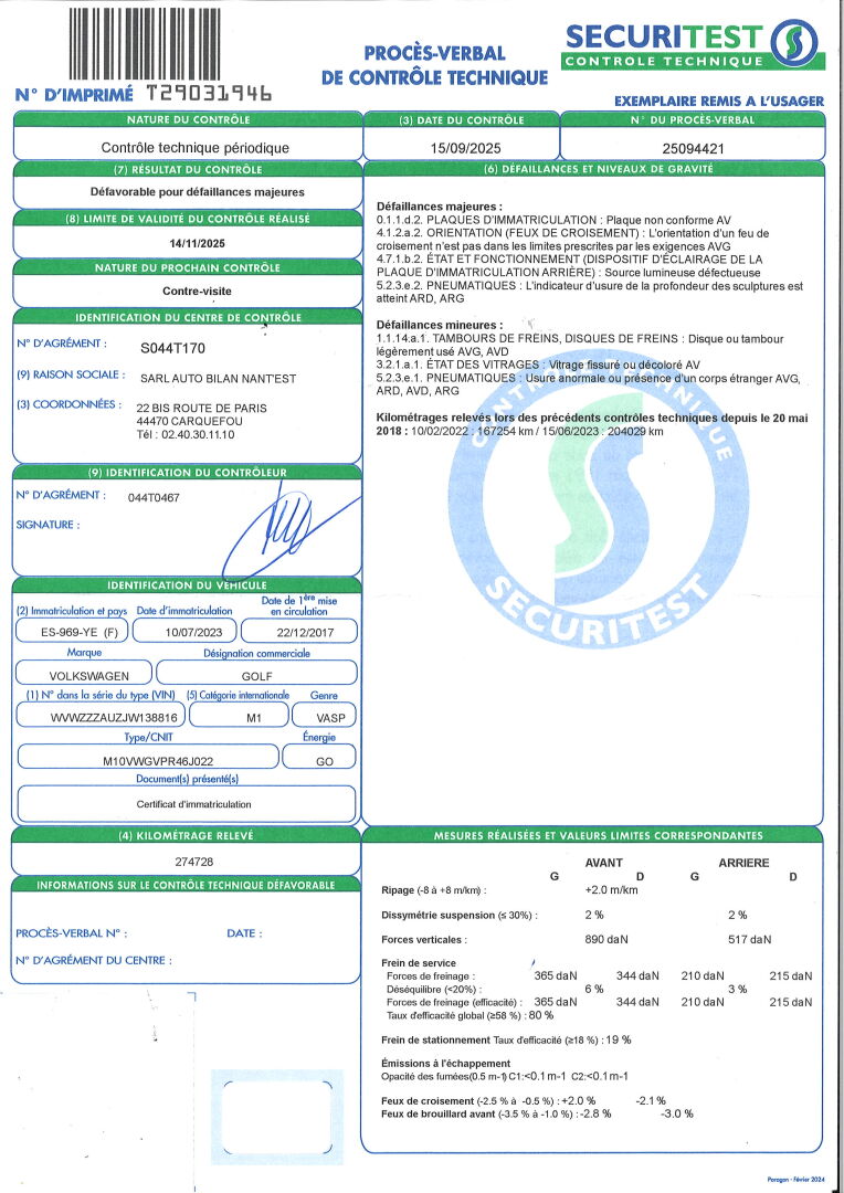 BVA- CLIM BI ZONES- RADIO- GPS- 4 VITRES ELECT- RETROS ELECT RABAT- RADAR DE RECUL- REGULATEUR DE VITESSES. SIEGES EN TISSU TACHES- PLASTIQUES RAYES ET TACHES. IMPACT SUR LA VITRE AV- RAYURES D'USAGE- TRACES DE CORROSION- 4 JANTES RAYEES- FROTTEMENTS SUR L'AILE ARD, PORTE ARD ET PORTE AVD. DEFAILLANCES MAJEURES: PLAQUE D'IMMAT AV NON CONFORME- DEFAUT D'ORIENTATION DU FEU DE CROISEMENT AVG- DEFAUT D'ECLAIRAGE DE LA PLAQUE D'IMMAT AR- PNEUS ARD ET ARG USES. DEFAILLANCES MINEURES: DISQUE OU TAMBOUR DE FREIN AVG ET AVD LEGEREMENT USES-VITRE AV FISSUREE- USURE ANORMALE DES 4 PNEUS.