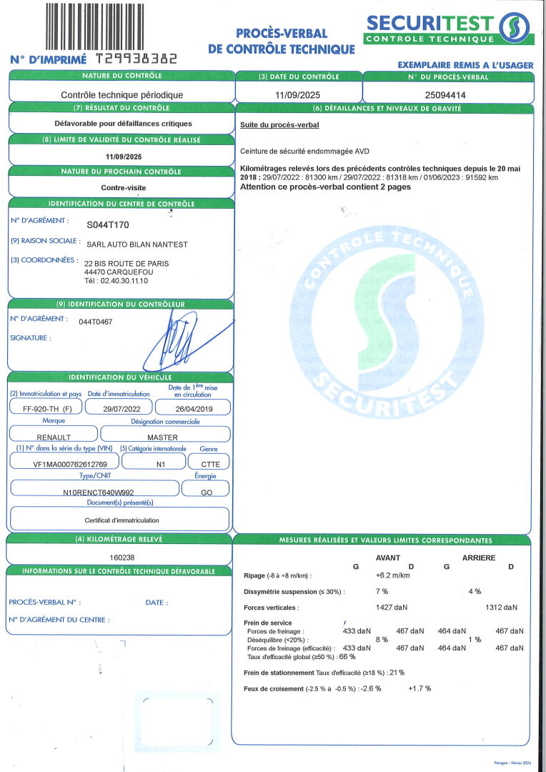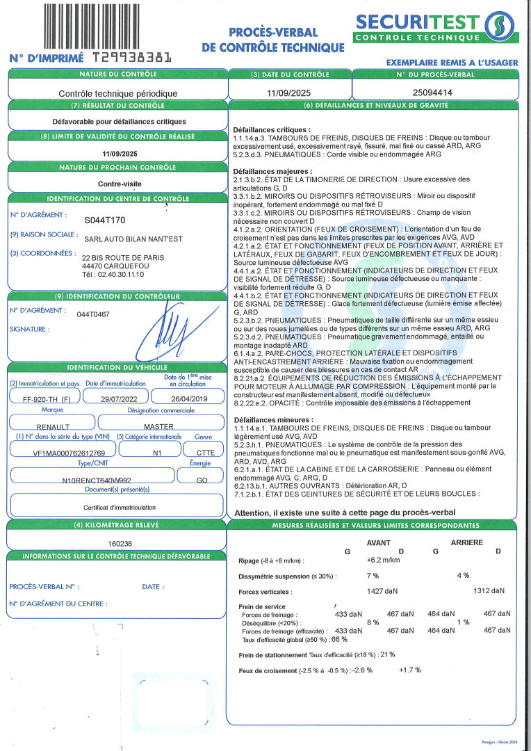 VEHICULE A ENLEVER SUR PLATEAU: DEFAILLANCES CRITIQUES: DEFAUT SUR LE SYSTEME DE FREIN ARD ET ARG- CORDE DU PNEU ARG VISIBLE. BVM6- CLIM- RADIO- GPS- VITRES ET RETROS ELECT- REGULATEUR DE VITESSES- RADAR DE RECUL- CAISSE BOIS AVEC RGT- ATTELAGE MIXTE- ECHELLE ET GALERIE ALU CHARGE MAXI 157 KGS. PLASTIQUES RAYES ET TACHES- HABITACLE SALE- SIEGES EN TISSU TACHES ET DECHIRES. RAYURES D'USAGE- BANDES FLUO- PUB ADH- FEUX DU CLIGNOTANT SUR LE RETRO G CASSE- ENFONCEMENT PORTE LAT D- FROTTEMENT AILE ARD ET AVD. DEFAILLLANCES MAJEURES: USURE EXCESSIVE DE LA DIRECTION G ET D- MIROIR DU RETRO D ENDOMMAGE- DEFAUT D'ORIENTATION DES FEUX DE CROISEMENT AVG ET AVD- DEFAUT D'ECLAIRAGE DES CLIGNOTANS G ET D- PNEU DE TAILLE SUR UN MEME ESSIEU ARD ET ARG- MAUVAISE FIXATION DU PARE CHOCS AR- DEFAUT D'ECHAPPEMENT- DEFAUT D'OPACITE. DEFAILLANCES MINEURES: DISQUES OU TAMBOURS DE FREINS AVG ET AVD LEGEREMENT USES- 4 PNEUS SOUS GONFLES- CARROSSERIE AVG,C,ARG ET D ENDOMMAGEE- DETERIORATION DES OUVRANTS AR ET D- CEINTURE DE SECURITE AVD ENDOMMAGEE.
