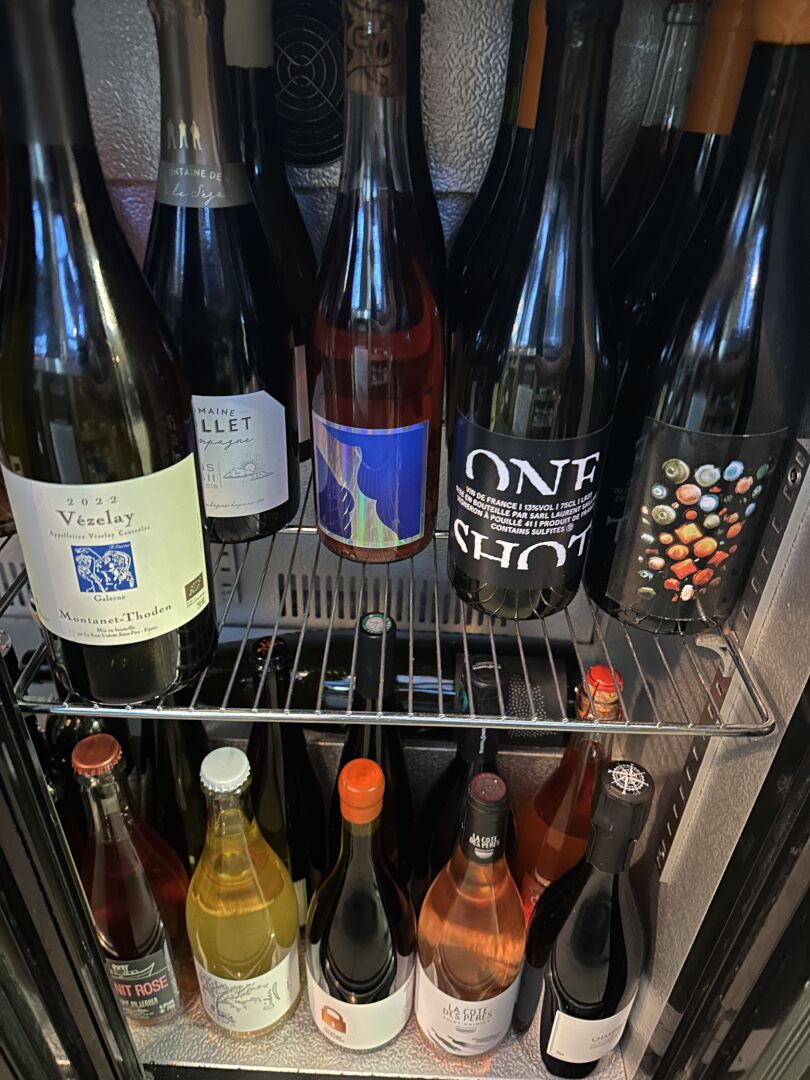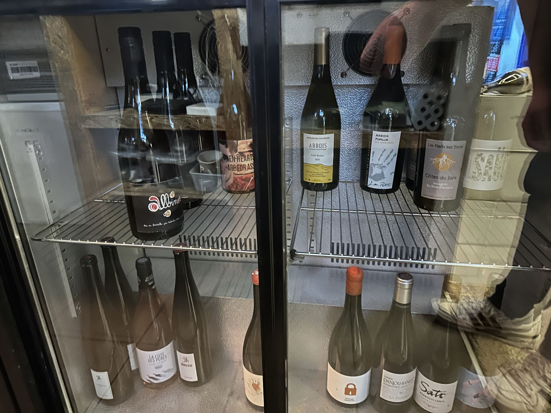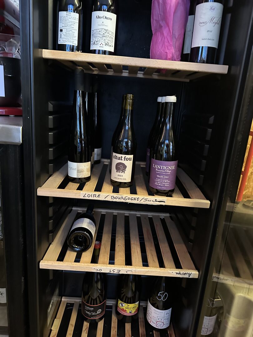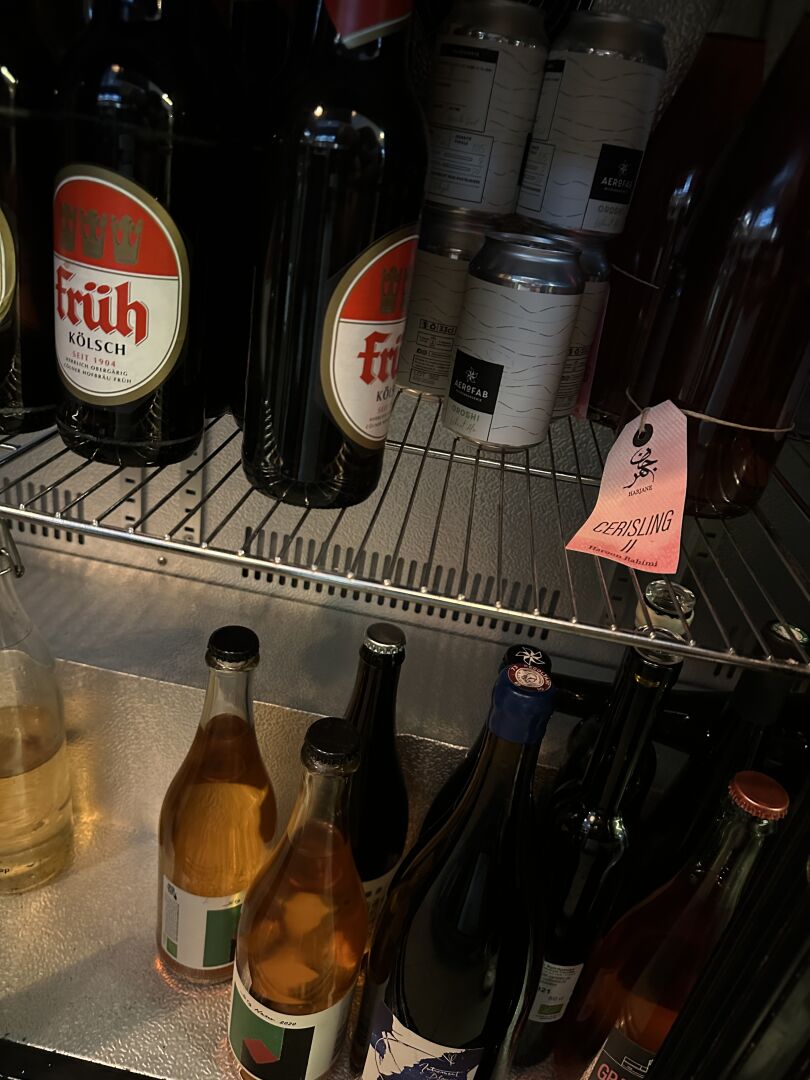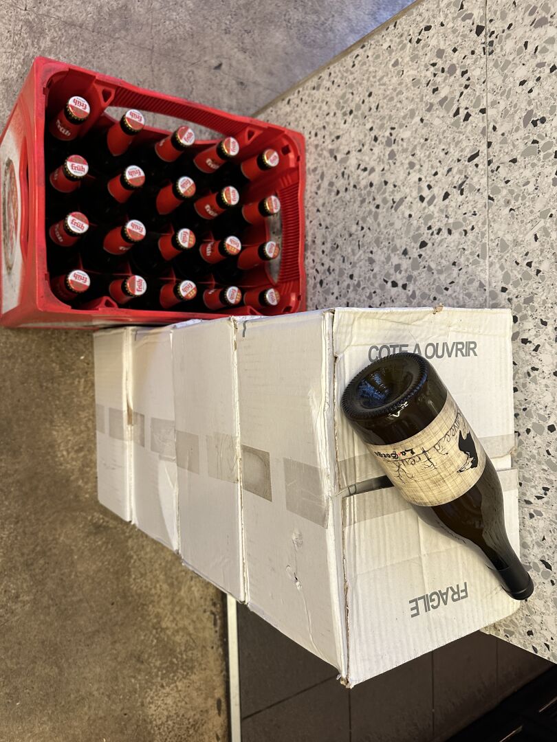 environ 100 bouteilles de vin dont : Beaujolais Village, St Emilion, Morgon, Chenas, Luberon, La Sorgia, Arbois, Côtes du Jura, St Chinian, différents vins de France, Champagne, etc environ 36 bières allemandes FRUH 0.5 L 14 cidres, apéritifs, et digestifs entamés.