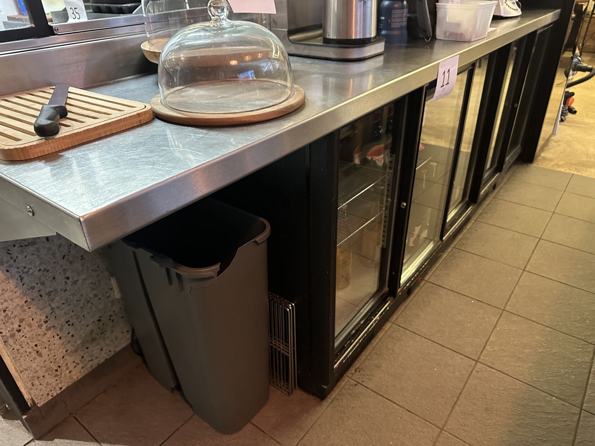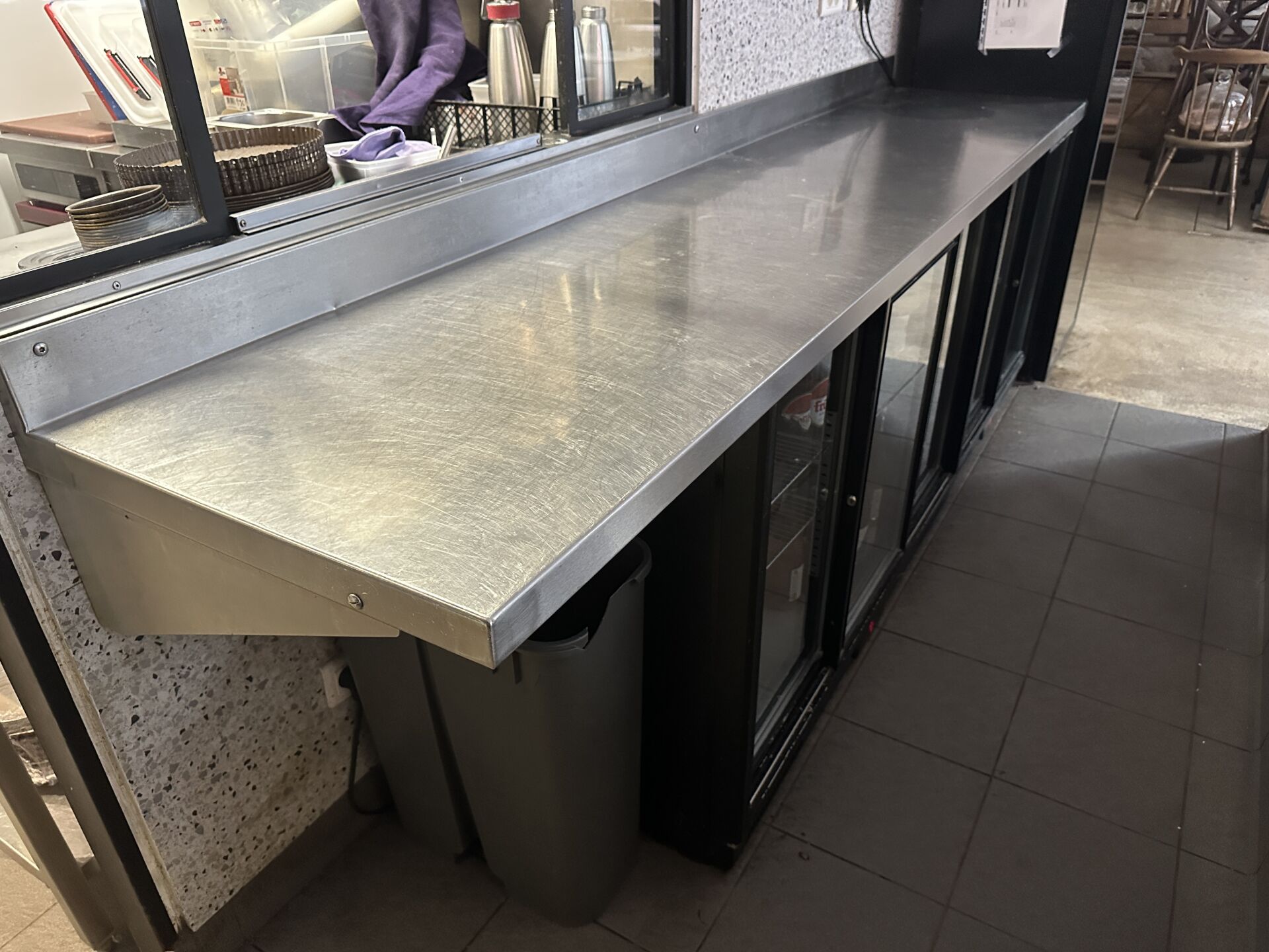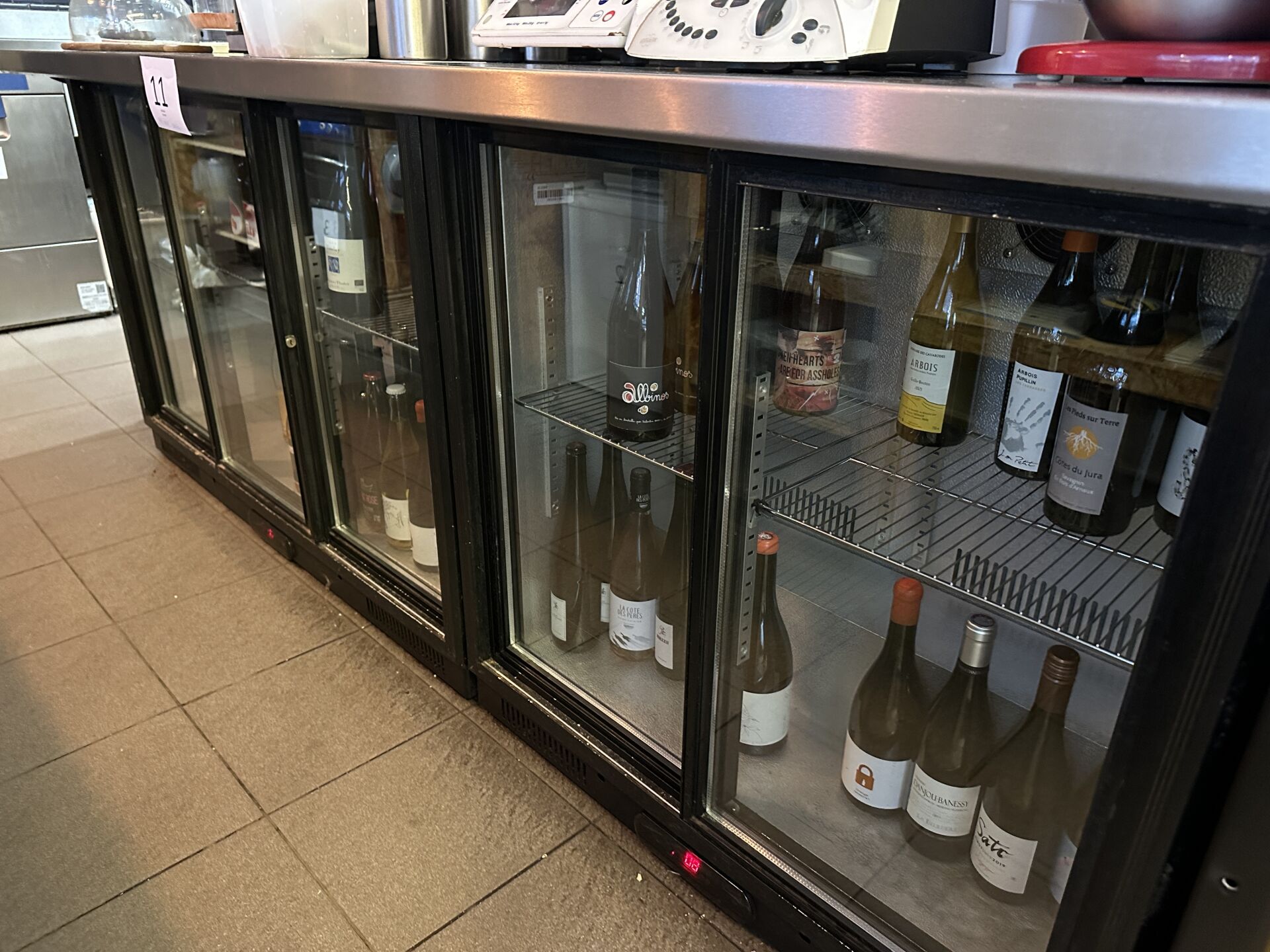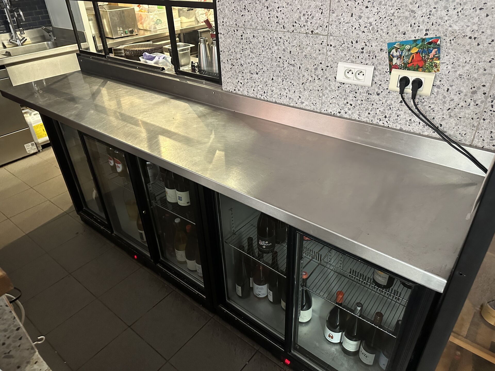 1 arrière bar, avec meubles réfrigérés ouvrant à 2 et 3 portes, dessus plateau en inox à dosseret (275 x 60 x 90 cm) à démonter proprement sans dommage à l'immeuble
