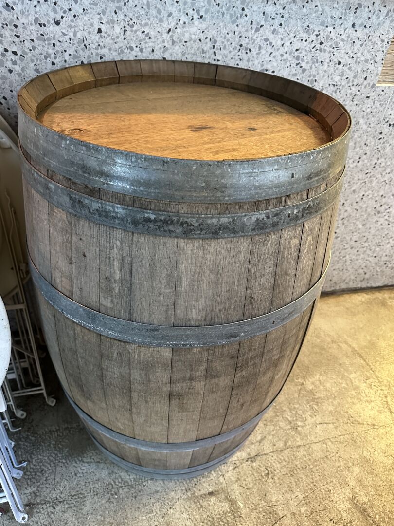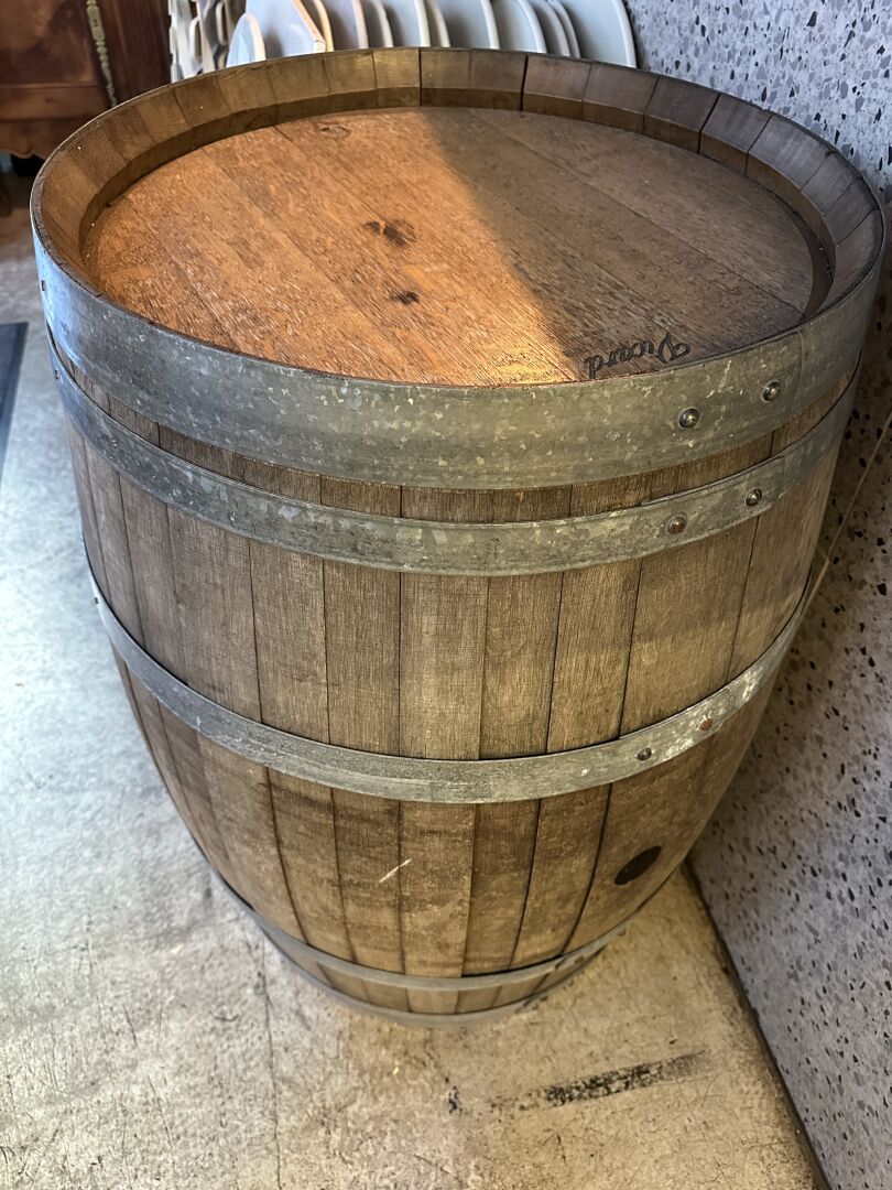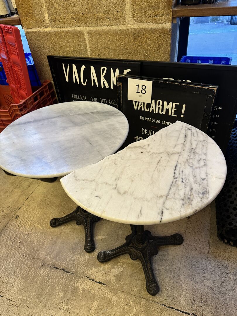 2 tables type guéridon, plateau en marbre (dont l'une plateau accidenté), piètement bistrot en fonte Stop-trottoir en bois laqué noir et ardoise 2 ardoises murales, cadres en métal noir 1 fût de bois utilisable en mange-debout