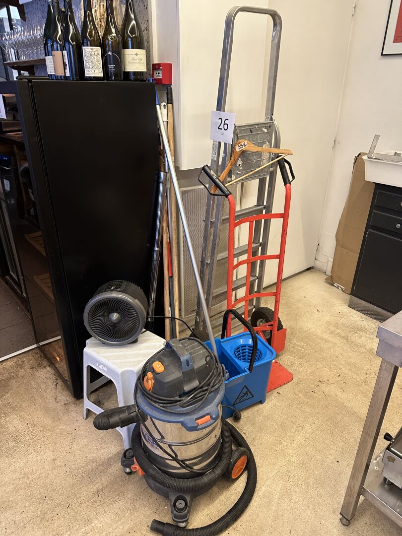1 diable en métal rouge 1 escabeau en aluminium à 4 marches 1 aspirateur bidon DEXTER 30 L 1500 W Dans 1 carton : 1 ventilateur de comptoir, 1 tabouret PVC, 1 lot d'accessoires de ménage