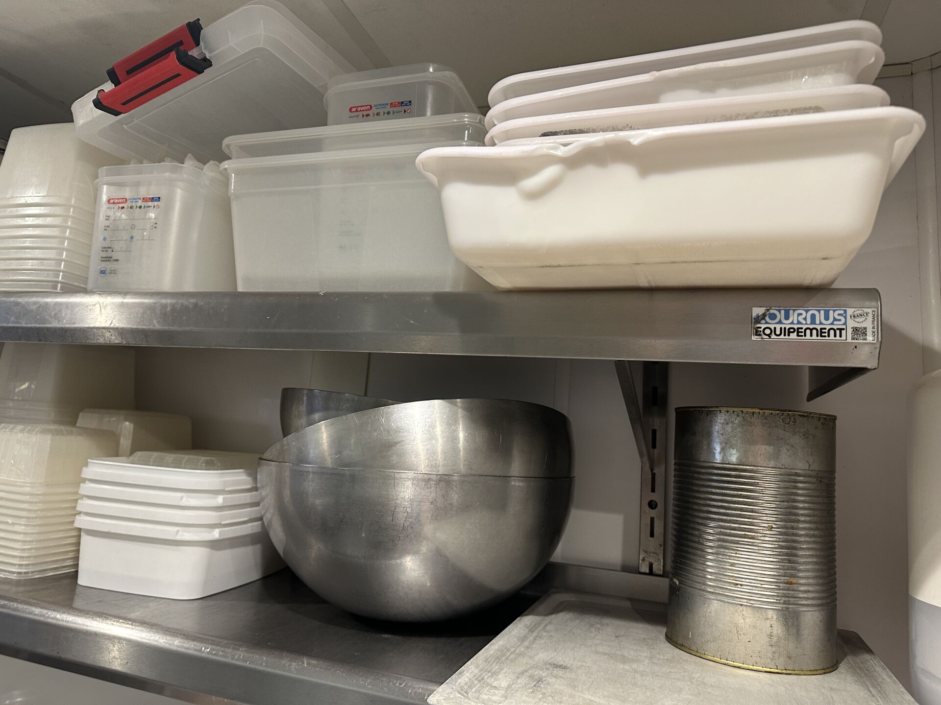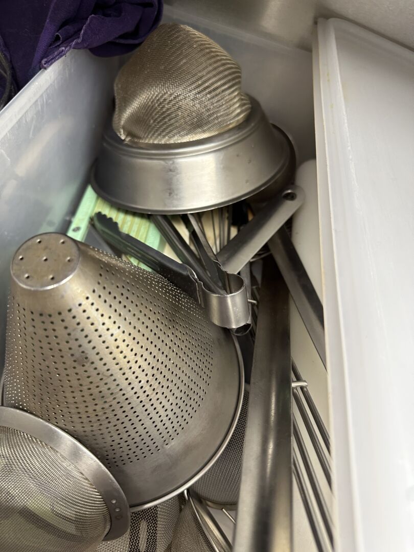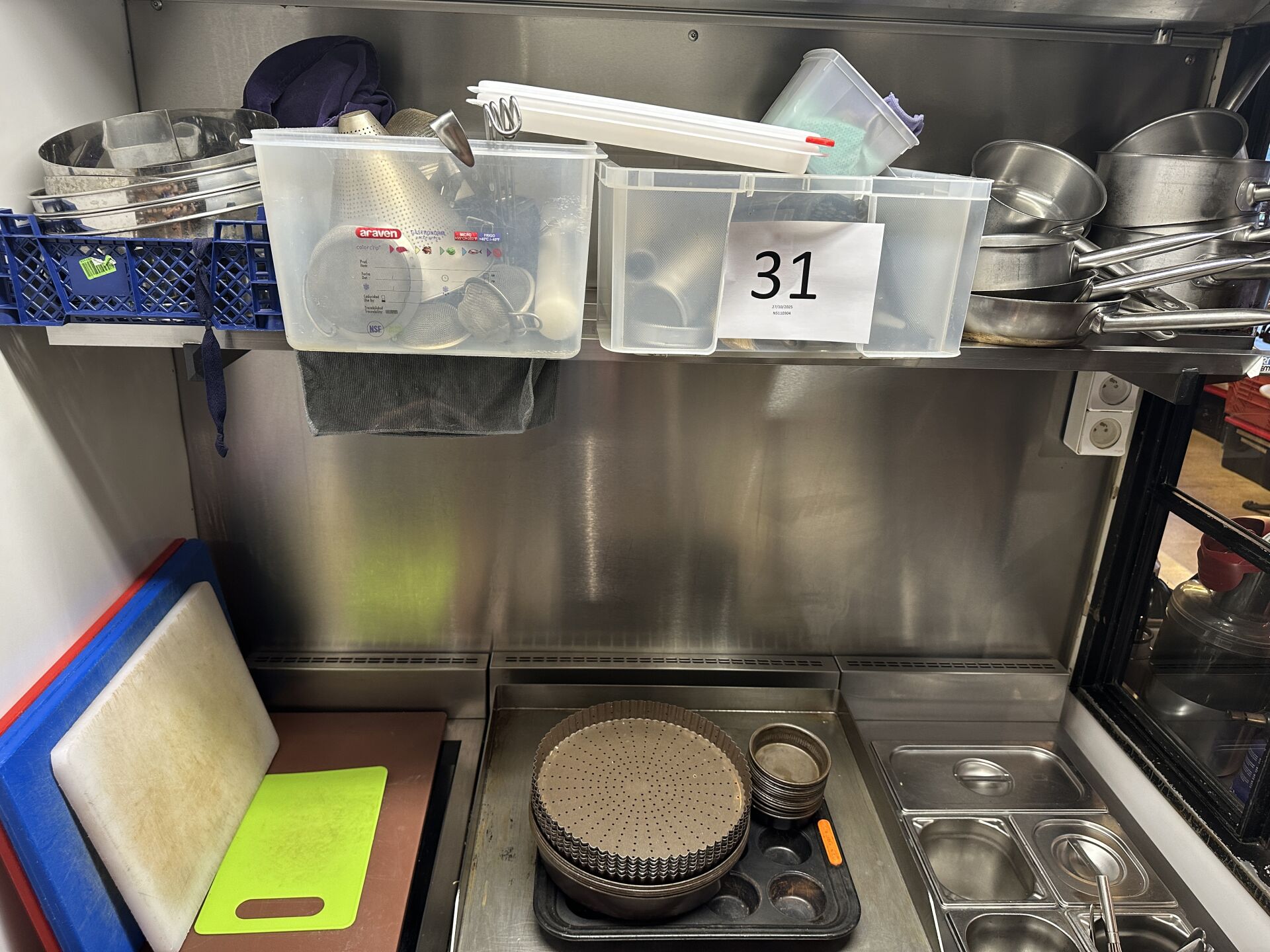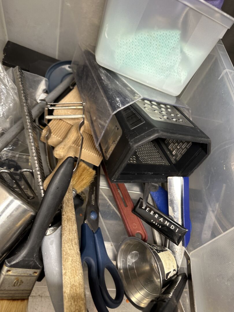 1 lot d'ustensiles de cuisine, fouets, pinces, cuillères... 1 lot de moules à tarte, plaques téflon 1 lot de 3 faitouts, 2 culs-de-poule 1 important lot de petites barquettes en plastique 1 lot de 8 casseroles et poêles en inox