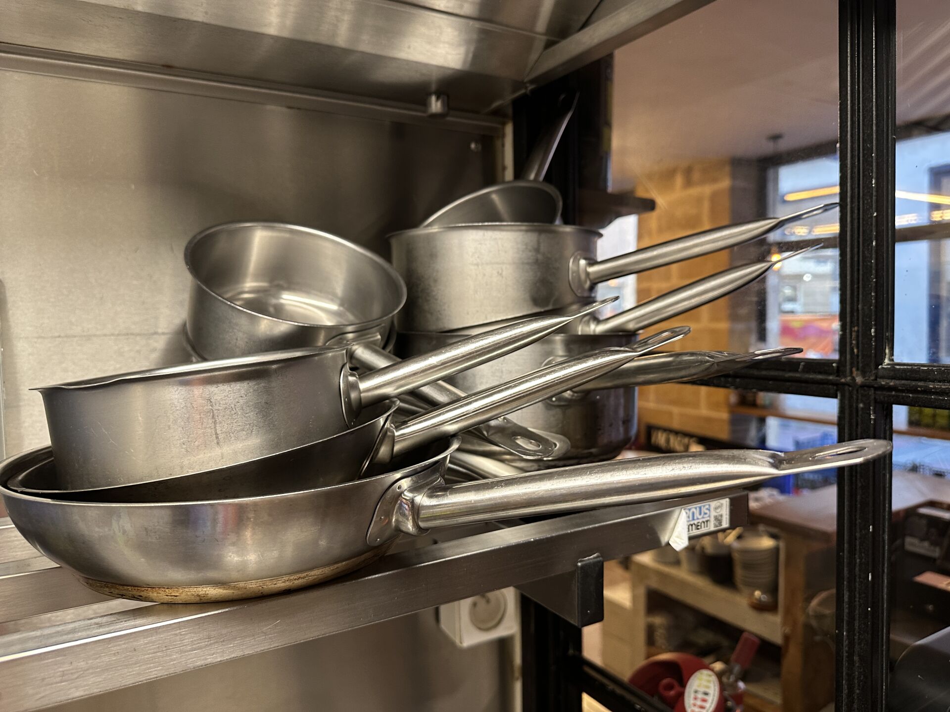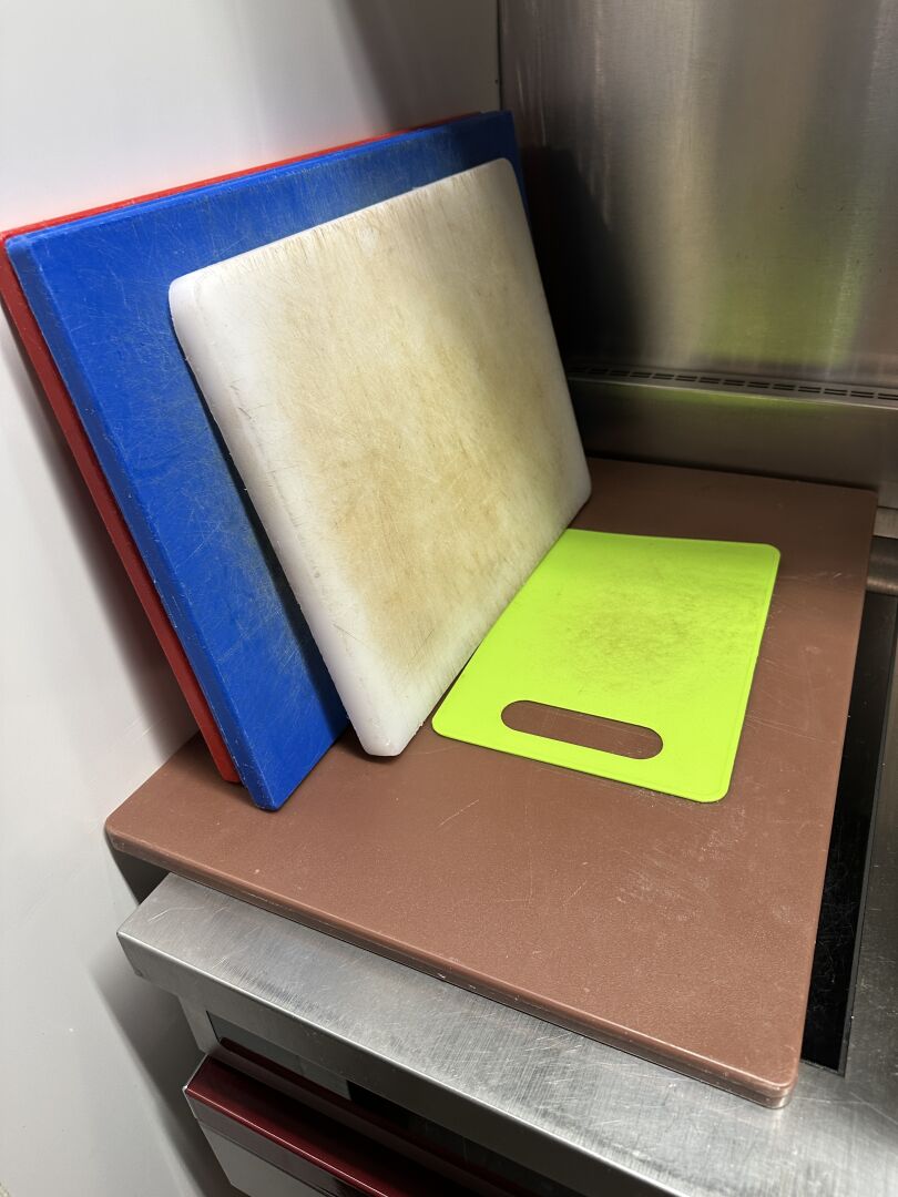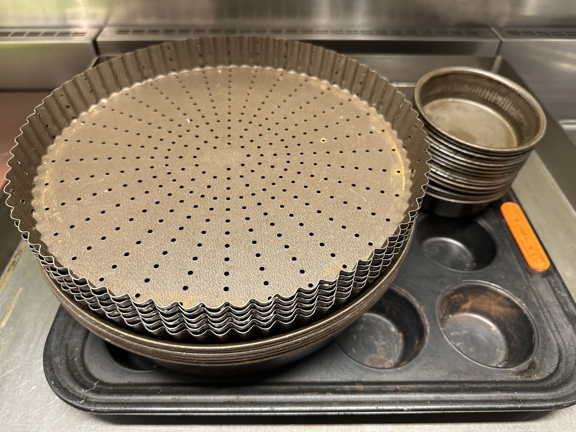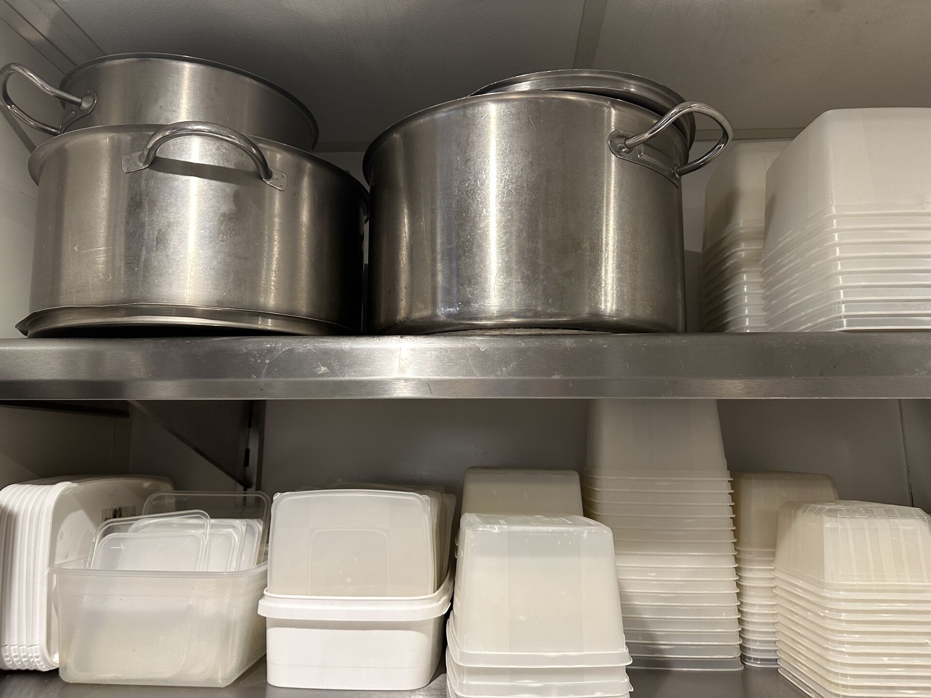 1 lot d'ustensiles de cuisine, fouets, pinces, cuillères... 1 lot de moules à tarte, plaques téflon 1 lot de 3 faitouts, 2 culs-de-poule 1 important lot de petites barquettes en plastique 1 lot de 8 casseroles et poêles en inox