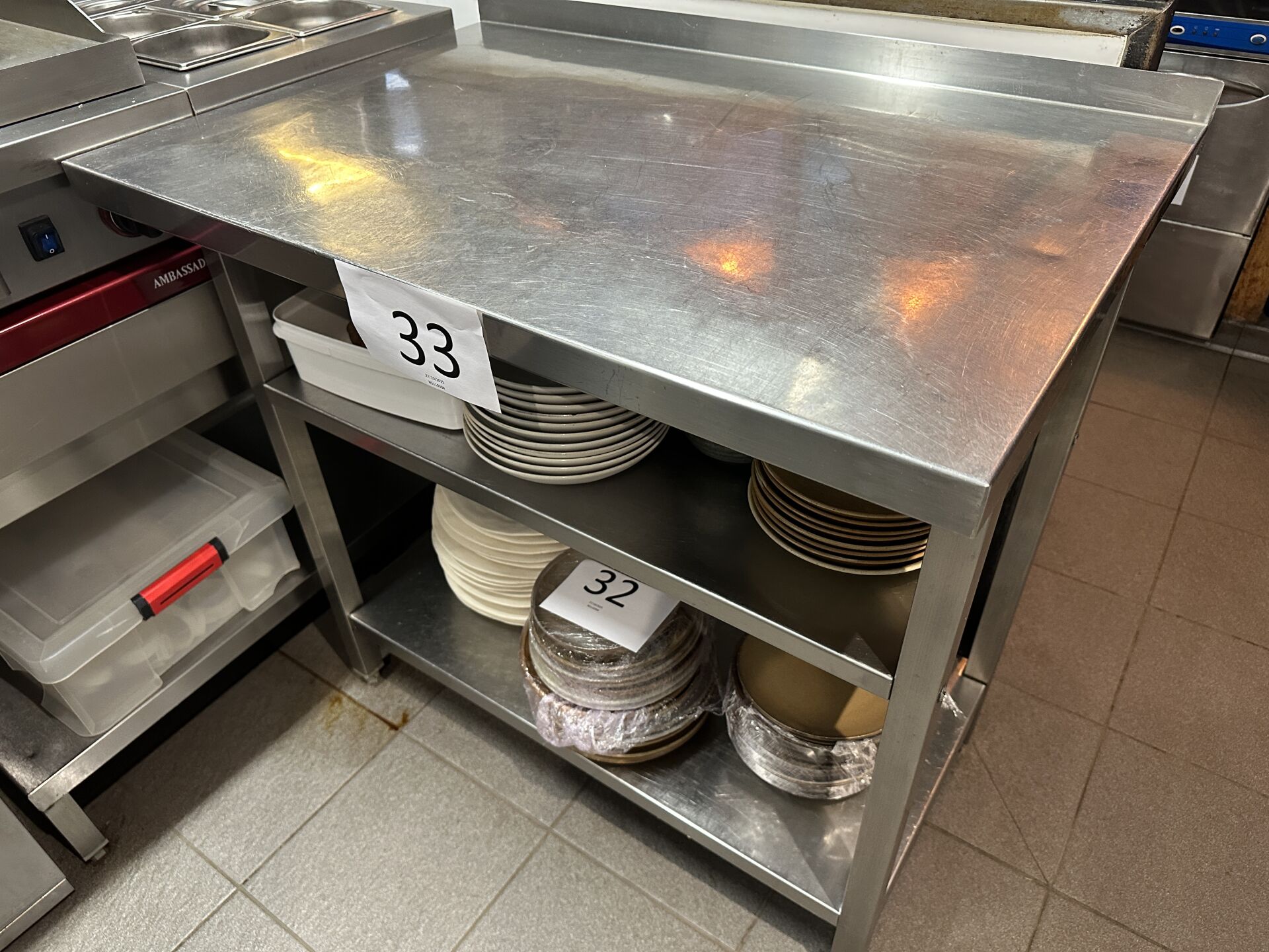 1 desserte en inox, à double tablette d'entrejambe (90 x 60 x 90 cm) et dosseret