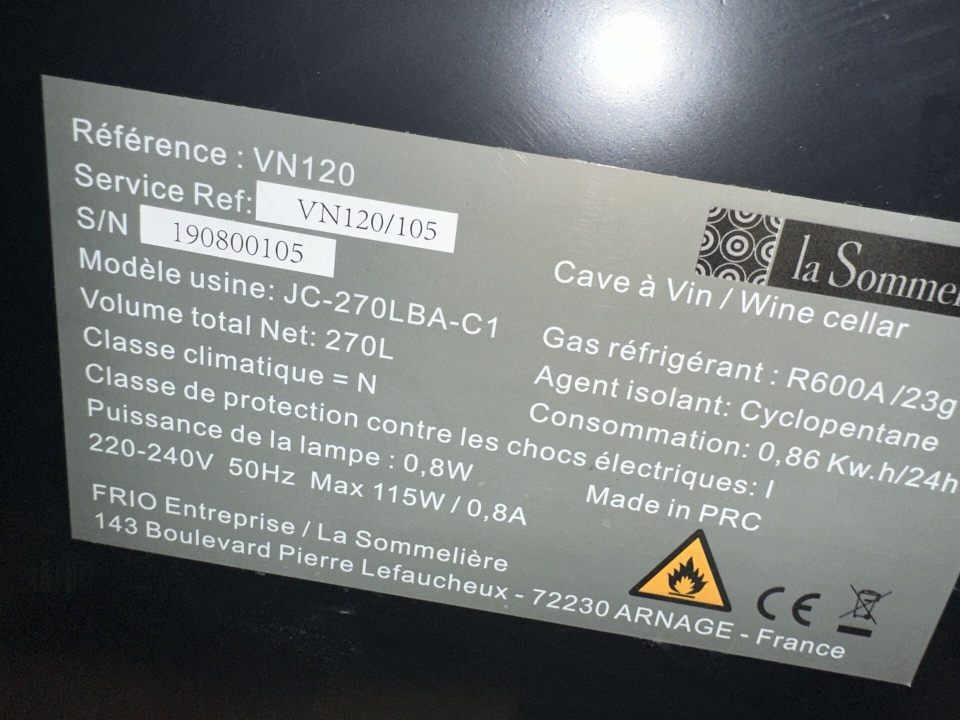 1 cave à vin LA SOMMELIERE VN 120 , 120 bouteilles, porte vitrée , 270 litres, 58 x 58 x 147 cm