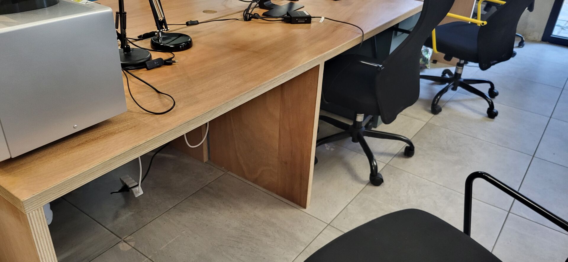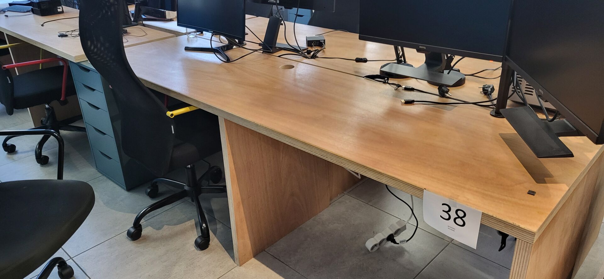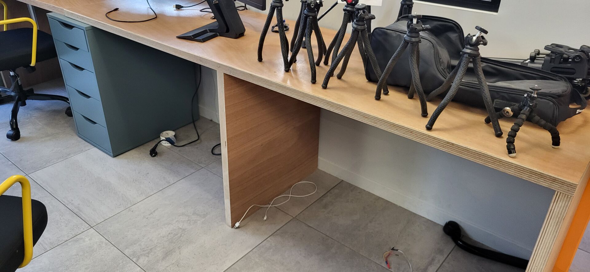 4 tables de travail contreplaqué 2 postes 220 x 60 cm et deux consoles 1 poste assorties 120 x 60 cm 2 meubles mélaminé gris à tiroirs