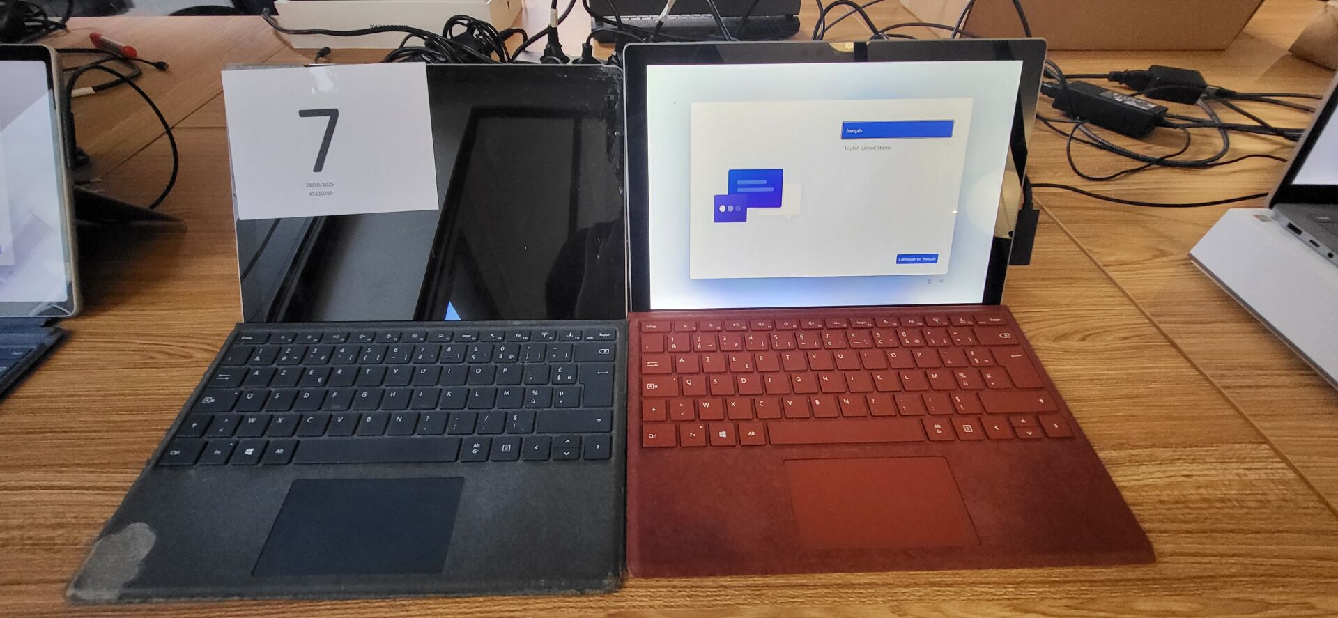 1 tablette MICROSOFT Surface Pro 6 core i5-8250 8 Go modèle 1796 - 256 Go N/S : 037740791753 avec chargeur 1 tablette MICROSOFT Surface core i5-7300 4Go, dalle accidentée sans chargeur
