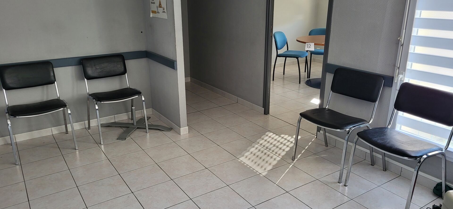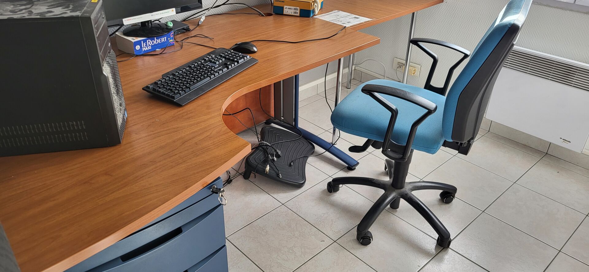 1 bureau d'angle mélaminé bois piètement métal bleu 160 x 120 cm 4 chaises simili cuir noir, 1 meuble mélaminé noir et façon bois 9 cases 108 x 30 x 109 cm 1 armoire métal gris à portes coulissantes 120 x 45 x 198 cm , 1 caisson 3 tiroirs, 1 fauteuil