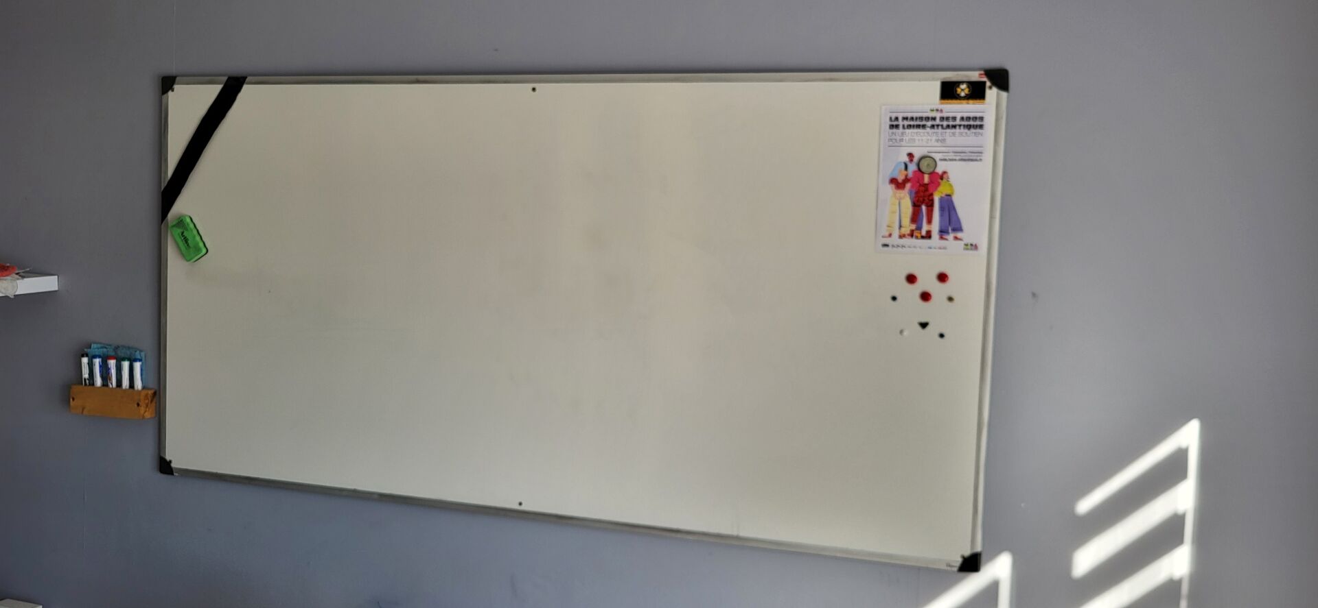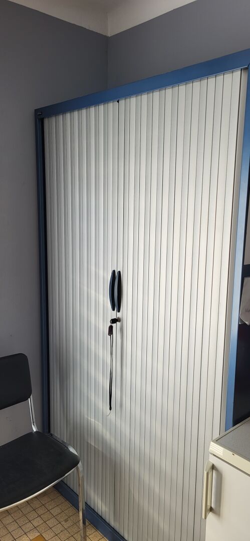 4 tables mélaminé façon bois piètement métal noir 130 x 65 cm 10 chaises simili cuir noir 1 tableau blanc 200 x 100 cm 1 armoire métal bleu à portes coulissantes 120 x 45 x 198 cm