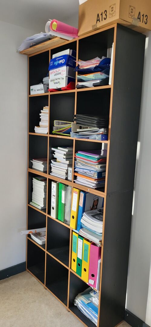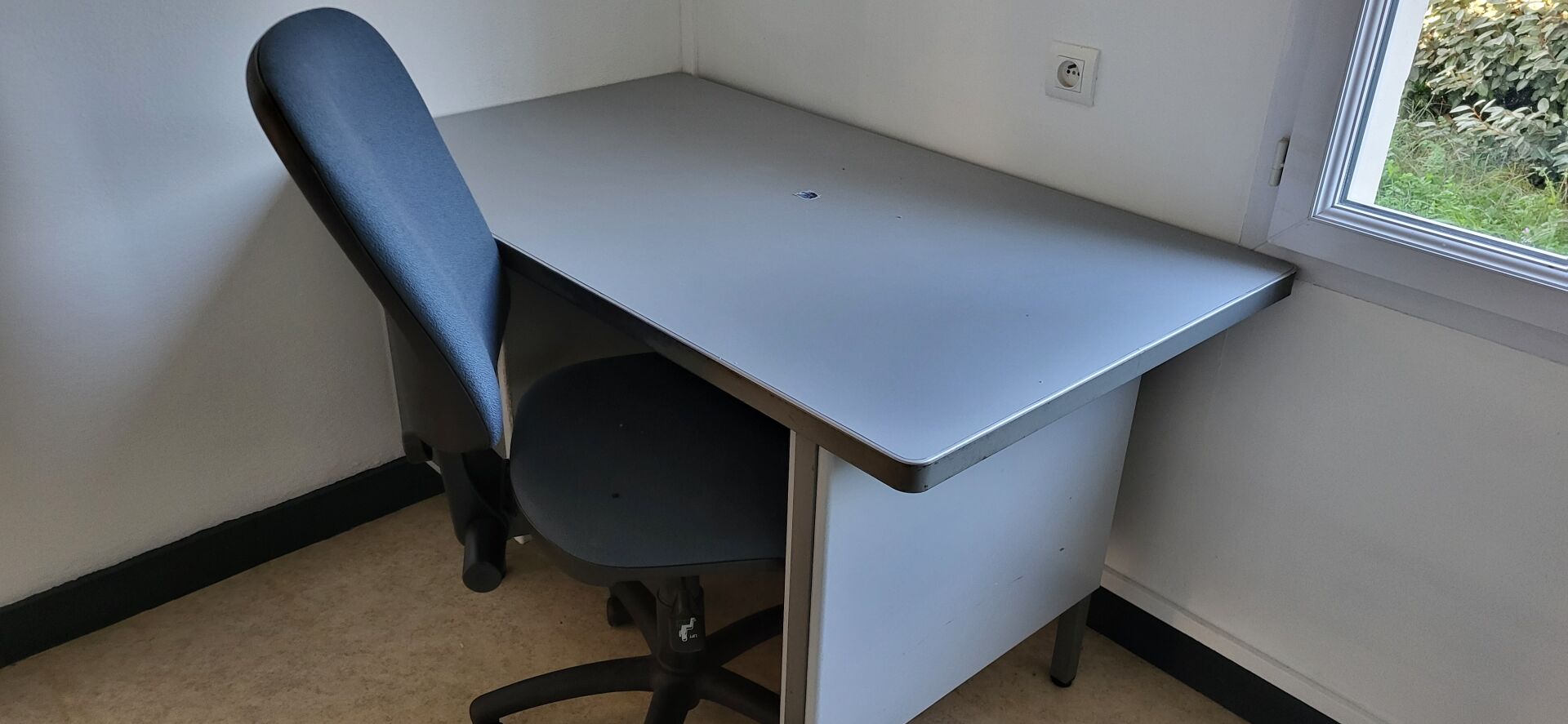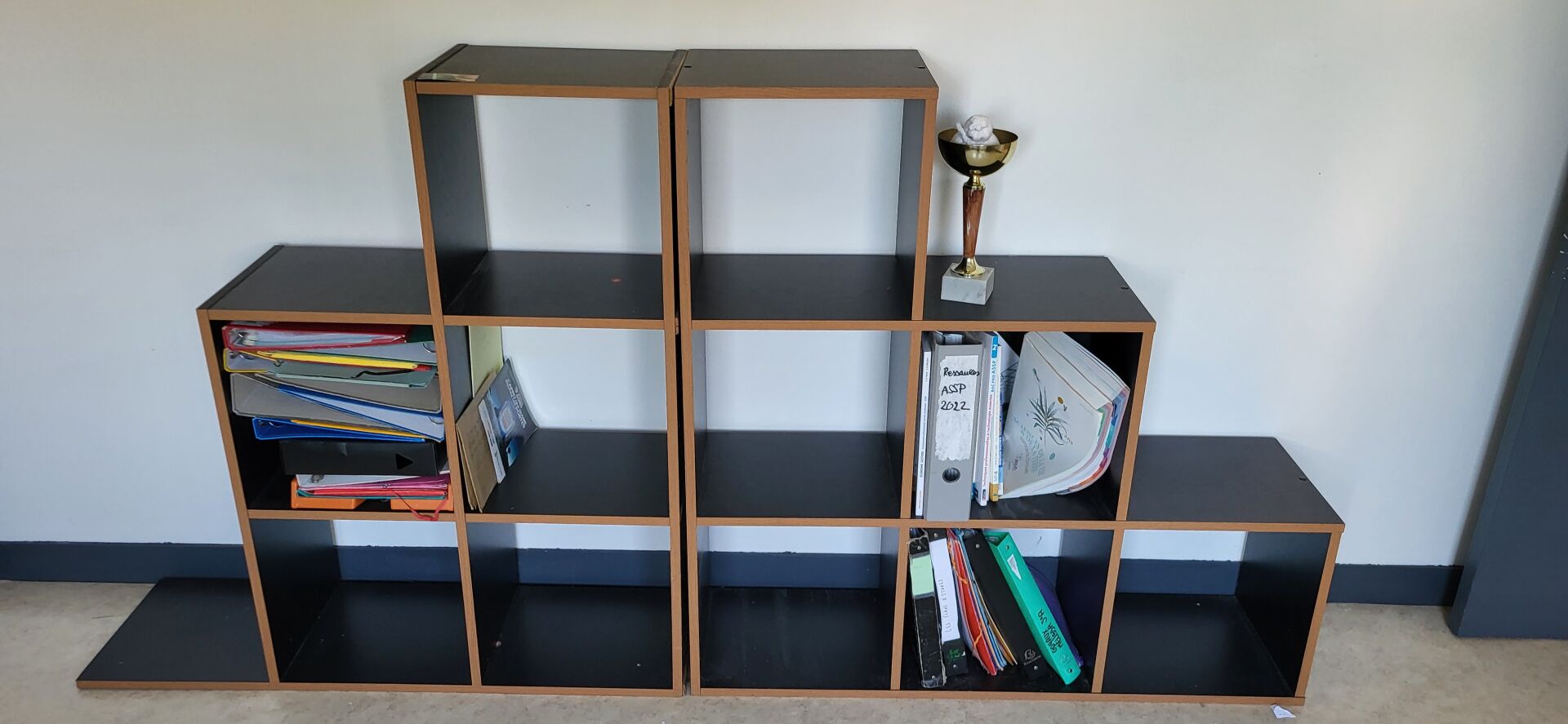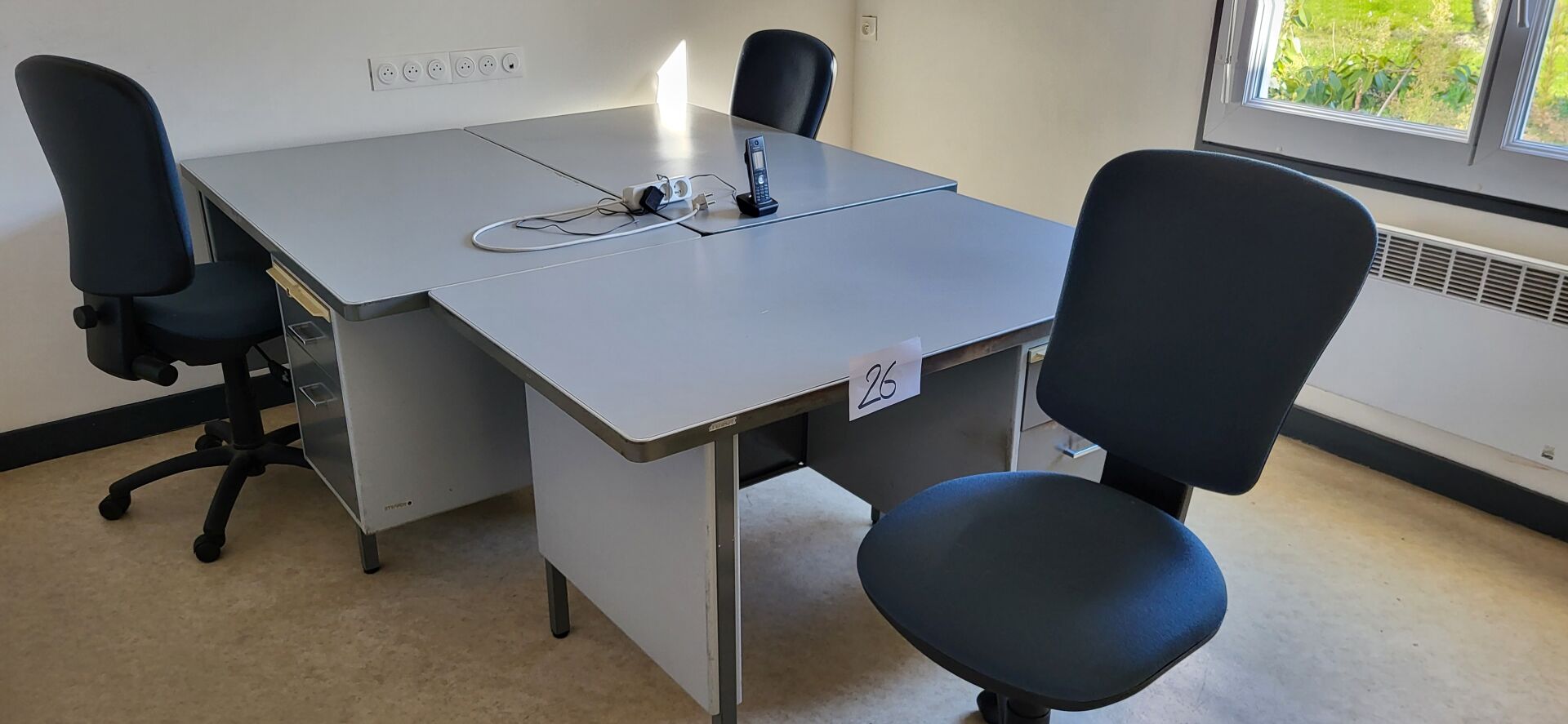 5 bureaux métal gris à caisson 2 tiroirs 130 x 75 cm 1 chaise tournante et roulante tissu bleu 1 chaise tournante et roulante tissu noir 2 meubles en escalier 6 cases 3 chaises tournantes et roulantes tissu bleu 2 meubles 9 cases mélaminé noir et façon bois