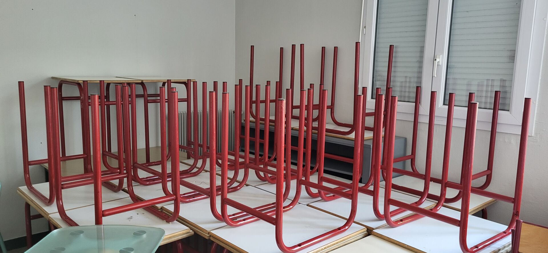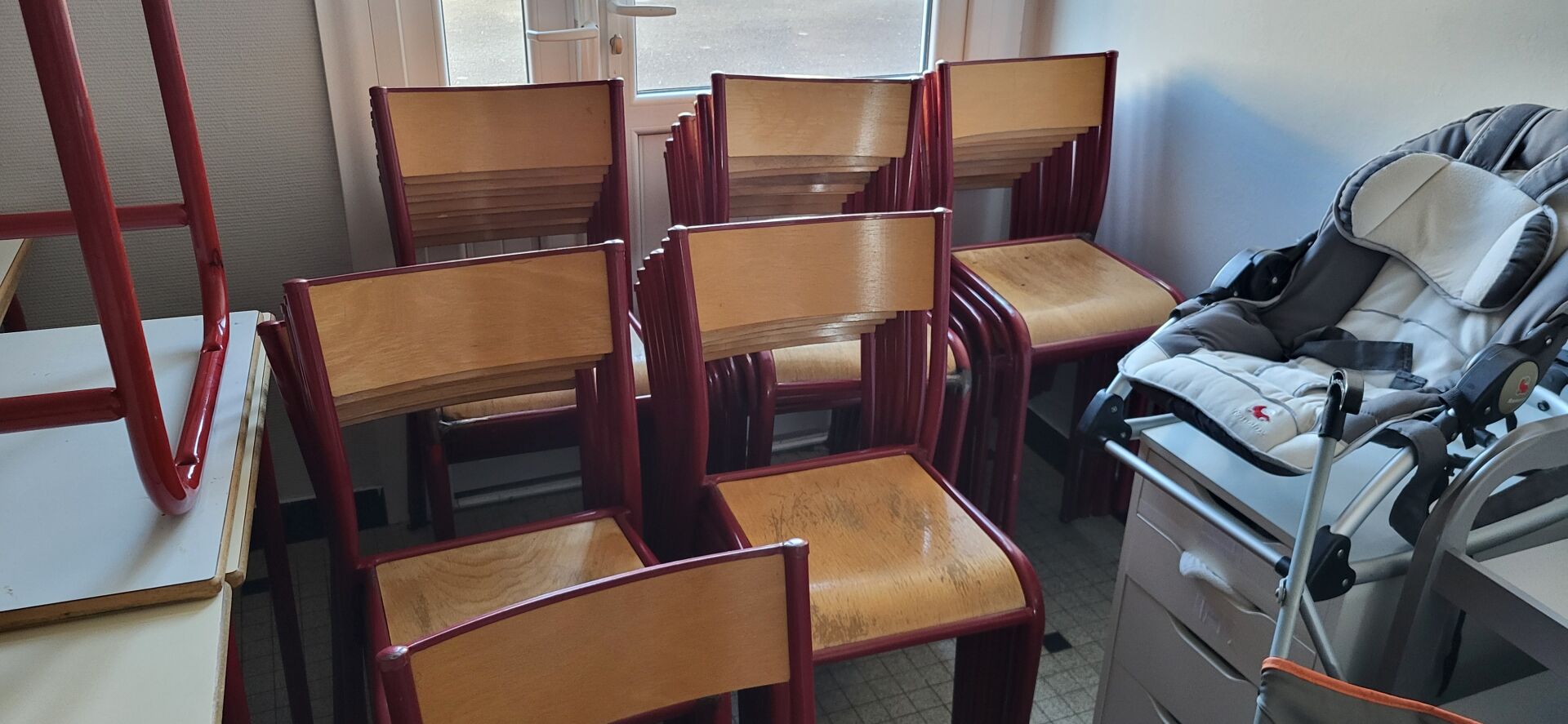 30 tables mélaminé beige piètement métal rouge 70 X 50 CM 38 chaises assorties bois