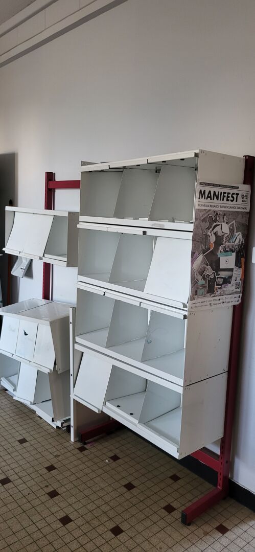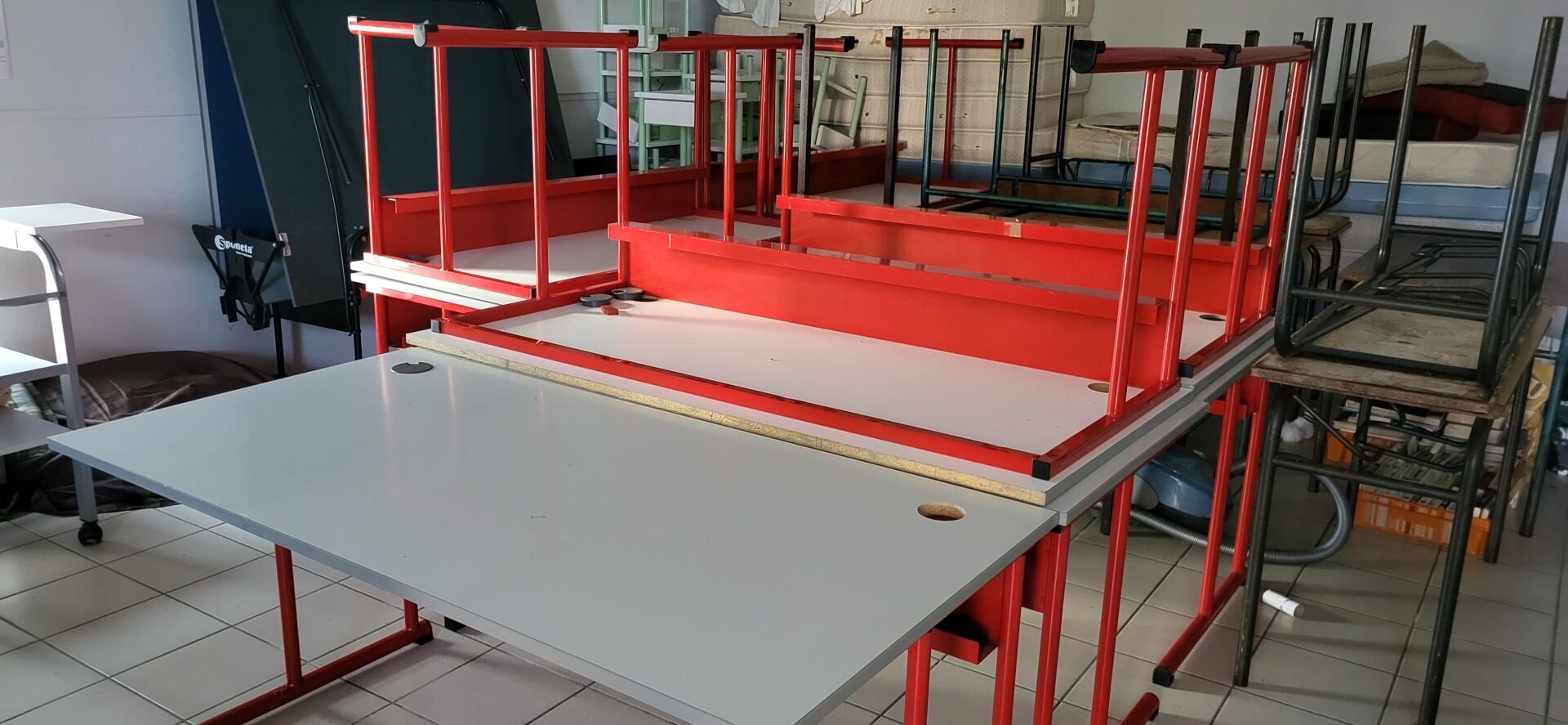 2 meubles 12 cases métal blanc et rouge 12 bureaux mélaminé beige piètement métal rouge 120 x 80 cm + 1 table 120 x 80 cm
