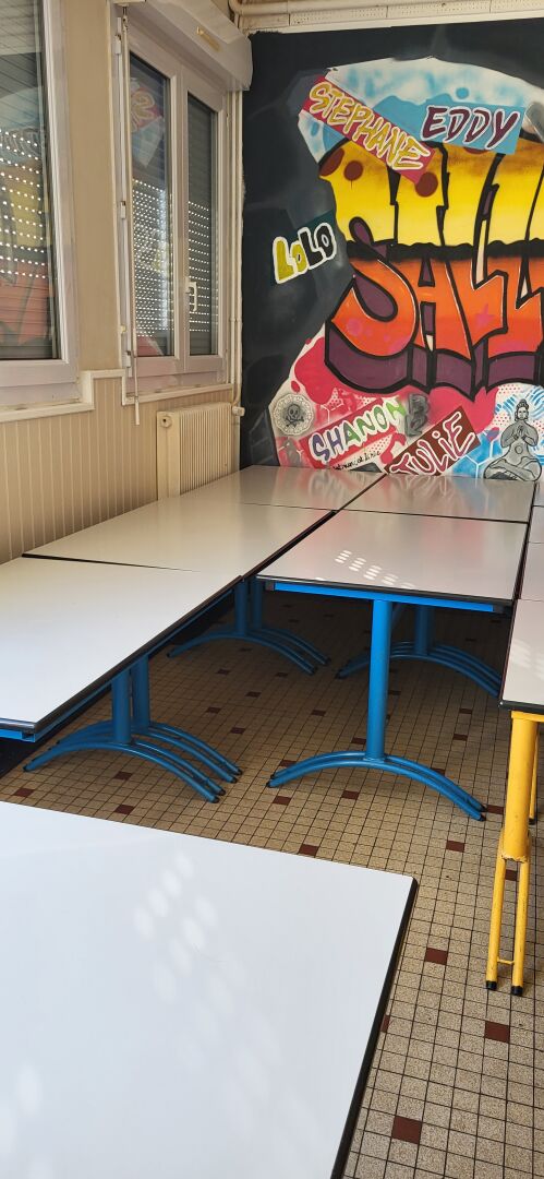 6 tables mélaminé gris piètement métal bleu 1220 x 80 cm 24 chaises métal bleu et bois