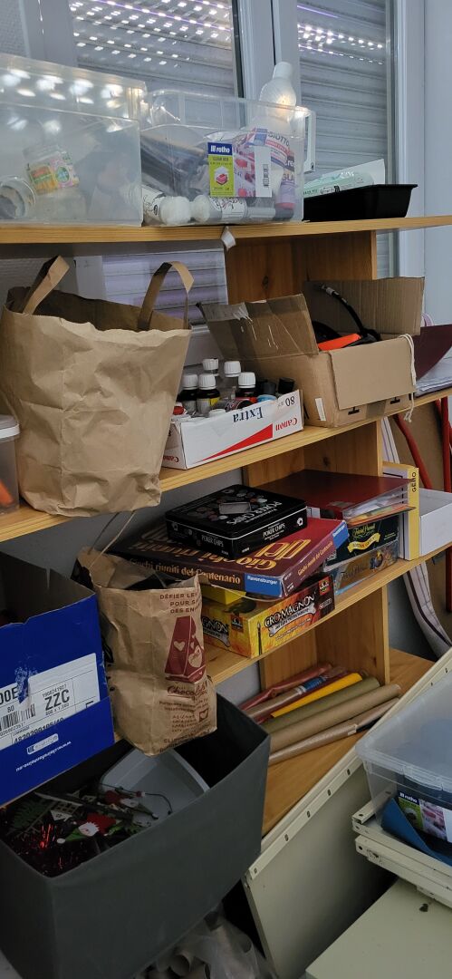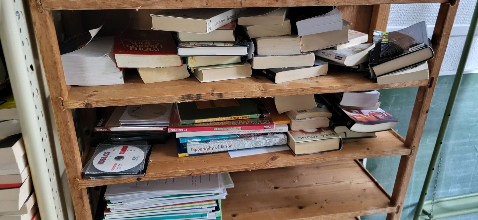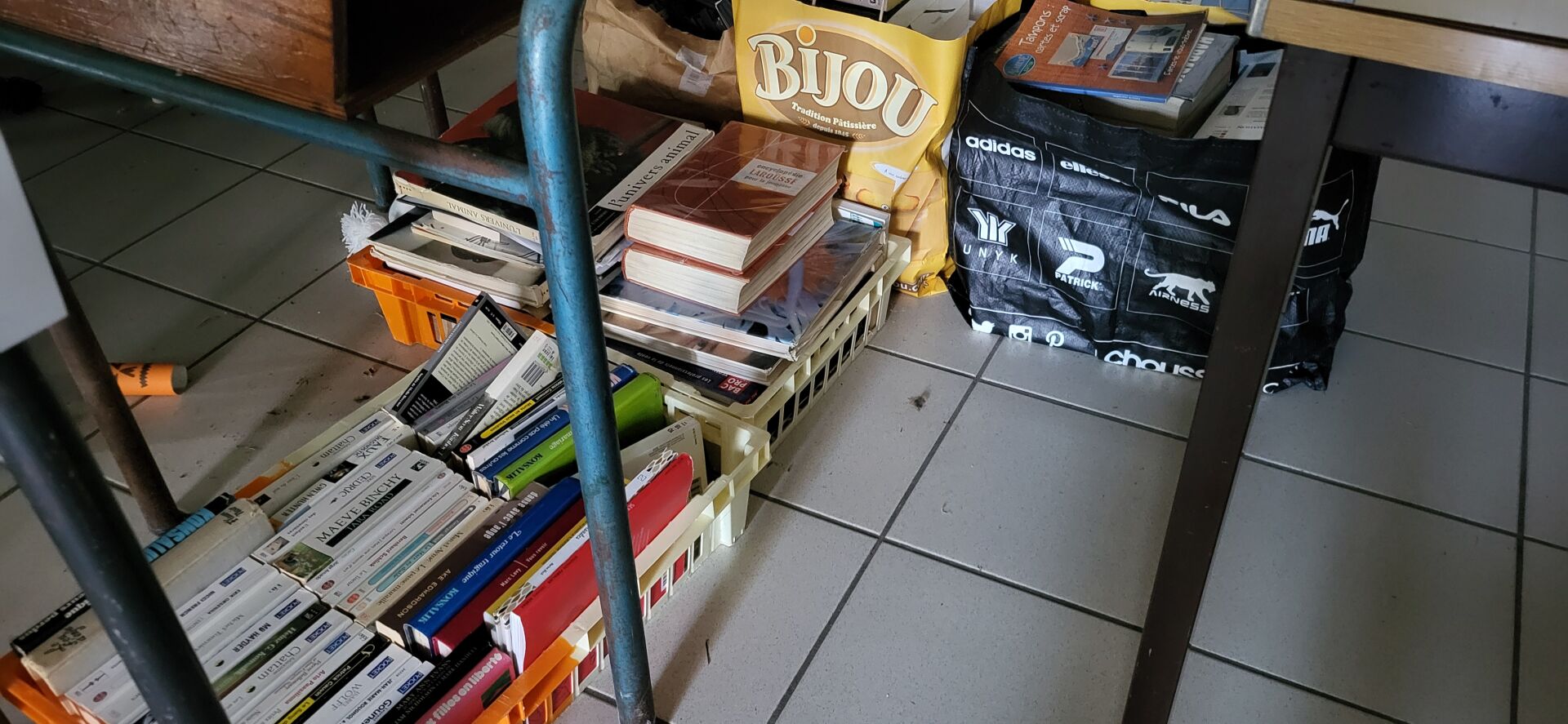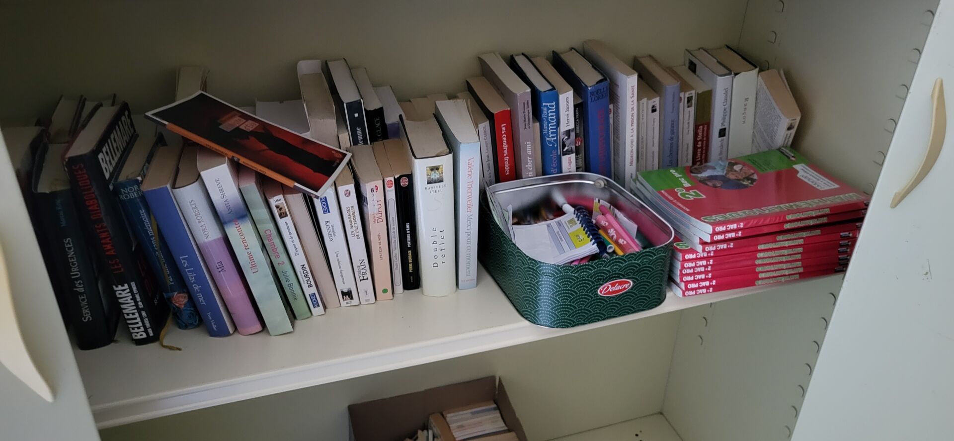 Dans 3 étagères, 1 armoire et 6 sacs et bacs au sol : environ 200 livres de lecture, d'apprentissage, traduction français/anglais HARRAP'S, grammaire BLED, dictionnaire LAROUSSE, quelques jeux de société et articles de loisirs créatifs