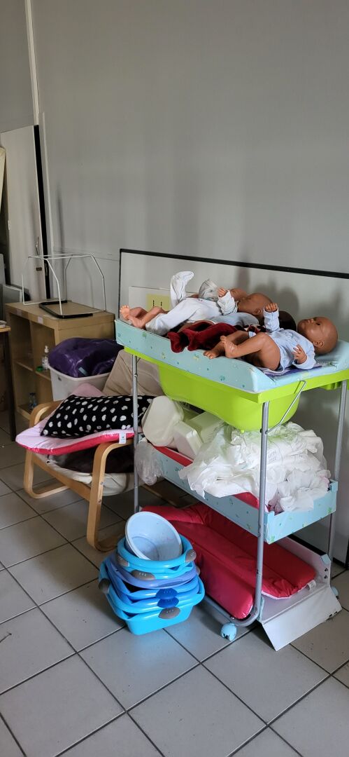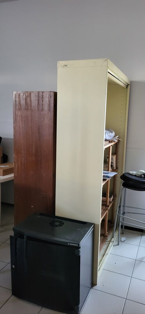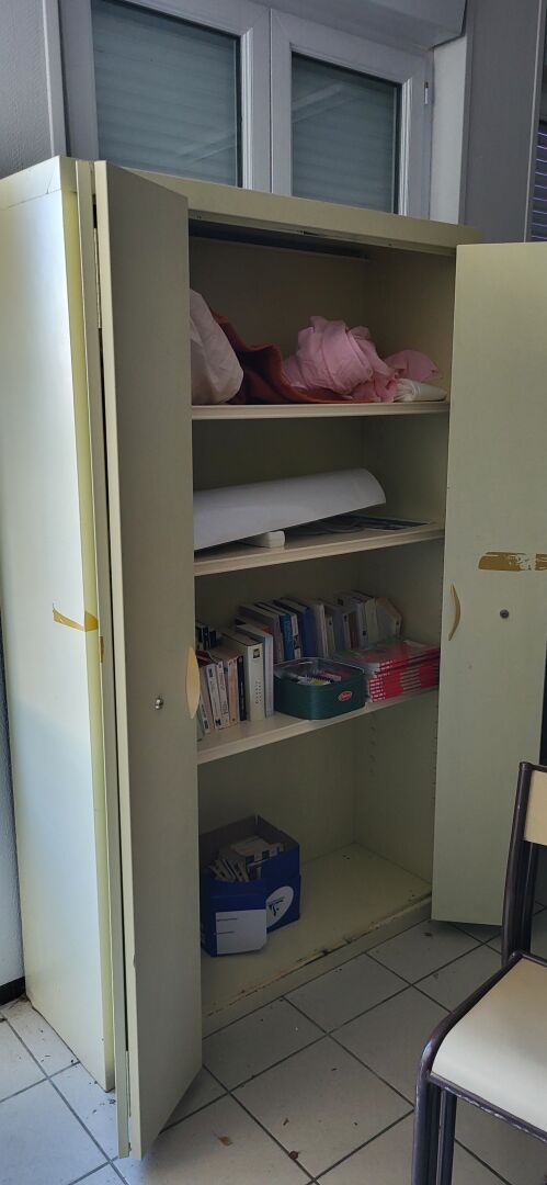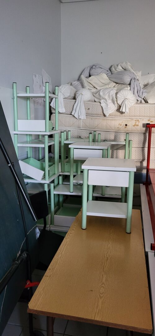 Environ 13 tables bureaux dépareillées, différentes tailles, Environ 14 chaises dépareillées, Environ 15 matelas 1 personne, Environ 18 tables de chevets mélaminé blanc piètement vert, 1 tiroir, 1 armoire métal beige, 1 étagère métal beige 4 niveaux, 1 tableau liège, 1 tableau mélaminé blanc, 1 fauteuil tissu crème piètement bois, corbeilles à papier, 1 baie de brassage