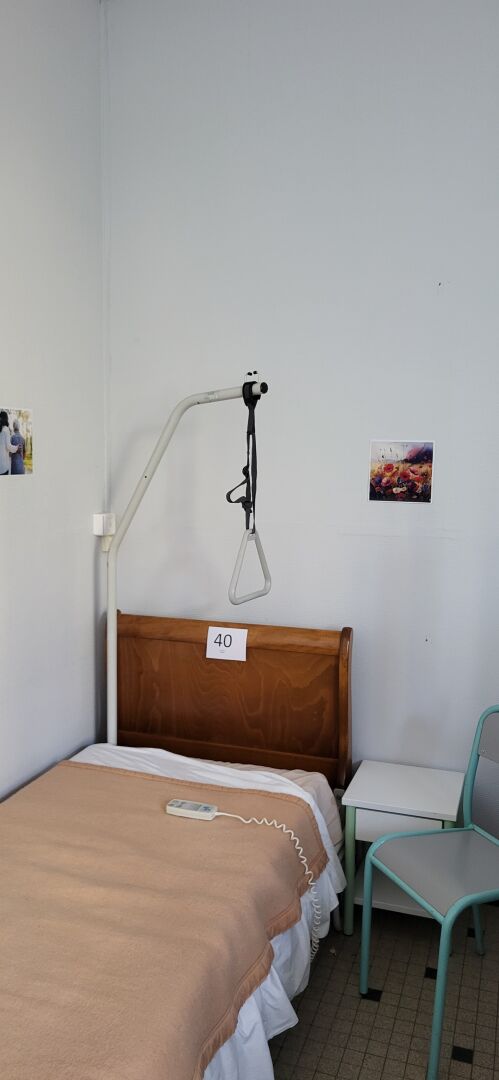 1 lit médicalisé électrique avec tête et pied de lit bois, 1 poignée lève-personne 220 x 95 cm SOTEC MEDICAL , 1 table de chevet, 1 chaise