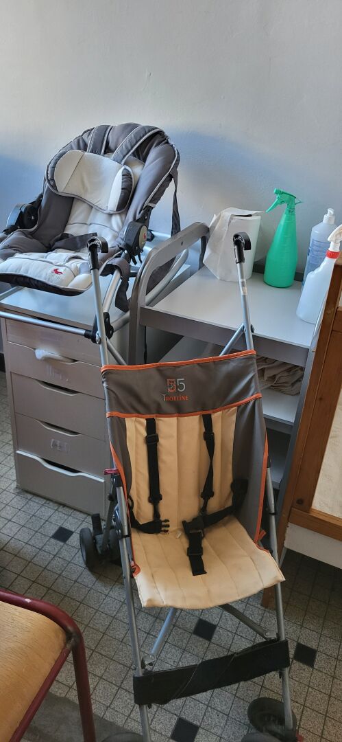 1 lit bébé en bois avec table à langer et rangement 195 x 66 x 100 cm, 1 desserte mobile métal gris, 1 meuble 5 tiroirs mélaminé gris avec contenu (bodies, gilets, chaussettes etc) , 1 cosy RENOLUX, 1 poussette TROTTINE, 1 pot et 1 siège de bain