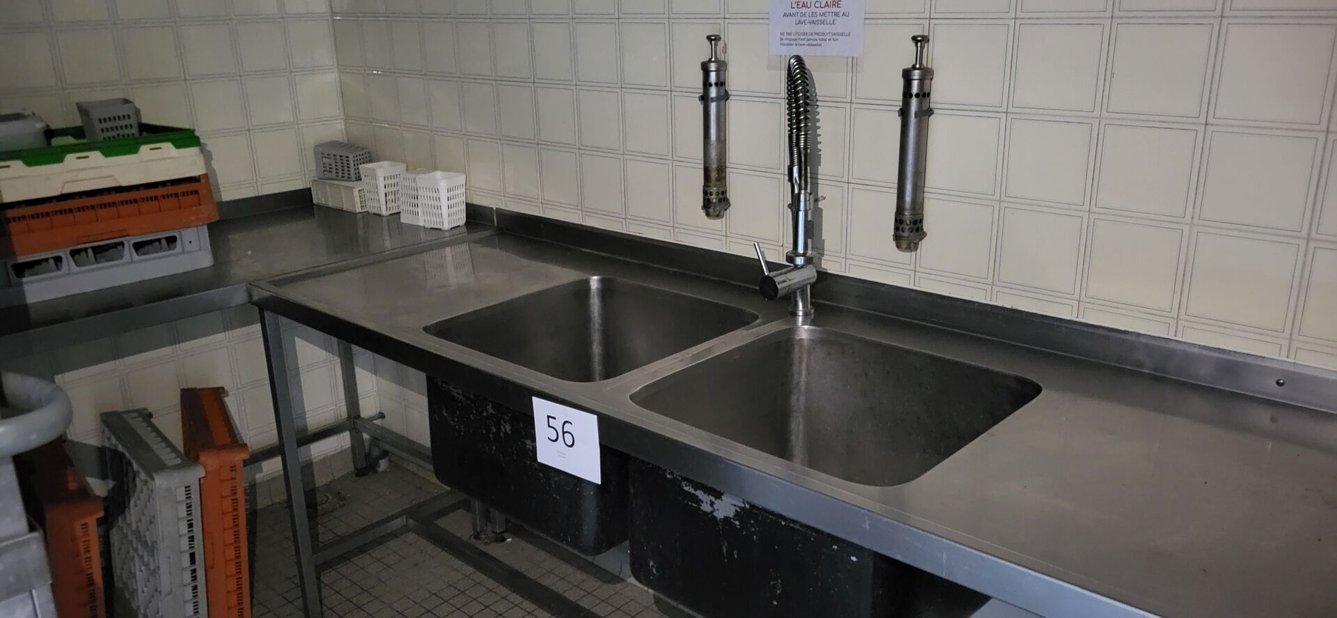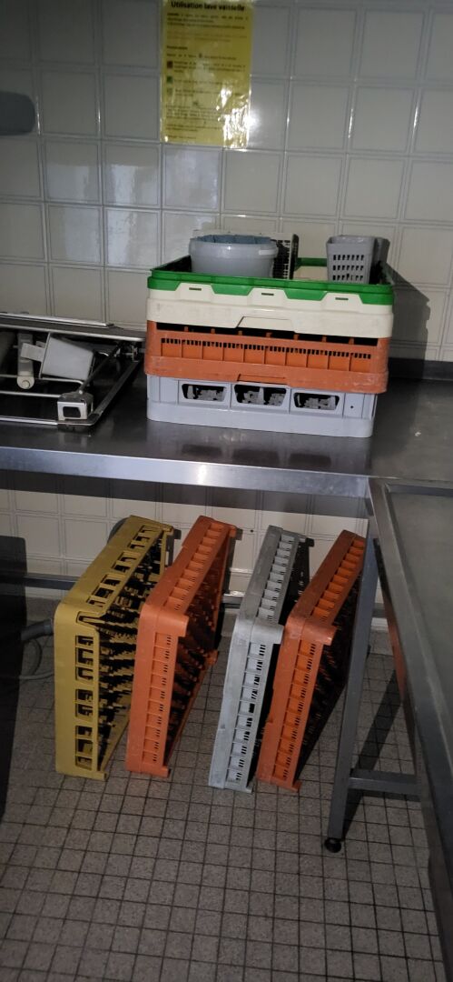 1 lave-vaisselle inox à capot WINTERHALTER GS 502 - N/S :1036008 76 X 80 X 160 cm, 7 paniers de 50 x 50 cm, 1 table inox 210 x 70 cm à démonter proprement en respectant l'étanchéité , prévoir pose de bouchons de plomberie 1 plonge inox 2 bacs avec douchette 210 x 70 cm à démonter proprement en respectant l'étanchéité , prévoir pose de bouchons de plombier