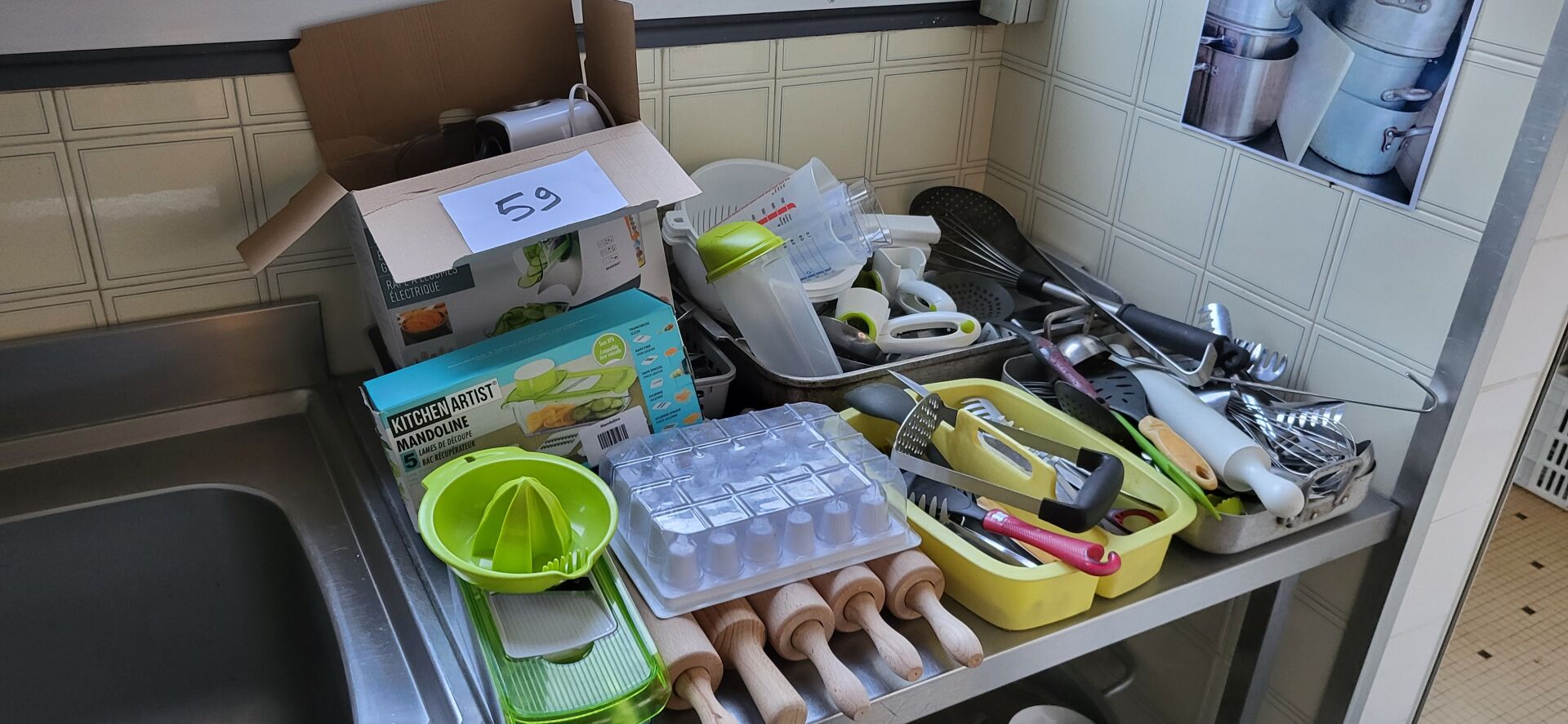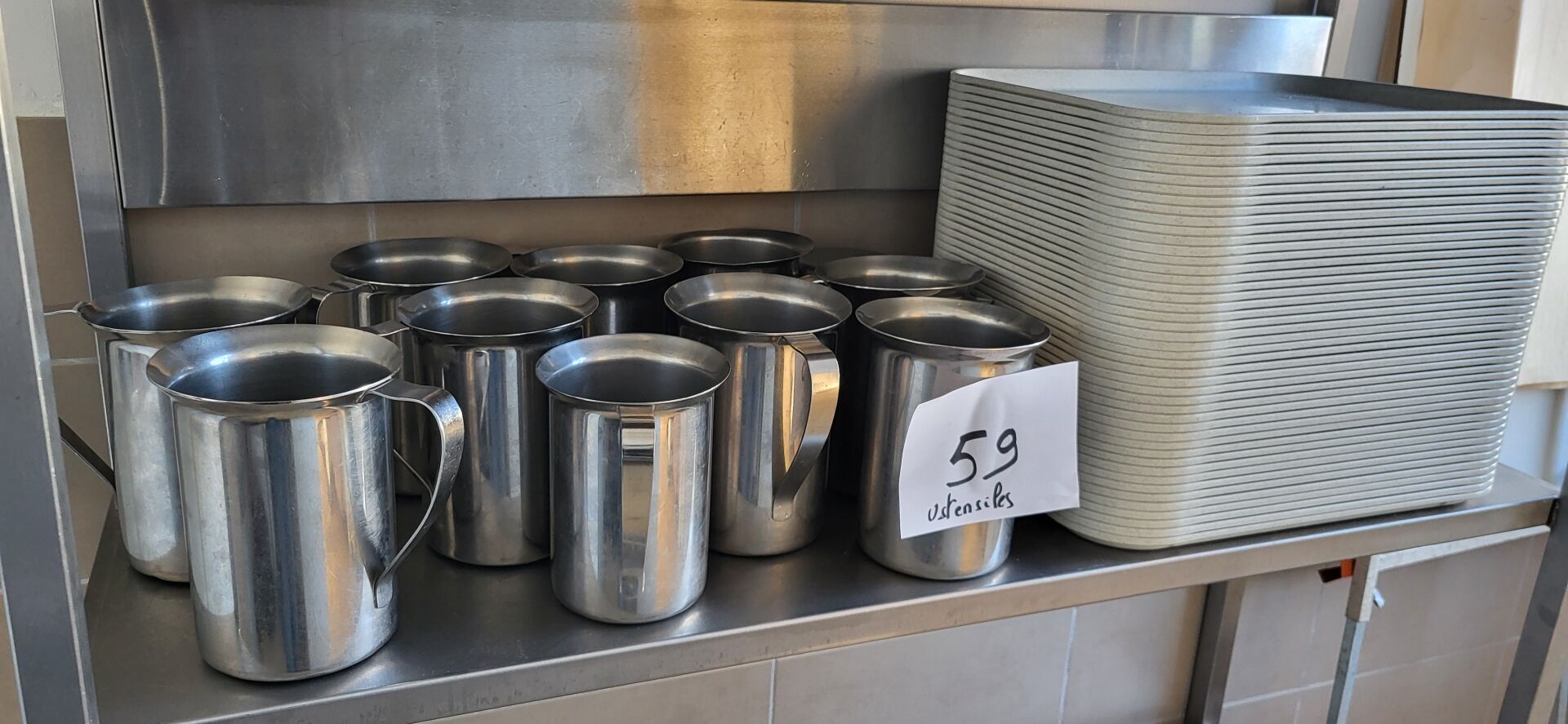 1 lot d'ustensiles de cuisine dont faitouts, passoires, casseroles, poêles, plats inox, saladiers, pichets inox, rouleaux à patisserie, environ 50 plateaux PVC blanc 46 x 36 cm 1 râpe à légumes électrique SILVERCREST 1 mandoline etc