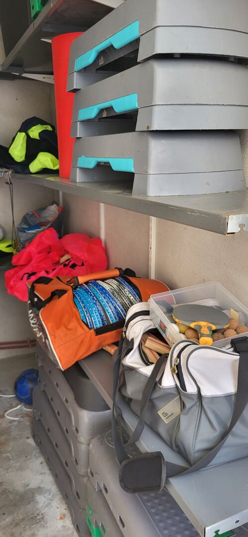 1 lot de matériel de sport dont 10 steps, 12 ballons, 30 raquettes de badminton, éléments pour jongler, filets, 2 trampolines, ... etc avec étagères murales