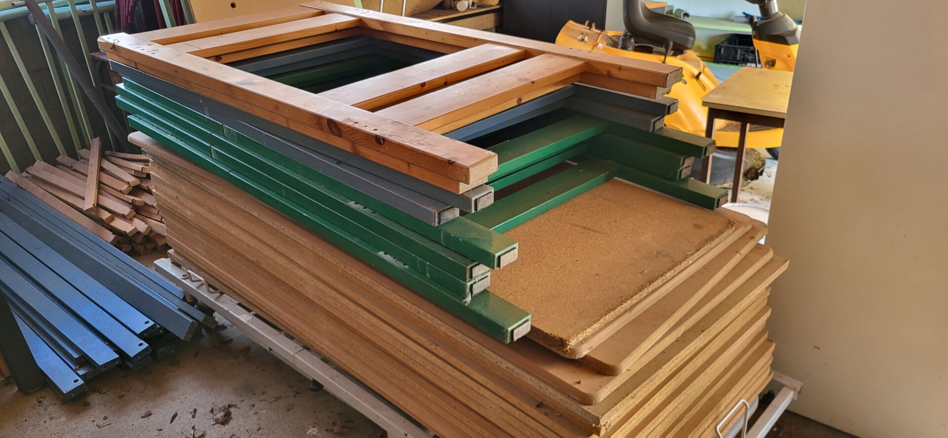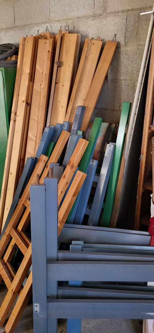 4 lits superposés en bois dont teintés 15 lits simples 1 personne en bois dont teintés le tout démonté, stocké dans le garage