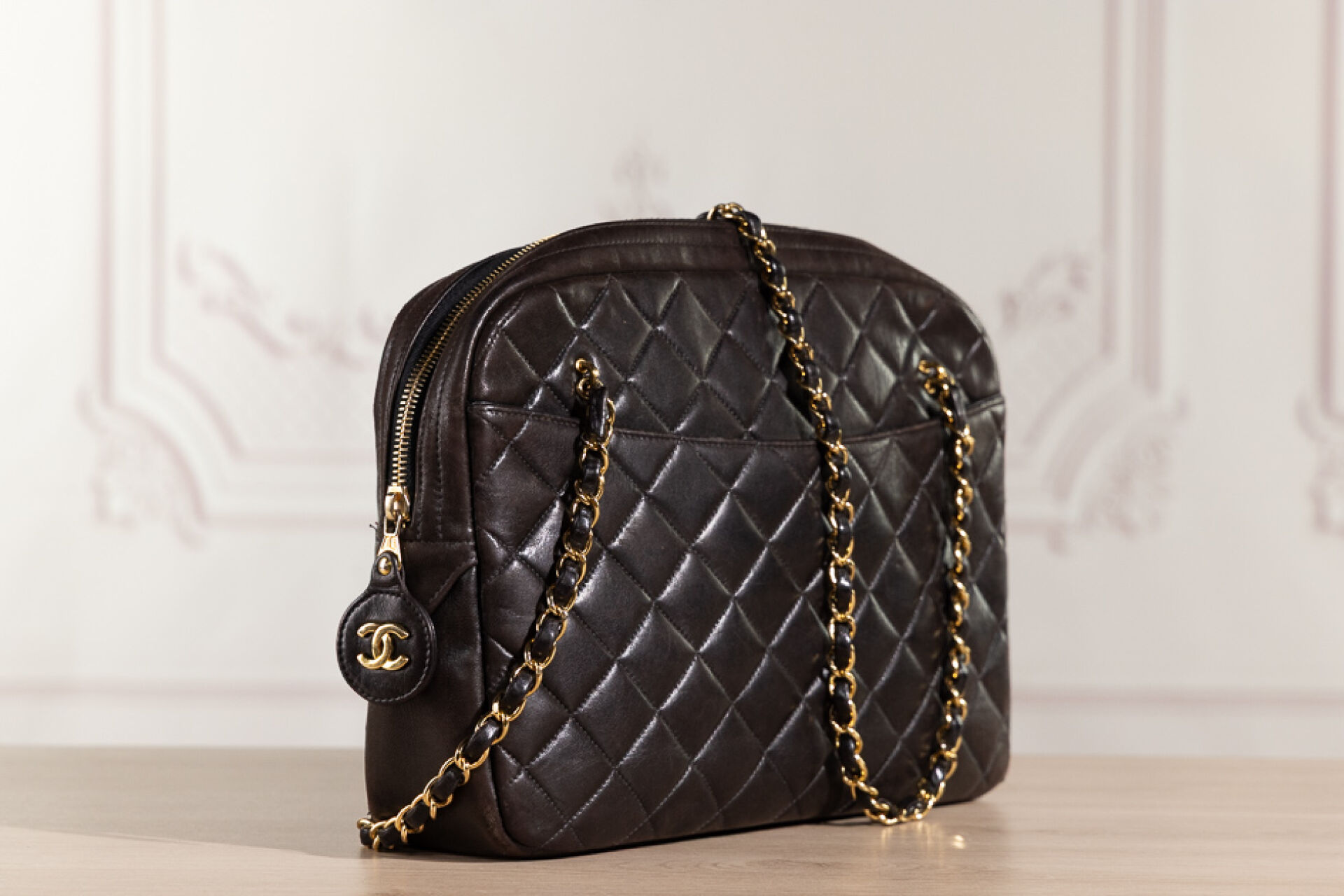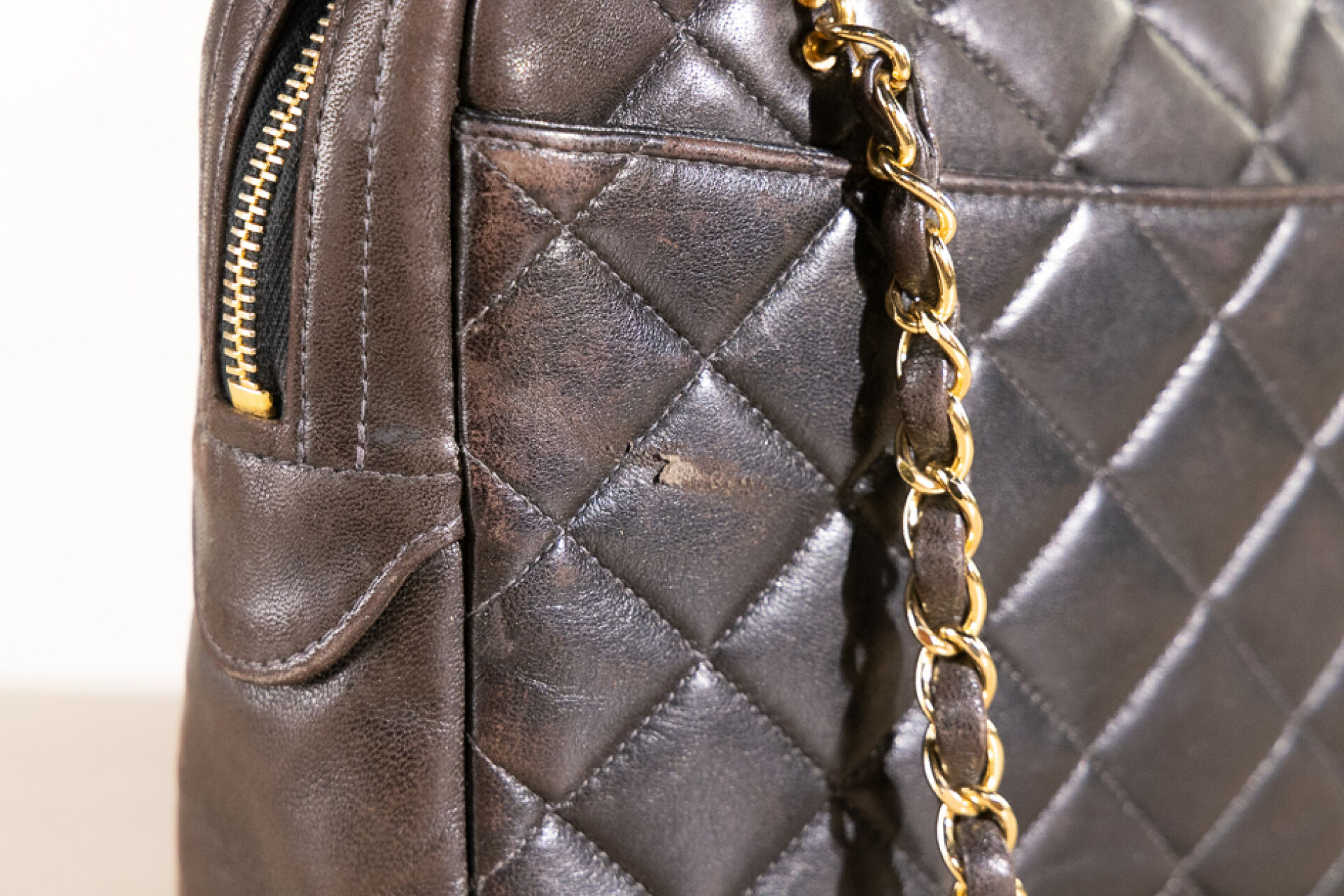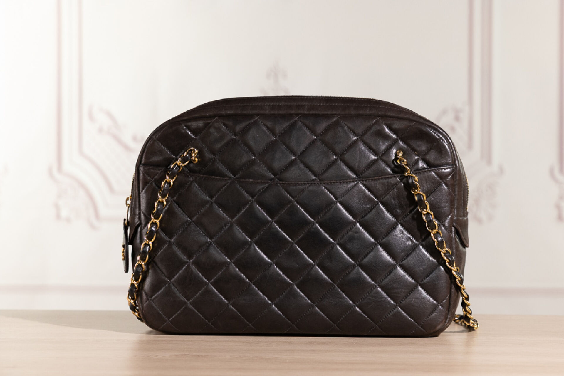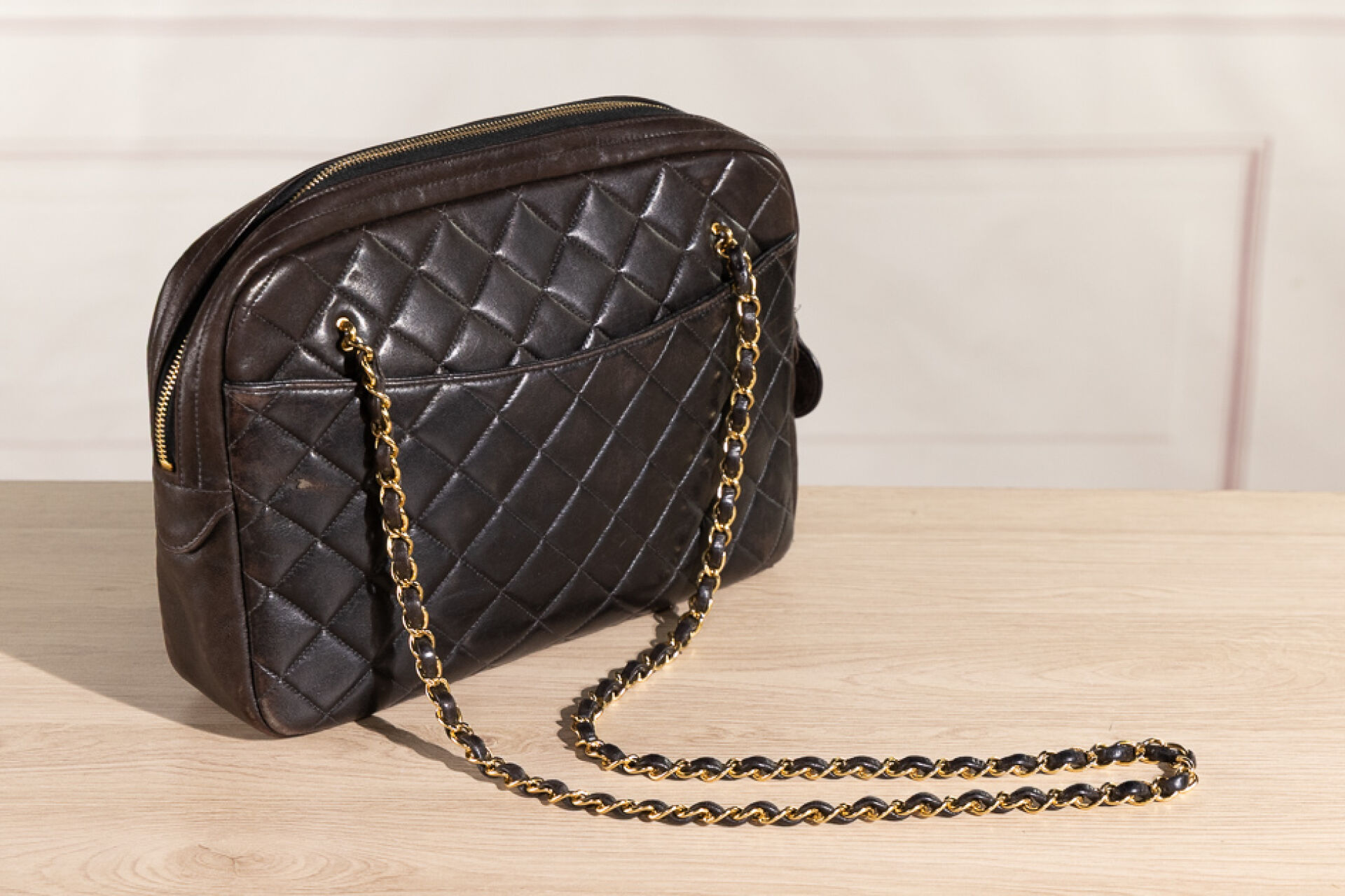 CHANEL, circa 1997-1999 - Sac "Camera" en cuir matelassé marron, double anse chaine en métal doré entrelacé de cuir à la couleur, fermeture à glissière, tirette sigle sur cercle cuir, poche plaquée de part et d'autre, doublure en cuir bordeaux. Tampon or Chanel made in France. hologramme 5556164 Haut. : 20 cm - Long. : 30 cm Usures, accrocs, décoloration