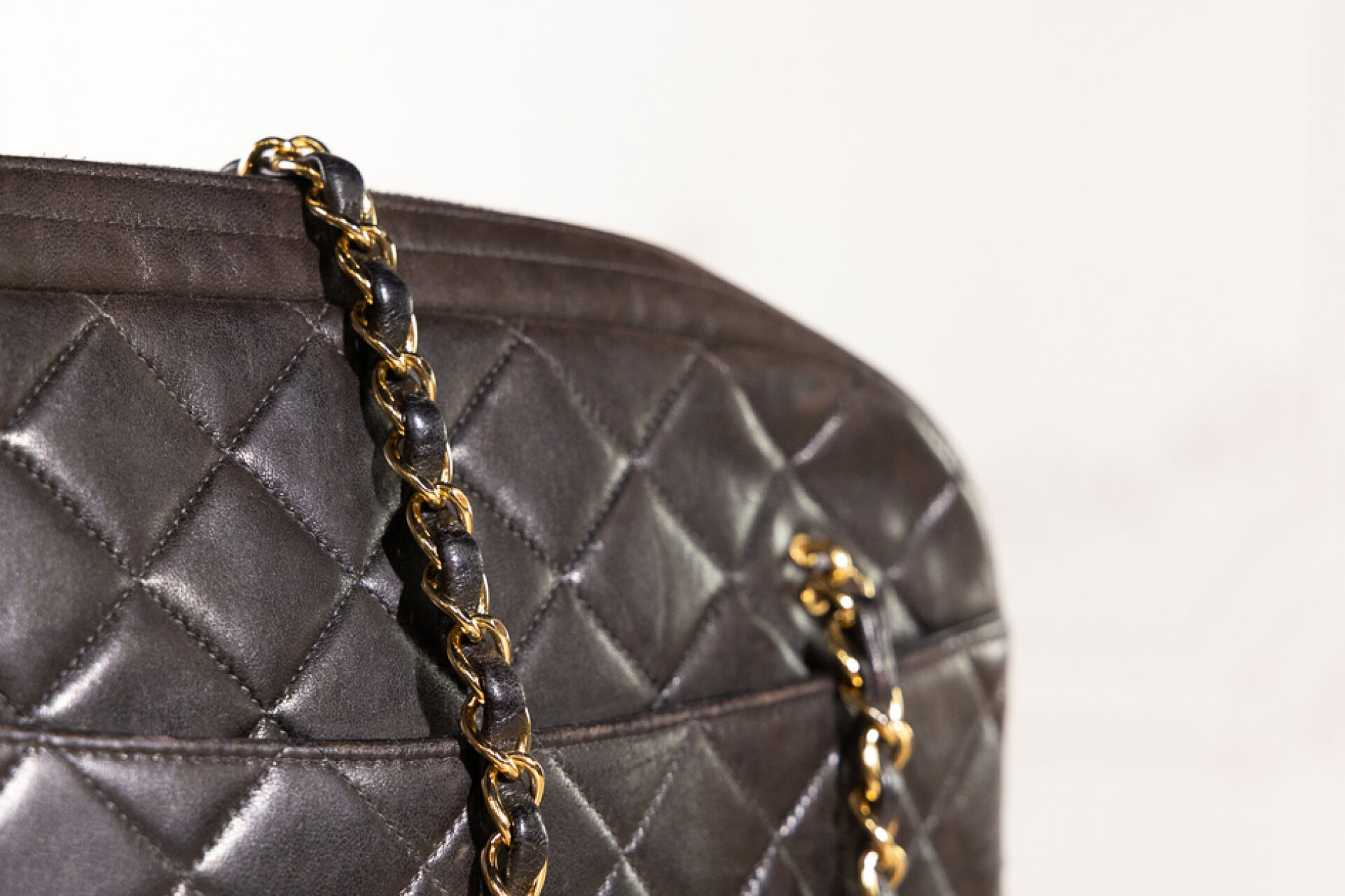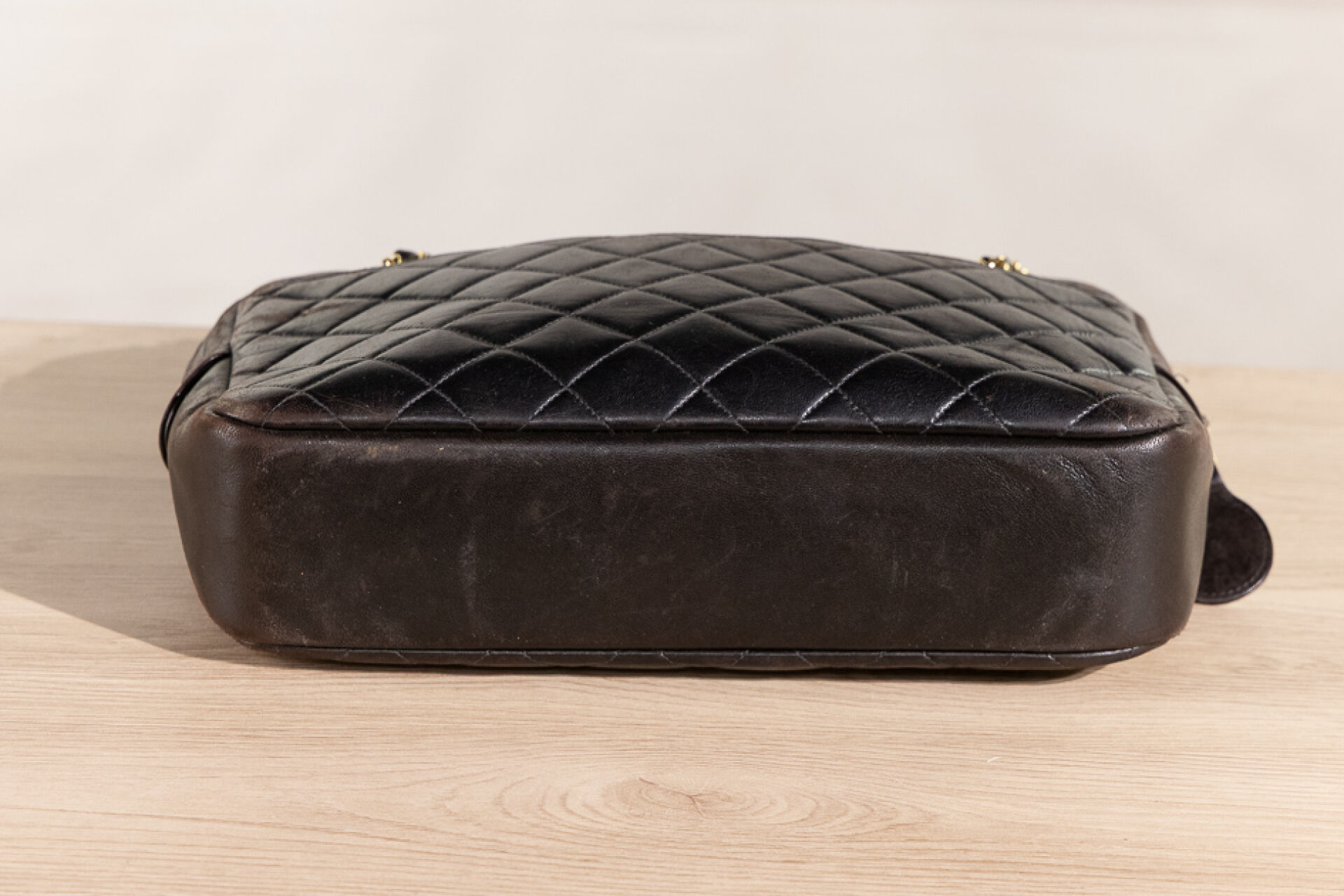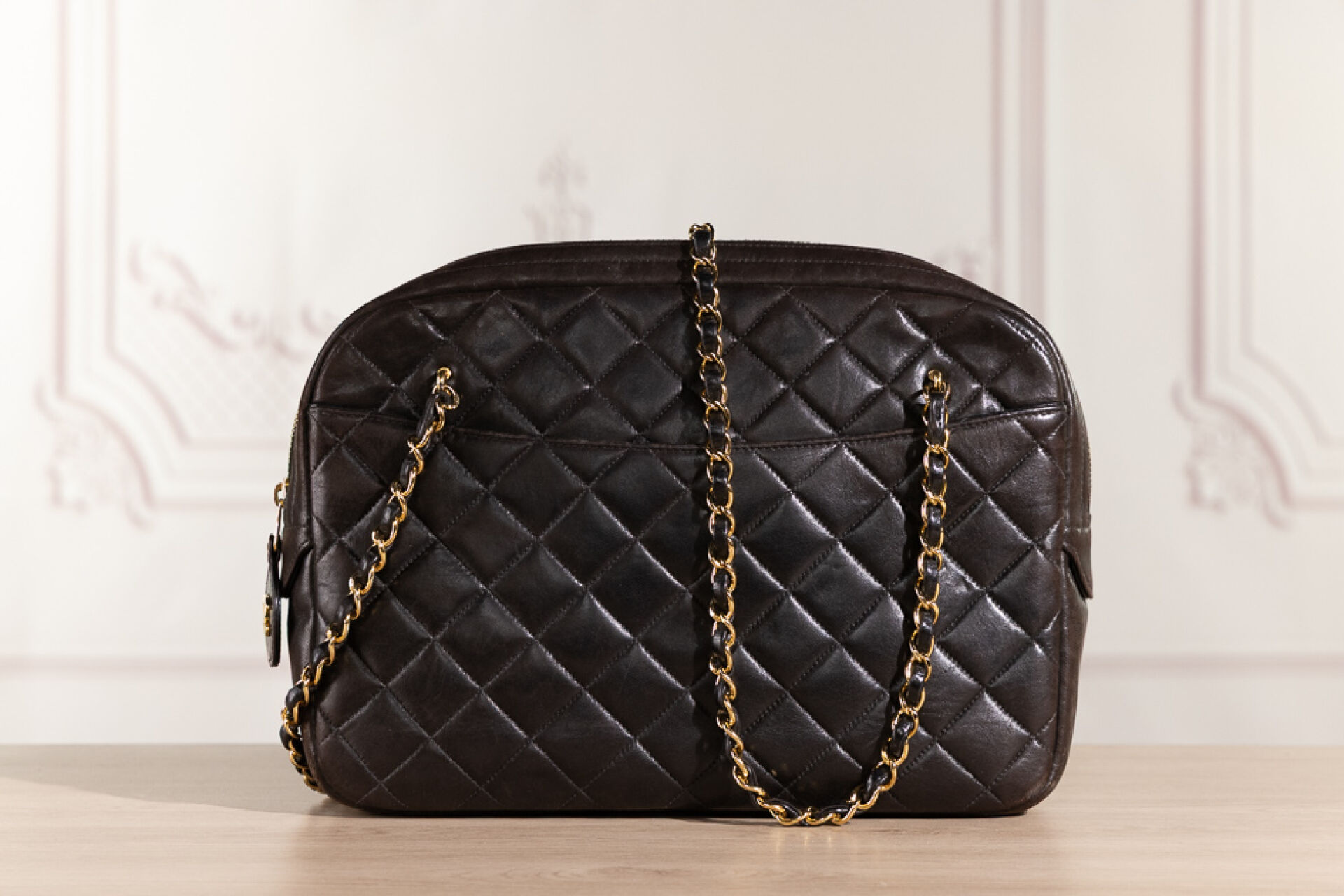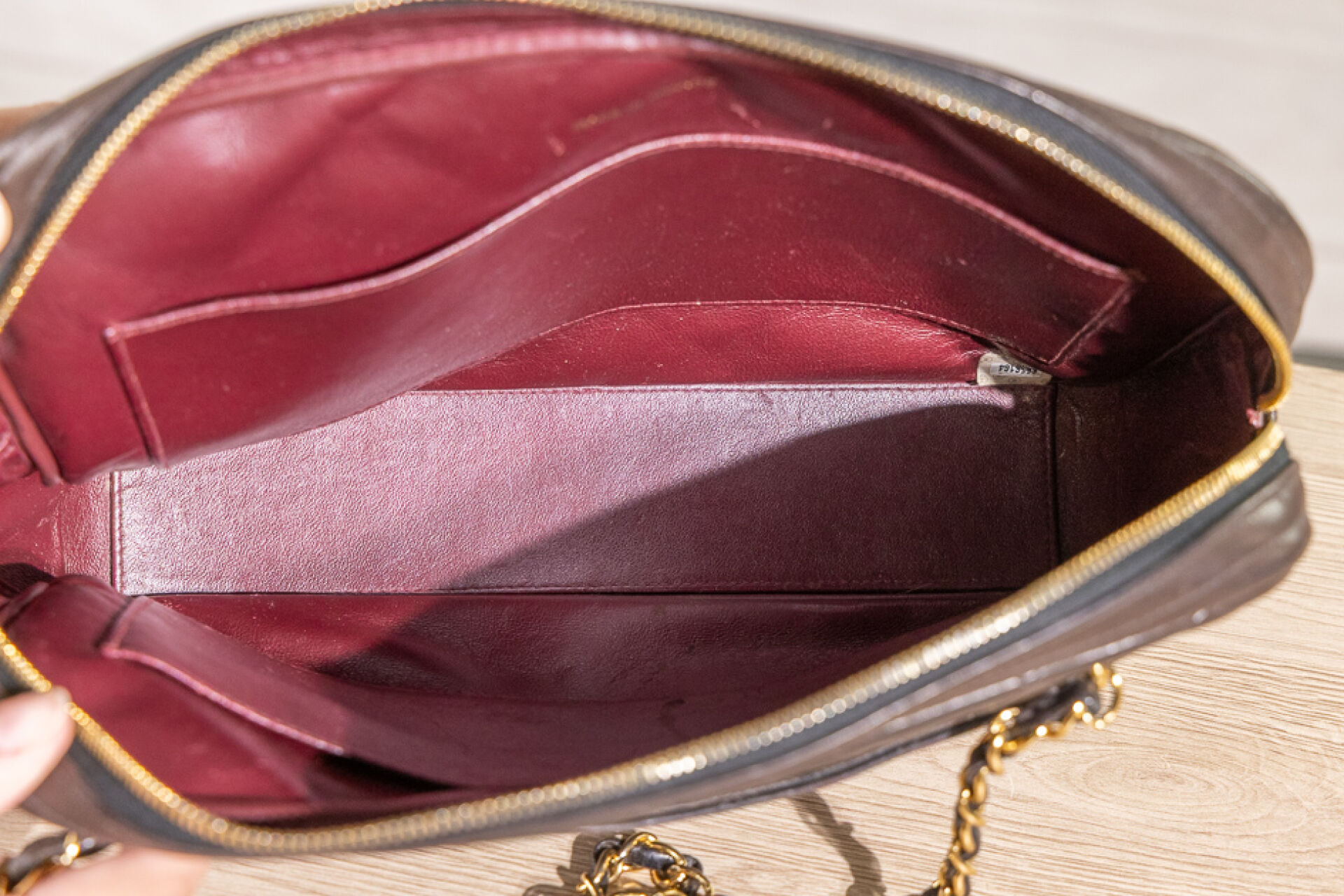 CHANEL, circa 1997-1999 - Sac "Camera" en cuir matelassé marron, double anse chaine en métal doré entrelacé de cuir à la couleur, fermeture à glissière, tirette sigle sur cercle cuir, poche plaquée de part et d'autre, doublure en cuir bordeaux. Tampon or Chanel made in France. hologramme 5556164 Haut. : 20 cm - Long. : 30 cm Usures, accrocs, décoloration