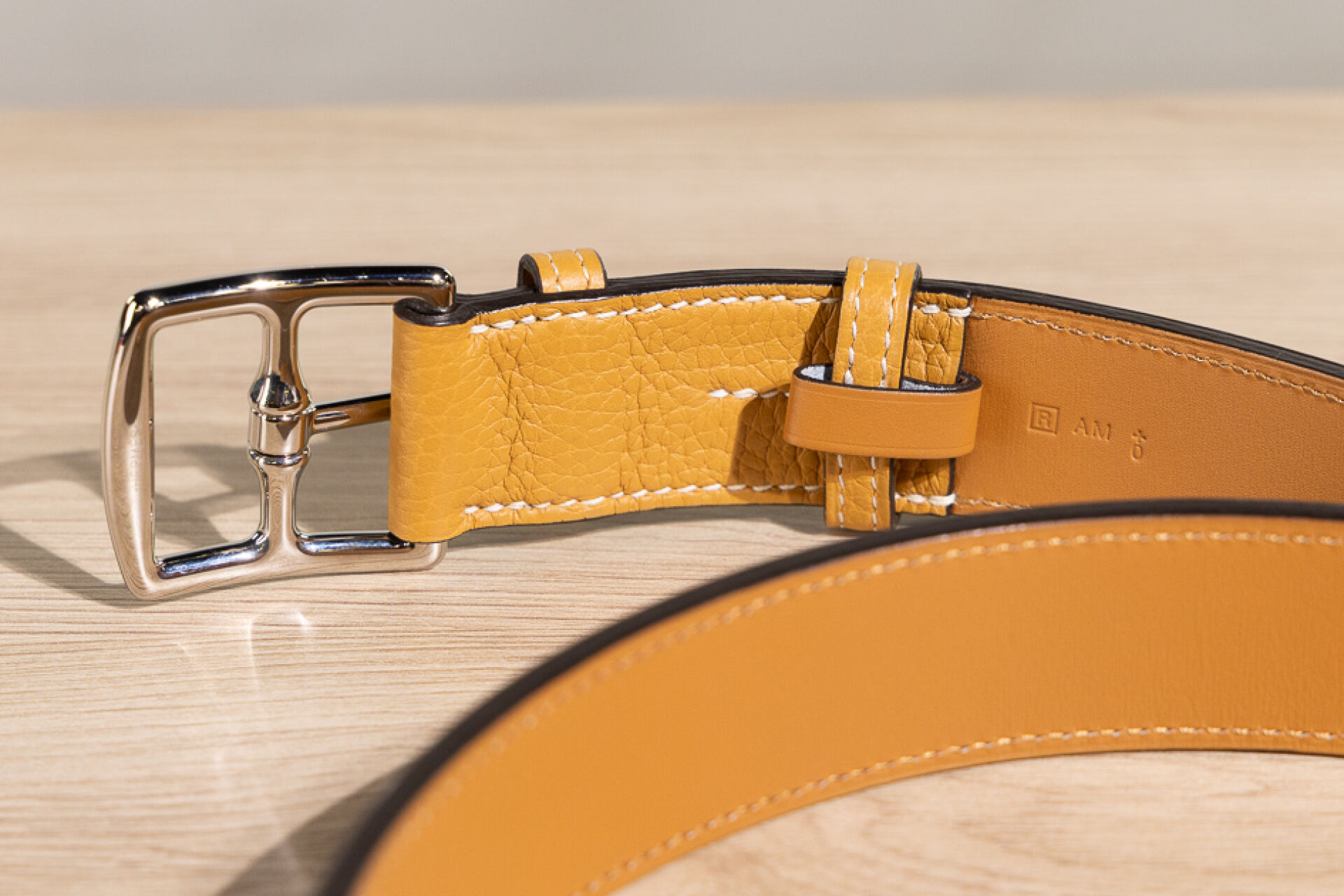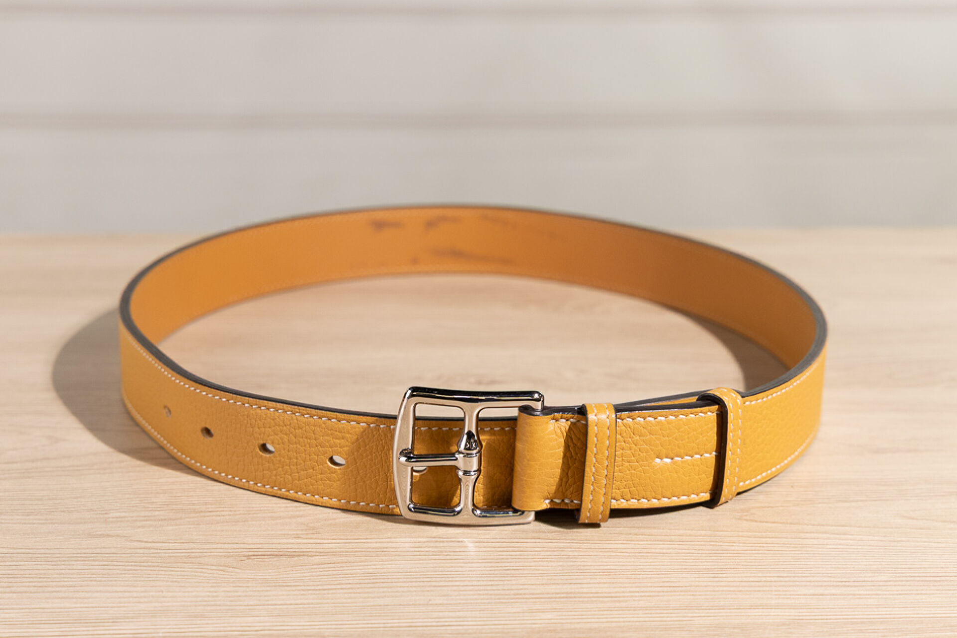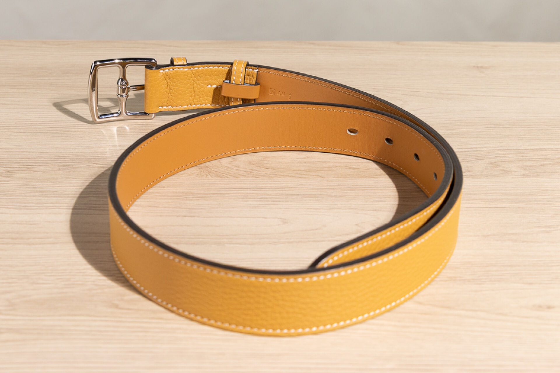 HERMES Paris Made in France, circa 2014 - Ceinture modèle "Etrivière", cuir grainé gold, boucle métal chromé. Long totale : 94 cm Très bon état, très peu portée