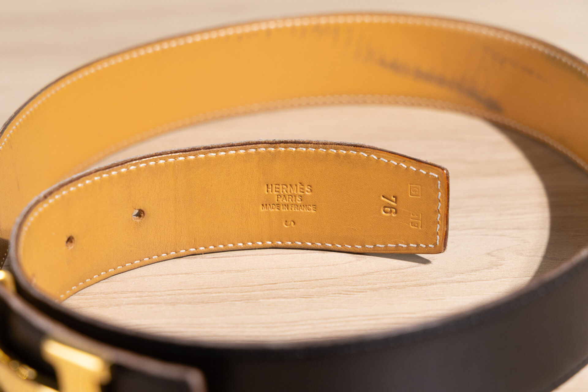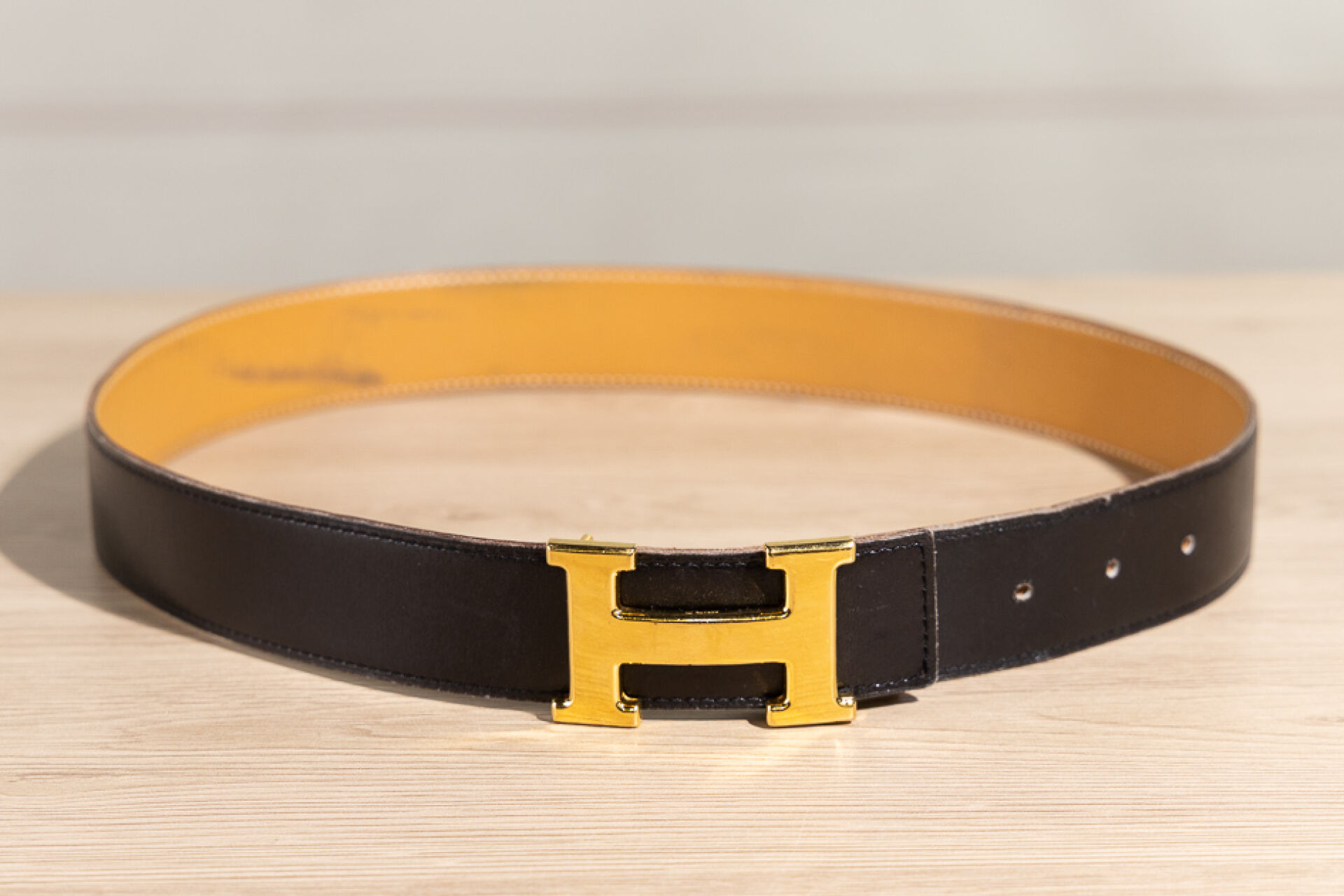 HERMES Paris Made in France, circa 2003 - Ceinture réversible cuir noir et gold, boucle H en métal doré. Taille 76 Petites usures et rayures au H