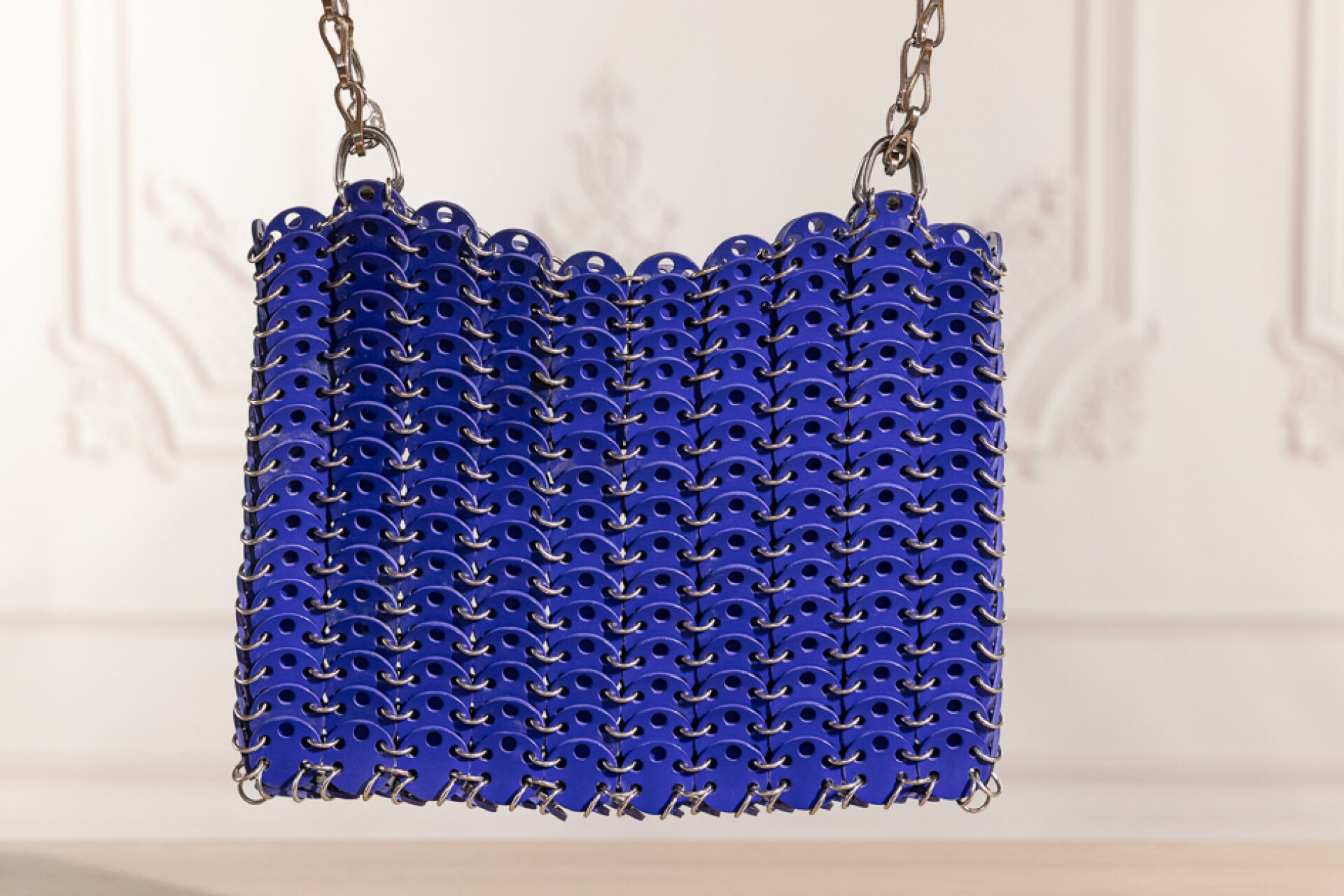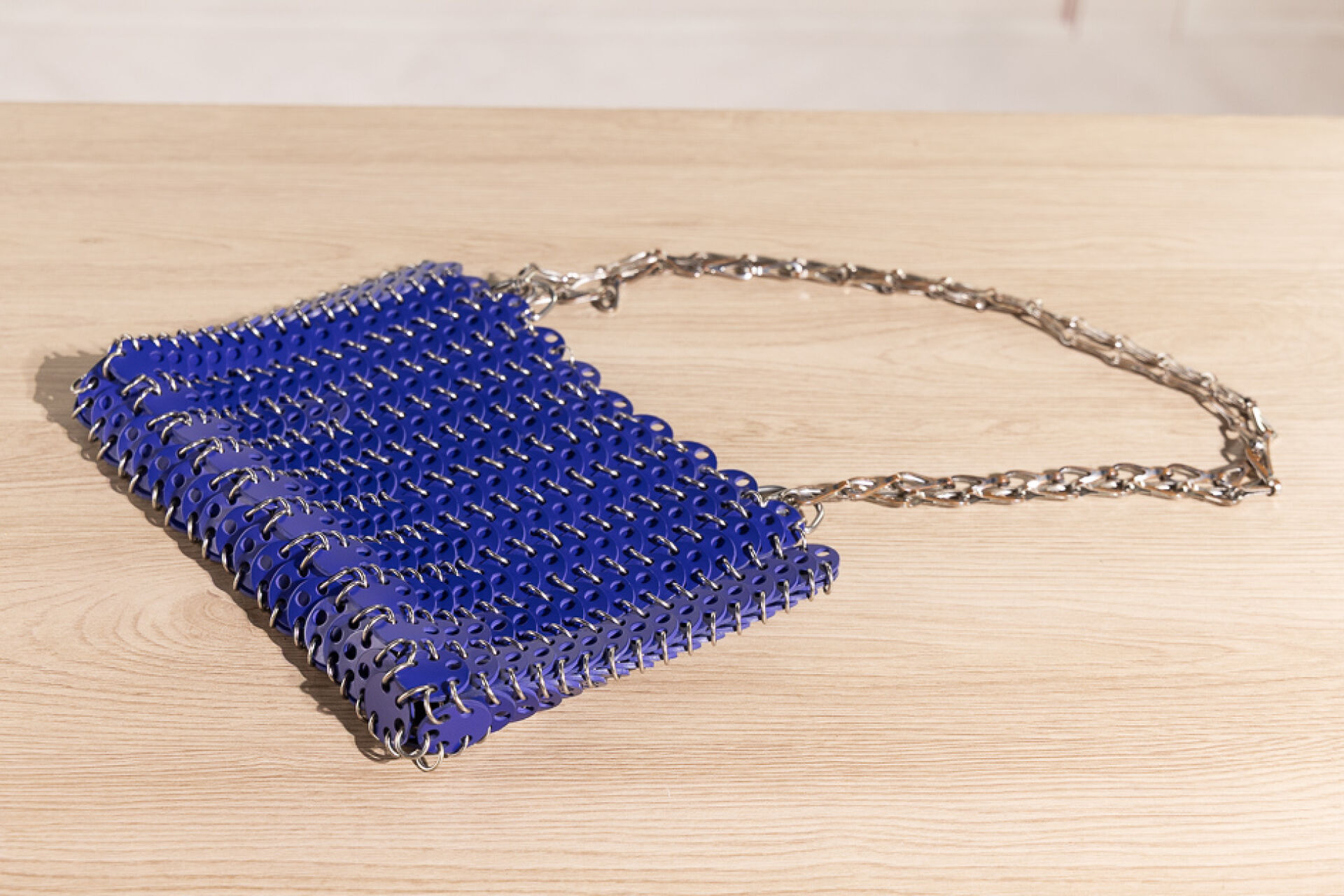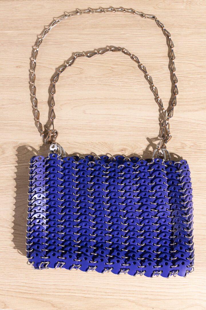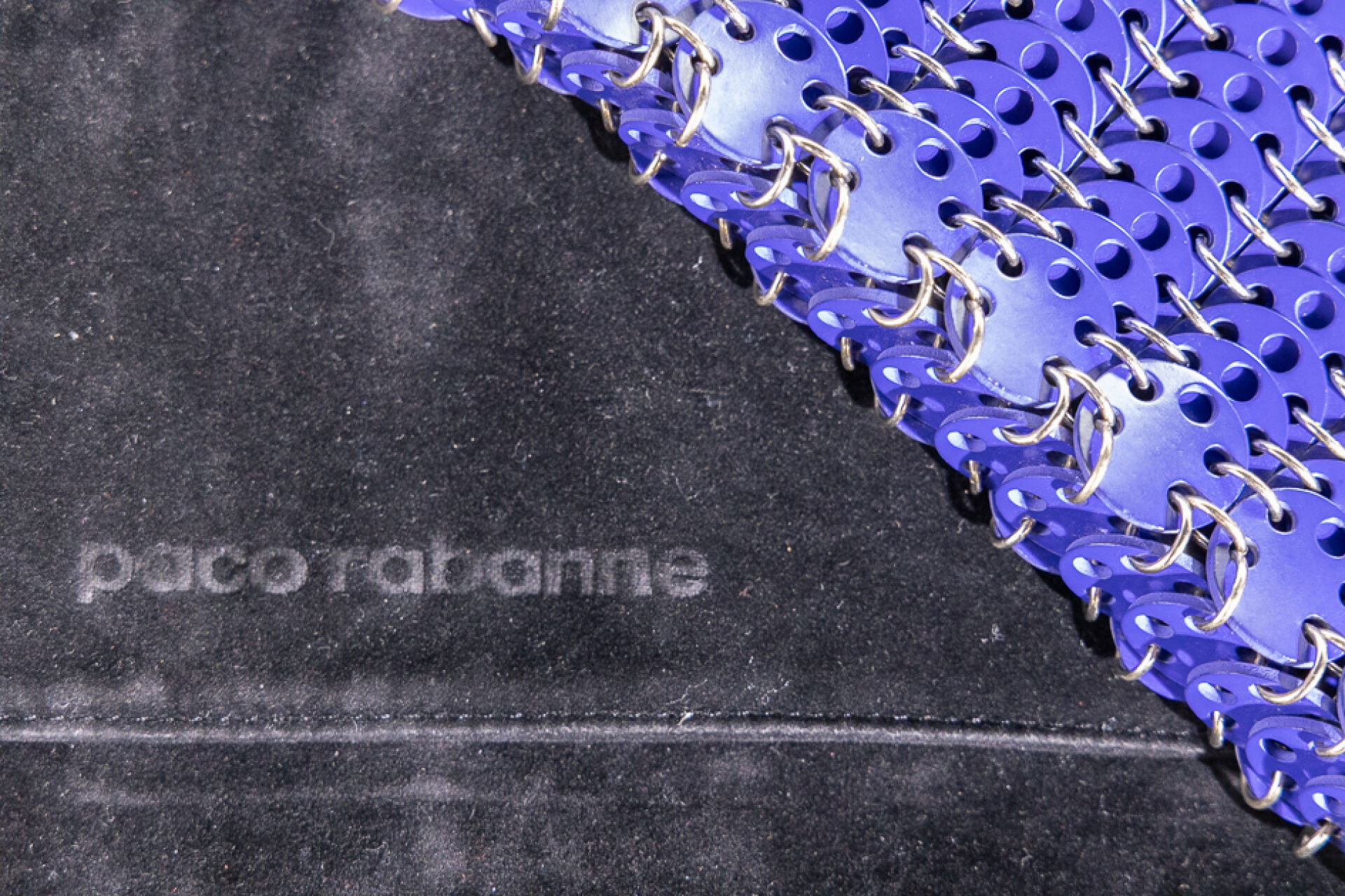 PACO RABANNE - Petit sac constitué de pastilles de cuir bleu lavande perforé rassemblées les unes aux autres par des œillets métalliques, petites anses, chaine transformable, signé gravé sur plaque, pochette en velours noir. Haut. : 14 cm - Long. : 23 cm Désargenté, quelques traces