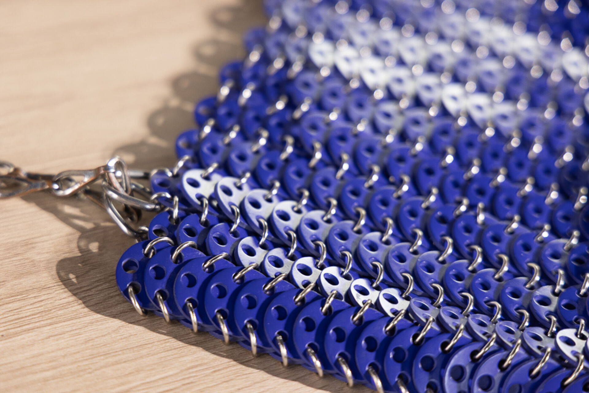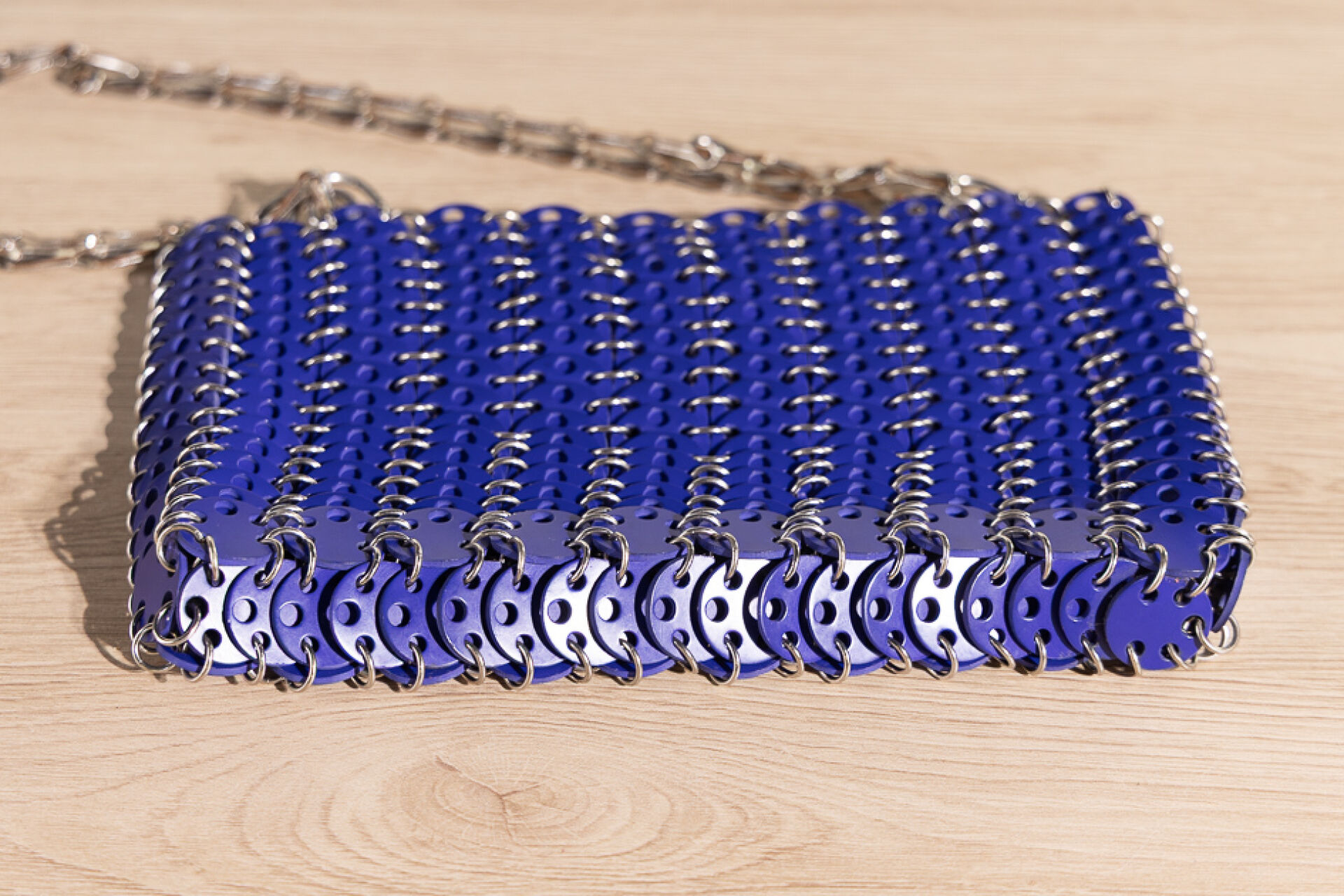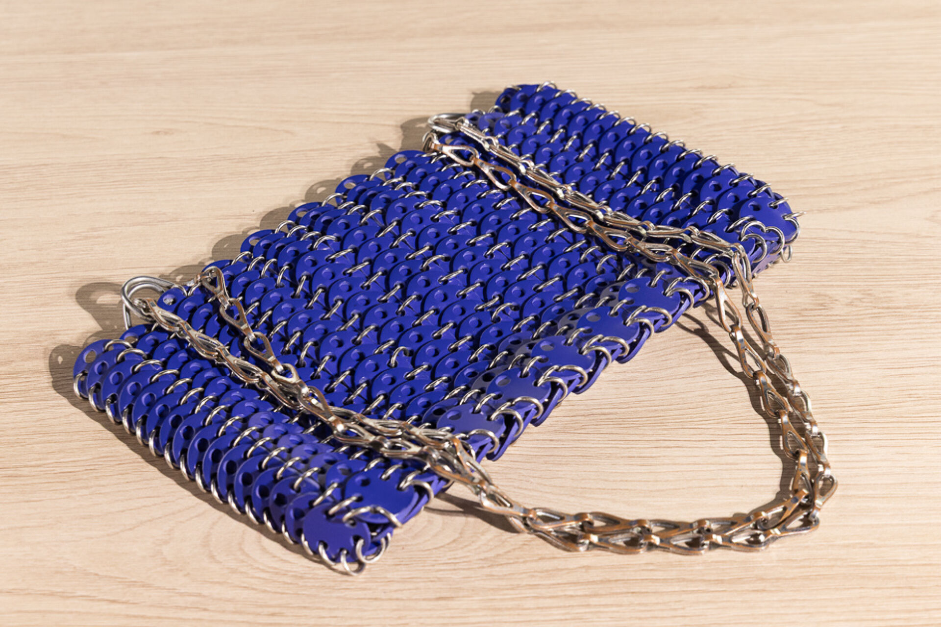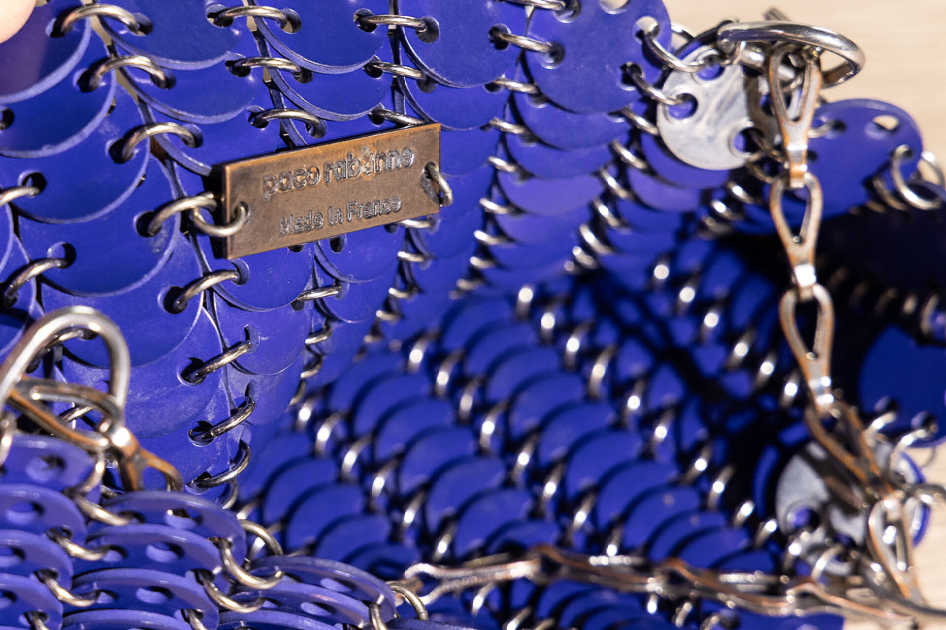 PACO RABANNE - Petit sac constitué de pastilles de cuir bleu lavande perforé rassemblées les unes aux autres par des œillets métalliques, petites anses, chaine transformable, signé gravé sur plaque, pochette en velours noir. Haut. : 14 cm - Long. : 23 cm Désargenté, quelques traces