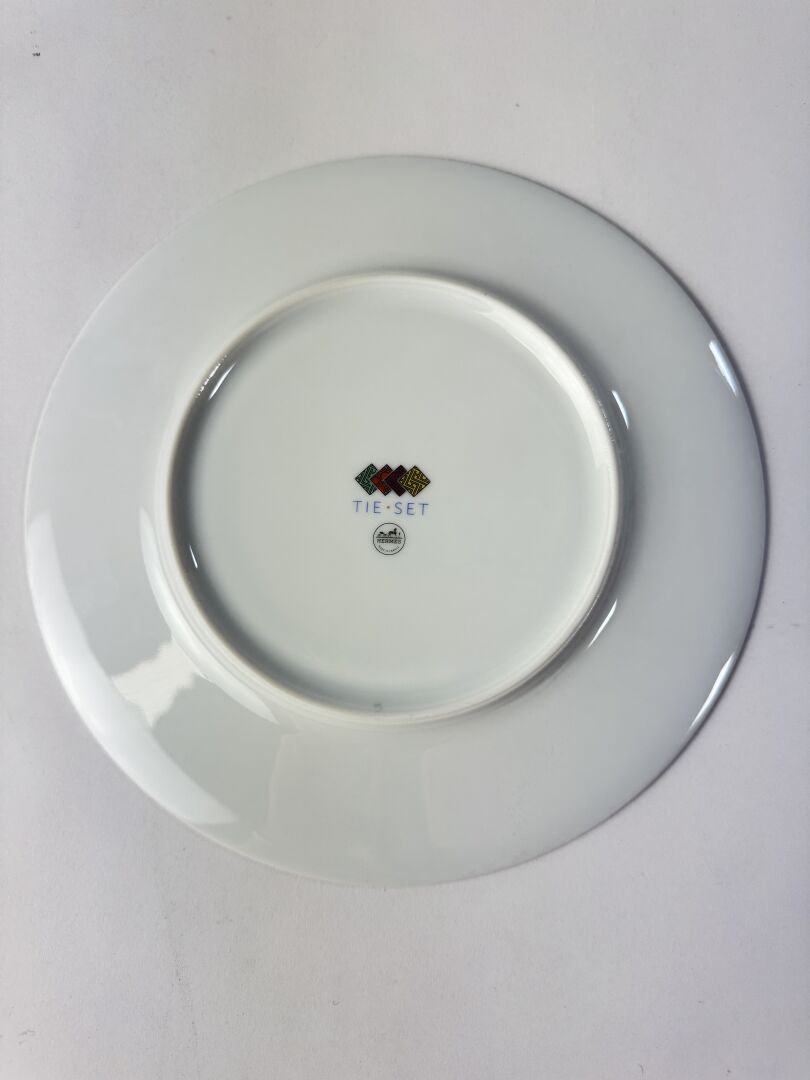 HERMES - Une assiette à dessert en porcelaine ligne « Tie Set », blanche et frises bleu/bordeaux. Sans boite. Diamètre : 21,5 cm Très bon état