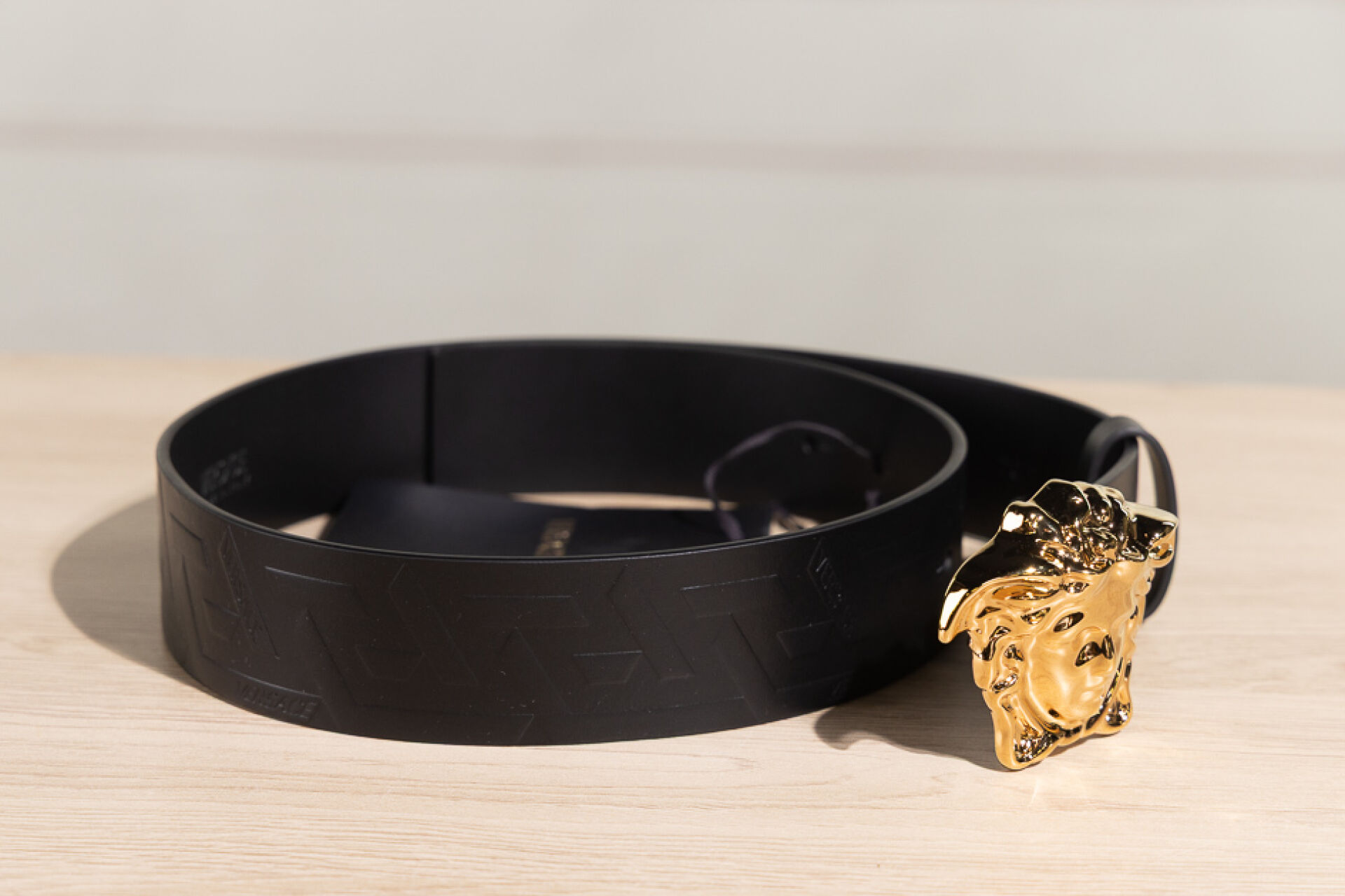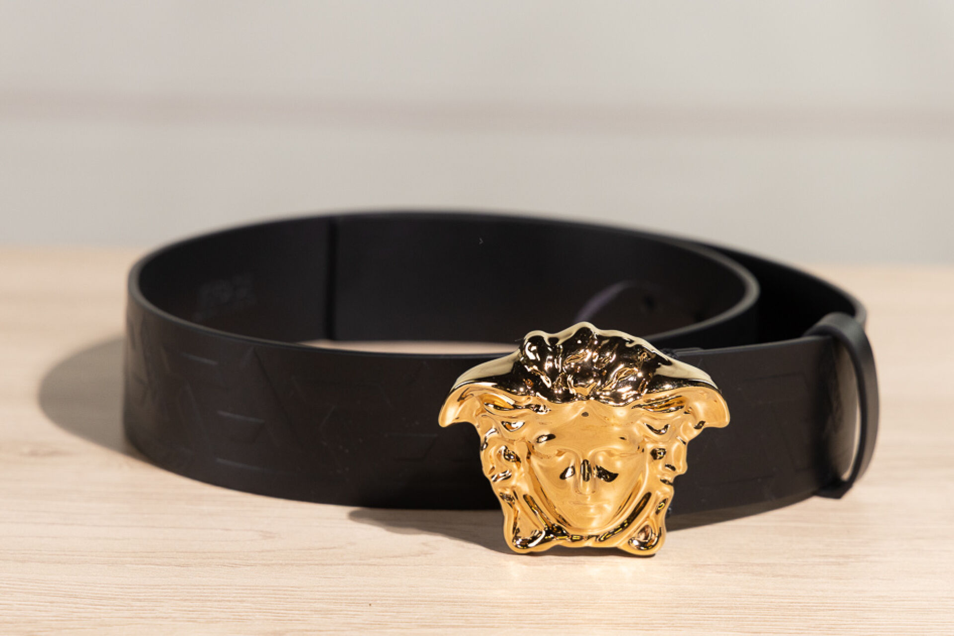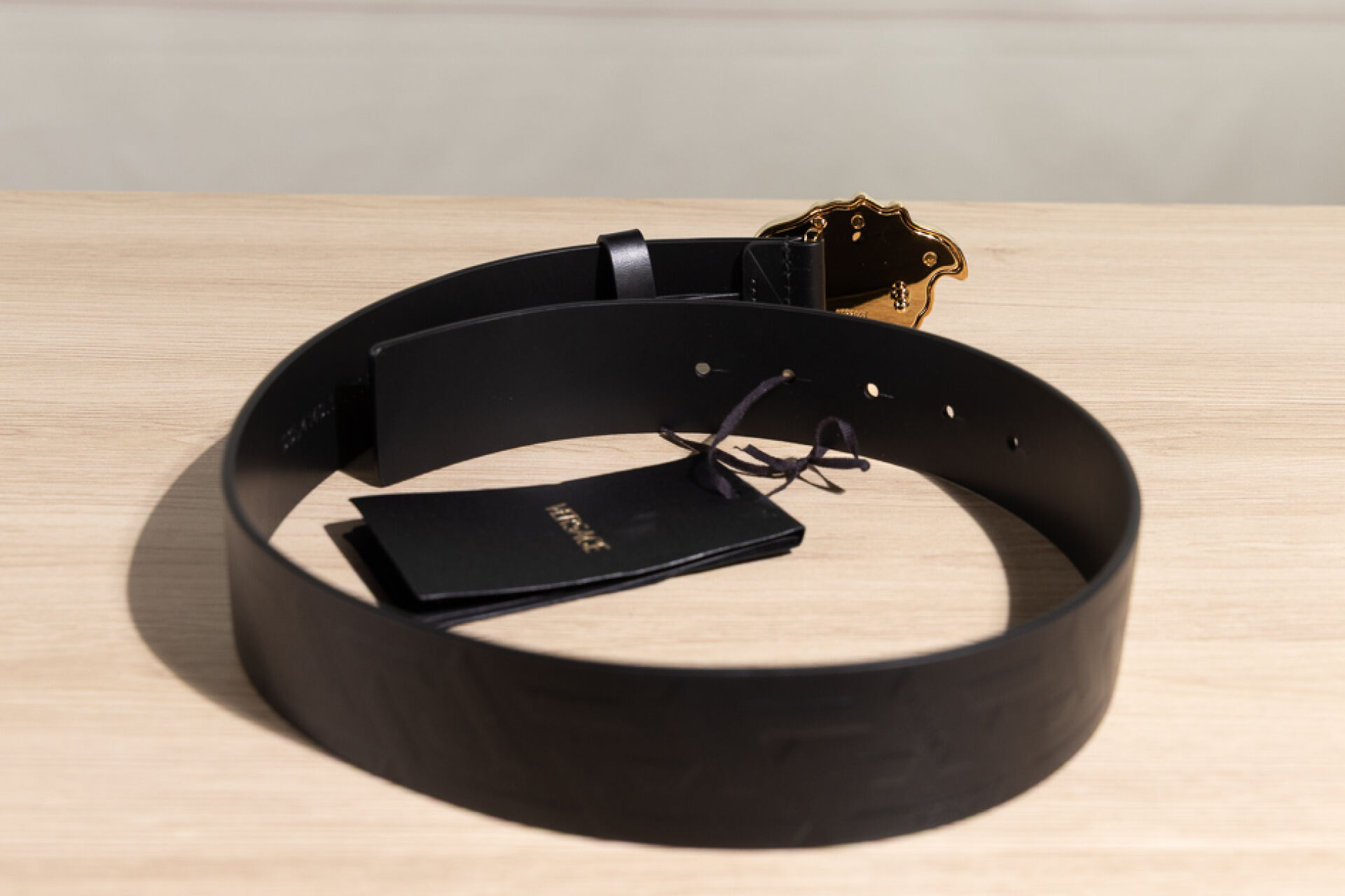 VERSACE - Ceinture en cuir noir à boucle Médusa en métal doré. Taille indiquée 70 Non portée