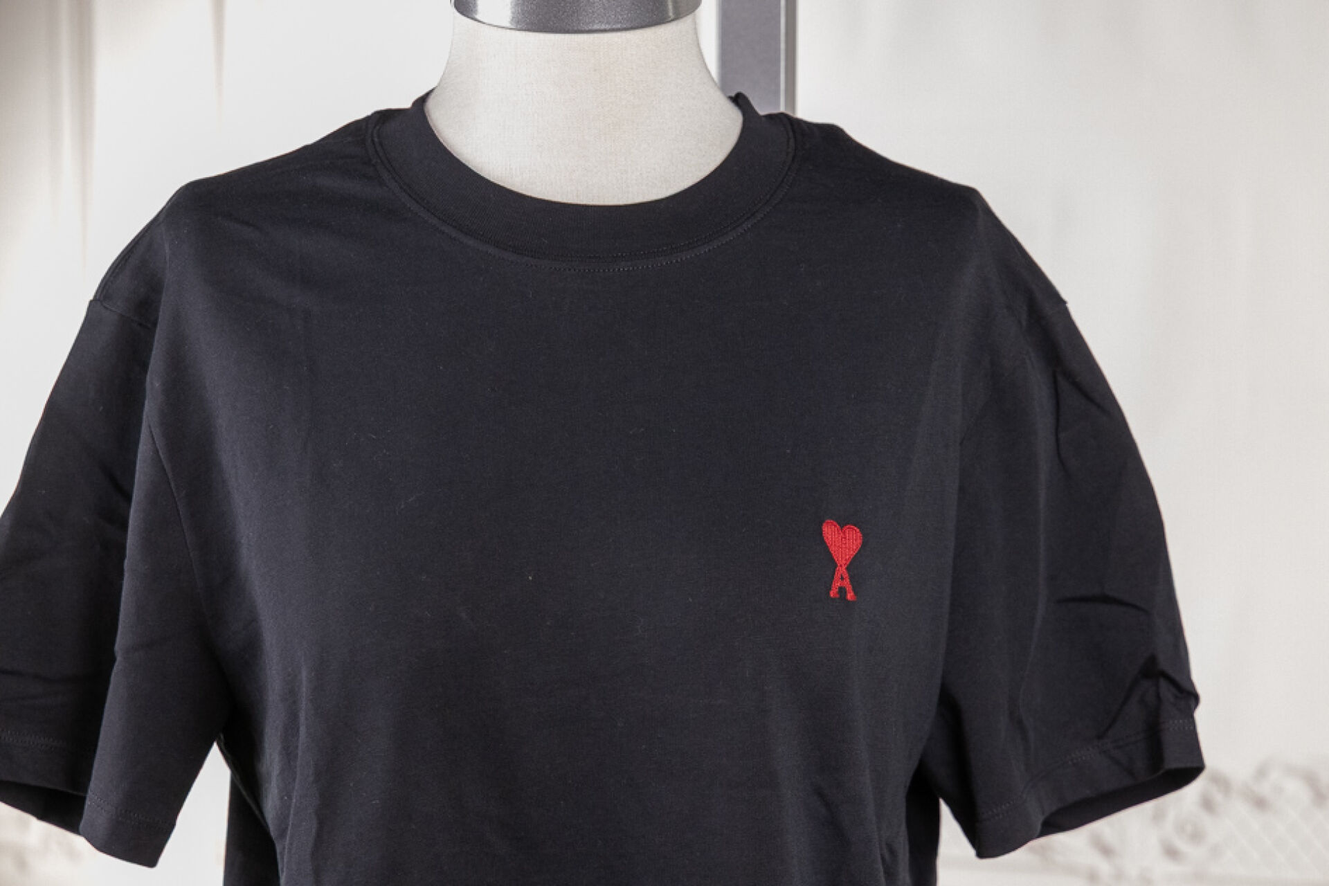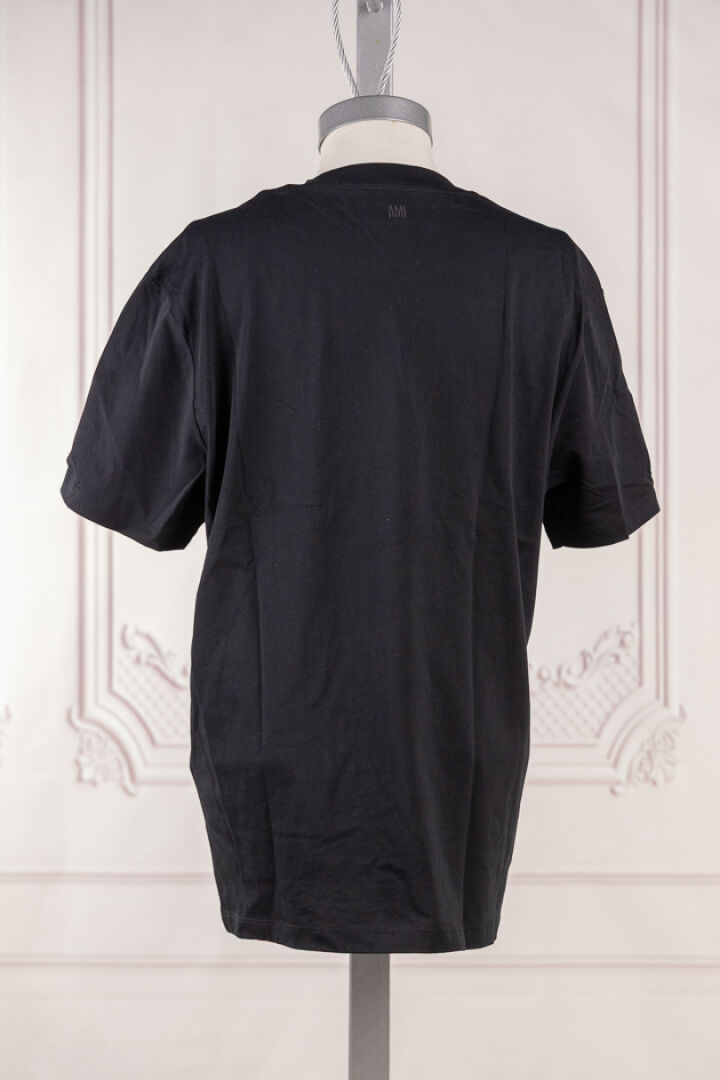 AMI par ALEXANDRE MATTIUSSI - T-shirt à col rond en coton noir, manches courtes, rebrodé du A au cœur rouge. Taille indiquée M