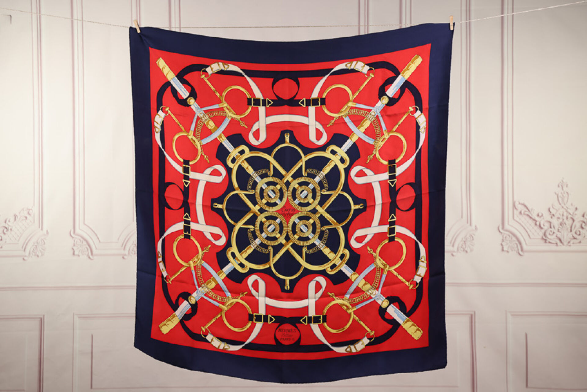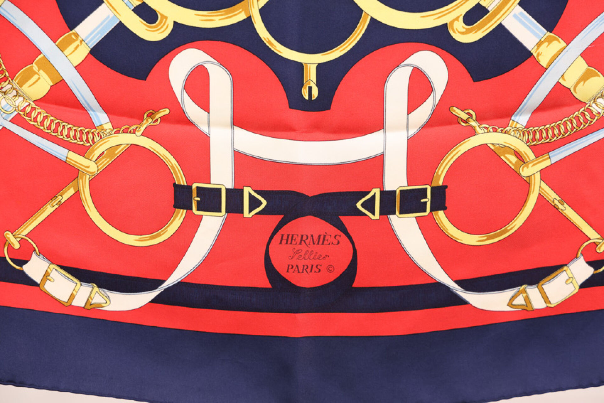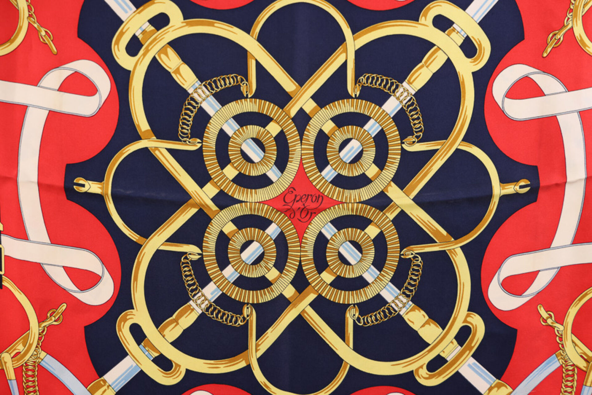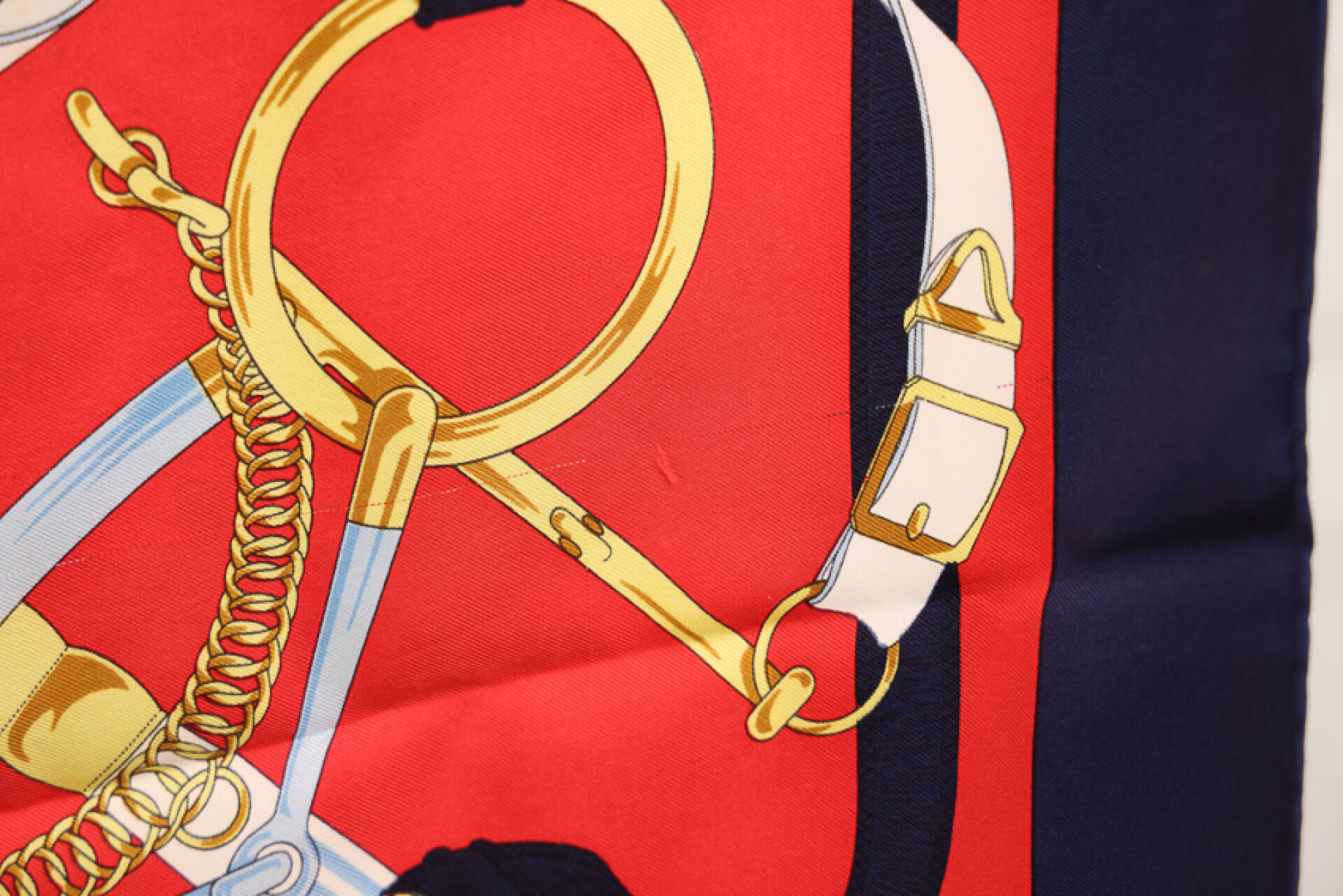 HERMES Paris - Carré en twill de soie imprimé titré "Éperon d'Or", à dominante marine, rouge, doré, signé Henri d'Origny. Quelques traces, petites taches, fils tirés