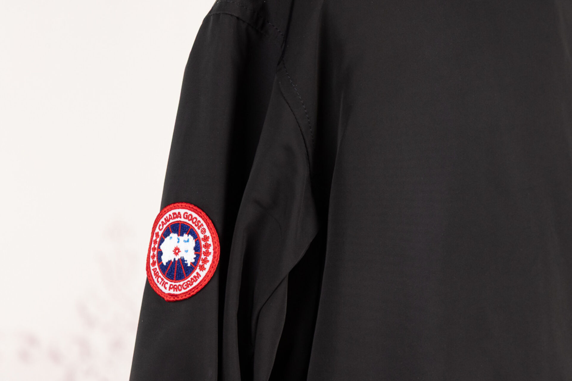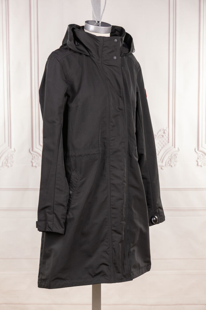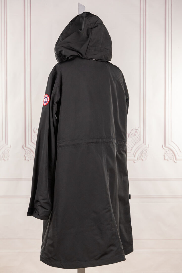 CANADA GOOSE - Parka 7/8 noire à capuche coulissée, fermeture à glissière sous patte à pression, deux poches en biais également à pression, taille coulissable par l'intérieur, manches longues. Taille indiquée L Non portée, étiquette d'origine